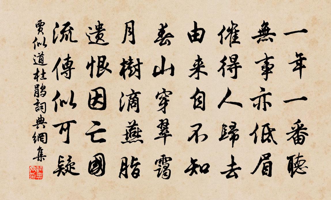 詩詞名句歷史字典書法欣賞書法字典國語詞典說文解字康熙字典古漢語字典標 題 作 者 詩 句 杜鵑作者:賈似道 朝代:宋代杜鵑原文一年一番聽,無事亦低眉。催得人歸去,由來自不知。春山穿翠靄,月樹滴燕脂。遺恨因亡國,流傳似可疑。詩詞問答問:杜鵑的作者是誰?答:賈似道問:杜鵑寫於哪個朝代?答:宋代賈似道杜鵑書法欣賞杜鵑書法作品詩詞推薦山寺陸游〔宋代〕籃輿送客過江村,小寺無人半掩門。古佛負牆塵漠漠,孤燈照殿雨昏昏。喜投襌榻聊尋夢,嬾為啼猿更斷魂。要識邑癢杏壇初成諸老倡和見寄因次韻何夢桂〔宋代〕雙杏壇前花自春,登壇宛見仲尼心。千年此樹幾寒暑,一線生機無古今。西狩事非成反袂,緇林曲在尚鳴琴。閒花鼓樓舖醉歌陸游〔宋代〕書生迫饑寒,一飽輕三巴。三巴未雲已,北首趨褒斜。匆匆出門去,裘馬不復華。短帽障赤日,烈風吹黃沙。俶裝彭城行文天祥〔宋代〕連山四圍合,呂梁貫其中。河南大都會,故有項王宮。晉牧連楊豫,虎視北方雄。唐時燕子樓,風流張建封。西望采荔二絕劉克莊〔宋代〕思蓴羹鼓辭京洛,為海棠花客劍川。帝憫後村翁老病,即家除拜荔枝仙。總宜園董嗣杲〔宋代〕望極湖變幻奇秒,萬千光景自紛披。妙分西子爭妍態,絕想東坡得句時。柳徑曲埋兜率寺,花陰直接放生池。內官記夢陸游〔宋代〕西岩老宿雪垂肩,白石為糧四百年。喜我未忘山下路,殷懃握手一欣然。慧心近空心王梵志〔唐代〕慧心近空心,非關髑髏[1]孔。對面說不識,饒你母信董。致酒行李賀〔唐代〕零落棲遲一杯酒,主人奉觴客長壽。主父西遊困不歸,家人折斷門前柳。吾聞馬周昔作新豐客,天荒地老無人識。桂花爛熳一夕敗於風雨呼僮落英以供香事戲作羅與之〔宋代〕小山涼風高,秋意饒庭砌。江南山水秀,鍾此數叢桂。亭亭蒼虯蟠,磊磊傑玉綴。薰染風露香,擺脫脂粉媚。芙蓉東城被盜得世字秦觀〔宋代〕野人無機心,觸事少防衛。所至輒酣寢,屢墮穿窬計。孤亭夜深墨,風死雨初霽。有盜穴壁來,攘取逮衾袂。微思汝南江鄰幾雲鄎南並淮浮光山有張隱枯種松檜梅堯臣〔宋代〕峨峨淮山上,中有隱者棲。不知松檜下,但見虎豹蹊。人群固已遠,樵客入猶迷。且奉子蘭養,應無抱玉啼。麻田和永叔小飲懷同州江十學士韓維〔宋代〕翰林文章伯,好古名一世。家無金璧儲,所寶書與器。北堂冬日明,有朋聯騎至。新樽布几案,二鼎屹先置。大鼎銅螭署馬之純〔宋代〕洛陽當日鑄銅螭,徒得形模怪且奇。玉刺口中藏不見,蟲居腹內出無時。移來建業尚如此,徒在江陵無復茲。此說送杜侍御純陝西轉運陳師道〔宋代〕饋糧千里古無策,木牛流馬功不極。邊頭數米換黃金,將軍汗馬未伏櫪。黠羌人面作胡語,鳥雀貪生爾如許。熊虎送瞿生還拜親晏殊〔宋代〕門標楊氏闕,家有漢皇書。射策淹前志,鳴榔省舊居。仙山人罕到,幽境畫難如。雲竇開賓館,芝田足歲儲。修詞過松江寄務觀五首韓元吉〔宋代〕四海習鑿齒,雲間陸士龍。酒狂須一石,文好自三冬。風水客愁遠,煙花春事濃。還將枕流耳,來聽景陽鍾。和陶歸園田居六首蘇軾〔宋代〕窮猿既投林,疲馬初解鞅。心空飽新得,境熟夢余想。江鷗漸馴集,蜑叟已還往。南池綠錢生,北嶺紫筍長。提壺還京樂(黃鐘商友人泛湖,命樂工以箏、笙、琵琶、方響迭奏)吳文英〔宋代〕宴蘭漵,促奏絲縈管裂飛繁響。似漢宮人去,夜深獨語,胡沙淒哽。對雁斜玫柱,瓊瓊弄月臨秋影。鳳吹遠,河漢錢塘春感六首王逢〔元代〕周南風俗漢衣冠,五色雲中憶駐鑾。瓔珞檜高藏白獸,蕊珠花發降文鸞。河通織女機絲濕,雨歇巫娥翠黛寒。滿地名句推薦恭敬不如從命。曹雪芹《紅樓夢·第六十二回》 父母威嚴而有慈,則子女畏慎而生孝矣。顏之推《顏氏家訓·教子篇》 父之讎,弗與共戴天。兄弟之讎不反兵。交遊之讎不同國。戴聖《禮記·曲禮上》 鳧脛雖短,續之則憂;鶴脛雖長,斷之則悲。莊子《莊子·外篇·駢拇》 望處雨收雲斷,憑闌悄悄,目送秋光。柳永《玉蝴蝶·望處雨收雲斷》 昨夢西湖,老扁舟身世。吳文英《拜星月慢·林鐘羽姜石帚以盆蓮數十置中庭宴客其中》 推手遽止之,濕衣淚滂滂韓愈《聽穎師彈琴》 仙苑春濃,小桃開,枝枝已堪攀折。阮逸女《花心動·春詞》 君子養心莫善於誠荀子《荀子·不苟》 乍見翻疑夢,相悲各問年。司空曙《雲陽館與韓紳宿別》