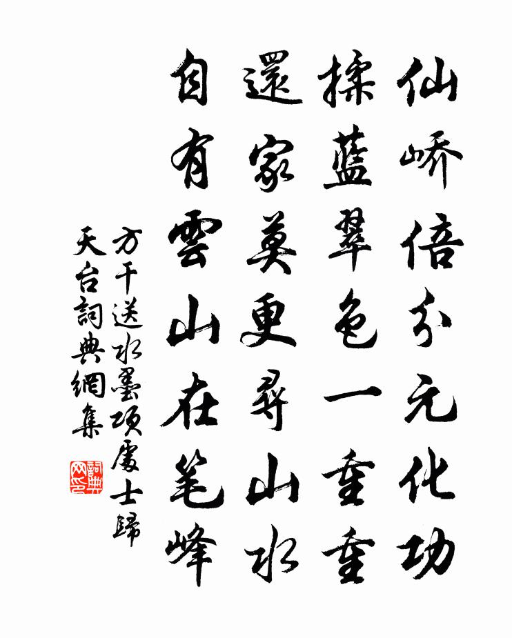 詩詞名句歷史字典書法欣賞書法字典國語詞典說文解字康熙字典古漢語字典標 題 作 者 詩 句 送水墨項處士歸天台作者:方乾 朝代:唐代送水墨項處士歸天台原文仙嶠倍分元化功,揉藍翠色一重重。還家莫更尋山水,自有雲山在筆峰。詩詞問答問:送水墨項處士歸天台的作者是誰?答:方乾問:送水墨項處士歸天台寫於哪個朝代?答:唐代問:送水墨項處士歸天台是什麼體裁?答:七絕方乾送水墨項處士歸天台書法欣賞送水墨項處士歸天台書法作品注釋全唐詩:卷653-31詩詞推薦賀知章徐鈞〔宋代〕身外生涯總是虛,狂游一夢入清都。有家不住猶為觀,底用區區覓鑑湖。爇心香 善惡報馬鈺〔元代〕造惡之人,兇橫無過。細尋思、最易奈何。生遭官法,死見閻羅。向獄兒囚,碓兒搗,*兒磨。積善之人,恭順謙一翁釋紹曇〔宋代〕獨立坤維老作家,心無二用裂千差。自從行道威音外,見著拈樁幾度花。木犀初發呈張功父又和六首楊萬里〔宋代〕端能小脫簿書林,招喚詩流卜夜深。老我愁隤半山玉,憑君淺酌一荷金。水邊賞桂秋圍坐,雨後摘蔬香滿砧。乘醉送當上人歸四明釋行海〔宋代〕數載相隨見子情,今朝難使別離輕。此心恰似寒潮水,直送征帆到四明。秋晚雜書三十首方回〔宋代〕思詩夜無寐,佳句招不來。不思忽有得,清晨視空階。昨日所未有,紅葉初可枚。小雨過庭菊,一夕粲然開。飢雀滿江紅(劉守解任)佚名〔宋代〕歸去來兮,要待足、何時是足。榮對辱、飲河鼴鼠,無過滿腹。浴月朝霞紅賽錦,排雲晚岫青如玉。更修筠、與合晞陽軒李彌遜〔宋代〕山高竹柏陰,得之近亭午。茲軒揖朝暾,精色快先睹。濛濛勒花春,十月九風雨。羲和為反旆,照我衣上縷。眩然勾踐滅吳佚名〔先秦〕越王勾踐棲於會稽之上,乃號令於三軍曰:“凡我父兄昆弟及國子姓,有能助寡人謀而退吳者,吾與之共知越國之頌古九首釋普信〔宋代〕大用縱橫掣電機,爍迦羅眼尚膠黐。迷途夢裡爭唇吻,卻憶隨他去一回。公劉佚名〔先秦〕篤公劉,匪居匪康。乃埸乃疆,乃積乃倉;乃裹餱糧,於橐於囊。思輯用光,弓矢斯張;干戈戚揚,爰方啟行。篤寒食懷西湖去歲游從李洪〔宋代〕去年寒食醉西湖,山色空濛暮有無。風急落花隨步積,雨昏垂柳要人扶。偶攜勝友尋泉石,俱有新詩入畫圖。越絕偈頌九十三首釋梵琮〔宋代〕仙居多異草,聖地絕凡蹤。秋風動鱗甲,生蛇化活龍。蕪湖感舊陳造〔宋代〕下帆同烏棲,掛帆逐雞起。但見蕪湖月,耿夜清如水。江左此壯縣,我昔舟屢艤。諸公各敬客,款曲豈今比。酒杯送趙靈秀赴筠州幕予亦將之湖外徐璣〔宋代〕郡以竹為名,因如此地清。溪來城下綠,山到市邊平。入幕非無客,能文必有聲。江湖共遊宦,相望若為情。游嶽麓寺三首張嵲〔宋代〕平生耳里湘西寺,此日真成叩梵宮。地闢晉朝多勝概,人師支遁有高風。身游大士毗耶境,目盡湘東返照中。佳處勸學示子元夫姚勉〔宋代〕事業功名在讀書,聖賢妙處著工夫。區區只為潭潭府,不敢如韓訓阿符。懷悟書胡仲弓〔宋代〕秋雁俗離群,懷人幾夜分。吟法半窗月,坐斷兩山雲。旛影無心動,鐘聲出定聞。林間謀隱者,修潔莫如君。奉和御製玉清昭應宮天書閣瑞應夏竦〔宋代〕盛德靈謀協,元符實字披。真宮肇高閣,精意感鴻禧。曉箭傳初刻,朝陽吐半規。祥煙五色麗,嘉氣九華滋。泛灩江樓寄希元上人范仲淹〔宋代〕清言一以遙,默默江樓上。安得如白雲,無心兩相忘。名句推薦人情已厭南中苦,鴻雁那從北地來。王勃《蜀中九日 / 九日登高》 莎衫筠笠。正是村村農務急。盧炳《減字木蘭花·莎衫筠笠》 魂來楓葉青,魂返關塞蒙杜甫《夢李白二首·其一》 凡戰,所謂攻者,知彼者也。佚名《百戰奇略·第四卷·攻戰》 欲將輕騎逐,大雪滿弓刀。盧綸《和張僕射塞下曲·其三》 窮且益堅,不墜青雲之志。王勃《滕王閣序》 春秋多佳日,登高賦新詩。陶淵明《移居二首》 砧面瑩,杵聲齊。搗就征衣淚墨題。賀鑄《杵聲齊·砧面瑩》 遠水不救近火。韓非及後人《韓非子·說林上》 未有知而不行者。王陽明《傳習錄·卷上·徐愛錄》