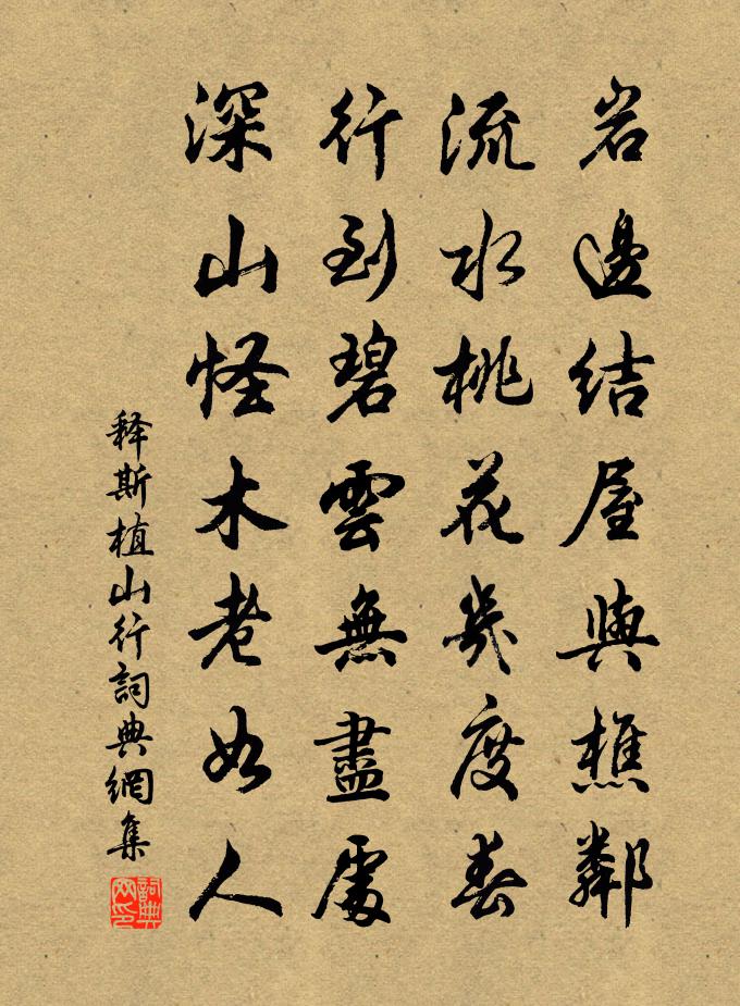 詩詞名句歷史字典書法欣賞書法字典國語詞典說文解字康熙字典古漢語字典標 題 作 者 詩 句 山行作者:釋斯植 朝代:宋代山行原文岩邊結屋與樵鄰,流水桃花幾度春。行到碧雲無盡處,深山怪木老如人。詩詞問答問:山行的作者是誰?答:釋斯植問:山行寫於哪個朝代?答:宋代釋斯植山行書法欣賞山行書法作品詩詞推薦古樂府釋斯植〔宋代〕欲買采菱船,野水無人識。野水去不回,迢迢暮山碧。關邑簿李大用任滿陳著〔宋代〕彩旗蔽野南風香,歡門遮馬東路長。黃童白叟百拜酒,鸞棲主人今日行。憶昔焦氛漲天赤,手挽龍津力輸滌。簿領狼煙薛逢〔唐代〕三道狼煙過磧來,受降城上探旗開。傳聲卻報邊無事,自是官軍入抄回。西京守歲駱賓王〔唐代〕閒居寡言宴,獨坐慘風塵。忽見嚴冬盡,方知列宿春。夜將寒色去,年共曉光新。耿耿他鄉夕,無由展舊親。詩陸雲〔魏晉〕綠房含青實。金條懸白璆。俯仰隨風傾。煒煒照清流。挽李教授王義山〔宋代〕偏是書生賦分慳,生平受用只儒酸。非無熱處可炙手,禁得寒時做冷官。乃父向年已科目,好兒今日又衣冠。期頤題授陽鎮路崔塗〔唐代〕越鳥巢邊溪路斷,秦人耕處洞門開。小桃花發春風起,千里江山一夢回。九日巴丘楊公台上宴集李群玉〔唐代〕淒淒霜日上高台,水國秋深客思哀。萬疊銀山寒浪起,一行斜字早鴻來。誰家搗練孤城暮,何處題衣遠信回。江漢偈頌七十六首釋子益〔宋代〕信手拈來,萬選萬中。輕若鴻毛輕,重似丘山重。雖是死蛇,也要活弄。閒坐憶樂天以詩問酒熟未劉禹錫〔唐代〕案頭開縹帙,肘後檢青囊。唯有達生理,應無治老方。減書存眼力,省事養心王。君酒何時熟,相攜入醉鄉。哭鄆州孔給事祖無擇〔宋代〕聖孫家世嗣衣纓,夫子當朝有令名。許國志堅存亮直,致君心切贊隆平。明庭抗疏忠言在,列郡班條惠化行。不享文安國輓詞二首黃庭堅〔宋代〕平生翰墨學,空走使臣車。瞿令能蒼史,歸公好古書。秦山刊日月,周鼓頌畋漁。不見龍蛇筆,新乾研滴蜍。槎吳融〔唐代〕浪痕龍跡老欹危,流落何時別故枝。歲月空教苔蘚積,芳菲長倩薜蘿知。有文在朽人難識,無蠹藏心鳥莫窺。家近如夢令程垓〔宋代〕風入藕花翻動。夜氣與香俱縱。月又帶風來,涼意一襟誰共。情重。情重。可惜短宵無夢。次嚴陵方岳〔宋代〕二月寒如此,楊花不受春。路生尋店早,家近夢歸頻。白鳥無塵事,青山自故人。幾時茅屋下,卜與爾為鄰。和孫倅見貽八首曹勛〔宋代〕爝火寧知日月光,遽聞騎火犯伊涼。周宣懋建中興政,上帝潛符至治香。天欲卦爻重彖象,民知瓜瓞本綿長。商孫舟中曾幾〔宋代〕灘聲送我入嚴州,過得州來水漫流。一夜好風潮信早,滿船明月荻花秋。郡中即事書懷楊億〔宋代〕海隅為郡真卑屑,簿領沉迷箠楚喧。王事更逾星火急,吏曹何啻米鹽煩。甘棠聽訟曾無倦,丹筆書刑幸不冤。境上句薛舜俞〔宋代〕軒窗眼界開。十一月二十二日朝辭李復〔宋代〕朝辭承明殿,暮下金馬門。伏讀明詔意,仰思聖主恩。蠢彼獯鬻氏,禮數乃弟昆。帝初為息民,繒帛代更屯。嗣皇名句推薦青綾被,莫憶金閨故步晁補之《摸魚兒·東皋寓居》 白日何短短,百年苦易滿。李白《短歌行》 語言多矯飾,則人品心術,盡屬可疑。王永彬《圍爐夜話·第四十則》 布穀飛飛勸早耕,舂鋤撲撲趁春睛。姚鼐《山行·布穀飛飛勸早耕》 知君獨坐青軒下,此時結念同所懷。李白《早秋單父南樓酬竇公衡》 日光下澈,影布石上,佁然不動;柳宗元《小石潭記》 將壇醇酒冰漿細,元夜邀賓燈火新。趙時春《元宵飲陶總戎家二首》 晨起動征鐸,客行悲故鄉。溫庭筠《商山早行》 江碧鳥逾白,山青花欲燃。杜甫《絕句二首》 雨雪自飛千嶂外,榆林只隔數峰西。朱彝尊《出居庸關》