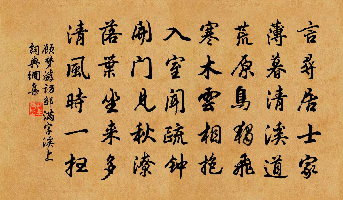詩詞名句歷史字典書法欣賞書法字典國語詞典說文解字康熙字典古漢語字典標 題 作 者 詩 句 訪鄒滿字溪上作者:顧夢遊 朝代:清代訪鄒滿字溪上原文言尋居士家,薄暮清溪道。荒原鳥獨飛,寒木雲相抱。入室聞疏鍾,開門見秋潦。落葉坐來多,清風時一掃。詩詞問答問:訪鄒滿字溪上的作者是誰?答:顧夢遊問:訪鄒滿字溪上寫於哪個朝代?答:清代問:訪鄒滿字溪上是什麼體裁?答:五律顧夢遊訪鄒滿字溪上書法欣賞訪鄒滿字溪上書法作品詩詞推薦題薌氏慈節卷羅珊〔宋代〕子甫七齡夫蚤世,獨將慈節鑄心肝。含暉寸草流光遠,天矢孤闈正氣寒。苦味燈前余粉膽,清風塵外振衿鞶。悠悠資聖寺送甘二王維〔唐代〕浮生信如寄。薄宦夫何有。來往本無歸。別離方此(一作正)受。柳色藹春余。槐陰清夏首。不覺御溝上。銜悲執村居書事陸游〔宋代〕文辭苦思徒妨睡,官職虛名不療飢。垂老始知安樂法,紙鳶竹馬伴兒嬉。寄杭州靈隱寺宋震使君貫休〔唐代〕罷郡歸侵夏,仍聞靈隱居。僧房謝朓語,寺額葛洪書。月樹獮猴睡,山池菡萏疏。吾皇愛清靜,莫便結吾廬。和人促織王令〔宋代〕秋蟲何爾亦匆匆,何處人心與爾同。夢枕幾年懸客淚,曉窗殘月破西風。人思絕漠冰霜早,婦嘆窮閻杼柚空。更有到四安陳著〔宋代〕雨中行數日,今日得新晴。山到浙閒秀,船從海上行。市腥逢海錯,人語帶京聲。此去總佳景,坡仙曾細評。送李十四山東遊(一作山人東遊)韋應物〔唐代〕聖朝有遺逸,披膽謁至尊。豈是貿榮寵,誓將救元元。權豪非所便,書奏寢禁門。高歌長安酒,忠憤不可吞。欻來句陳延〔宋代〕水泛榴花來洞口,鹿迎樵客到仙家。和子厚弟九日登魏文振亭園七首王之道〔宋代〕一龕燈火夜淒清,壁下秋蟲斷續聲。細把新詩等風味,易牙元不亂淄澠。句歐陽澥〔唐代〕 * 離家十四年。離家已是夢松年。落日望鄉處,何人知客情?句丁謂〔宋代〕即席椒花頌,延年柏葉觴。大曆二年九月三十日杜甫〔唐代〕為客無時了,悲秋向夕終。瘴餘夔子國,霜薄楚王宮。草敵虛嵐翠,花禁冷葉紅。年年小搖落,不與故園同。挽趙東岩簡叔彥侯四首王邁〔宋代〕已矣東岩不憗遺,年來雅道日陵夷。臞儒得似顏徒幾,良吏能為結輩誰。此老清修如玉悄,當官懇惻念茅茨。可伶遠齋頃寄在湖日所作三詩舟中次韻趙蕃〔宋代〕向來吳楚隔,書札苦難通。信與衢相接,我歸公亦同。寓懷須酒聖,適意豈詩窮。情性思陶冶,吾寧較拙工。閒行白居易〔唐代〕五十年來思慮熟,忙人應未勝閒人。林園傲逸真成貴,衣食單疏不是貧。專掌圖書無過地,遍尋山水自由身。倘年春興陳師道〔宋代〕東風作惡不成寒,野水穿沙自作灘。細草無端留客臥,繁枝有意待人看。傅推官勸農七絕句擬和其五山家鄭剛中〔宋代〕蓬蒿深處有人家,戶外蛛絲綱露華。數樹芭焦乾未得,長官親自見生涯。望靈壽致拜祖塋韓元吉〔宋代〕白馬岡前眼漸開,黃龍府外首空回。殷勤父才紹相識,只問天兵早晚來。赴元老劉園之集呈十二朝請十五推官二叔父兼晁補之〔宋代〕故鄉等作異鄉愁,常笑吾生不自謀。百日狂風春草草,十年歸夢客悠悠。倦遊情話陪諸父,老罷親鋤學故侯。得坎失調名佚名〔宋代〕小窗幽幌,獨坐都無侶。名句推薦他人有心,予忖度之。佚名《巧言》 得其所白,不可謂無白;得其所堅,不可謂無堅。公孫龍《公孫龍子·堅白論》 還作江南會,翻疑夢裡逢。戴叔倫《客夜與故人偶集 / 江鄉故人偶集客舍》 善化不足,惡化有餘。佚名《增廣賢文·上集》 吠犬雜鳴雞,燈火熒熒歸路迷。納蘭性德《南鄉子·秋暮村居》 虎踞龍蟠何處是,只有興亡滿目。辛棄疾《念奴嬌·登建康賞心亭呈史致道留守》 一念開明,反身而誠王陽明《傳習錄·卷中·答陸原靜書》 九日悲秋不到心。鳳城歌管有新音。晏幾道《鷓鴣天·九日悲秋不到心》 浮雲柳絮無根蒂,天地闊遠隨飛揚。韓愈《聽穎師彈琴》 事君數,斯辱矣;朋友數,斯疏矣。孔子弟子《論語·里仁篇》