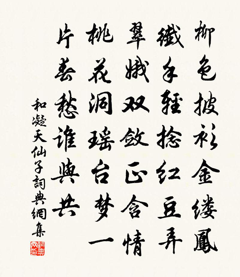 詩詞名句歷史字典書法欣賞書法字典國語詞典說文解字康熙字典古漢語字典標 題 作 者 詩 句 天仙子作者:和凝 朝代:唐代天仙子原文柳色披衫金縷鳳,縴手輕捻紅豆弄。翠娥雙斂正含情,桃花洞,瑤台夢,一片春愁誰與共。詩詞問答問:天仙子的作者是誰?答:和凝問:天仙子寫於哪個朝代?答:唐代問:天仙子是什麼體裁?答:詞問:和凝的名句有哪些?答:和凝名句大全和凝天仙子書法欣賞天仙子書法作品注釋柳色:深綠色。金縷風:用金絲繡成的鳳凰圖形。拈(niān 年陰平):用姆指、食指和中指夾。紅豆弄:弄紅豆。弄:玩。翠蛾雙斂:雙眉微皺。翠蛾:代指眼眉。桃花洞:指仙女所居處。瑤台夢:指仙女思凡之夢。瑤台:泛指仙人所居之處。標籤:寫人詩詞推薦採桑子·水亭花上三更月吳文英〔宋代〕水亭花上三更月,扇與人閒。弄影闌乾。玉燕重抽攏墜簪。心期偷卜新蓮子,秋入眉山。翠破紅殘。半簟湘波生曉把酒對月歌唐寅〔明代〕李白前時原有月,惟有李白詩能說。李白如今已仙去,月在青天幾圓缺?今人猶歌李白詩,明月還如李白時;我當紅樓春趣曹雪芹〔清代〕 一語末了, 只聽窗外竹子上一聲響,恰似窗屜子倒了一般,眾人嚇了一跳。丫鬟們出去瞧時,簾外丫鬟嚷道蝶戀花·露下庭柯蟬響歇納蘭性德〔清代〕露下庭柯蟬響歇。紗碧如煙,煙里玲瓏月。並著香肩無可說,櫻桃暗解丁香結。笑卷輕衫魚子纈。試撲流螢,驚起玉門關蓋將軍歌岑參〔唐代〕蓋將軍,真丈夫。行年三十執金吾,身長七尺頗有須。玉門關城迥且孤,黃沙萬裏白草枯。南鄰犬戎北接胡,將軍明妃曲二首·其一王安石〔宋代〕明妃初出漢宮時,淚濕春風鬢腳垂。低徊顧影無顏色,尚得君王不自持。歸來卻怪丹青手,入眼平生幾曾有。意態相和歌辭怨詩二首·其二崔國輔〔唐代〕樓前桃李疏,池上芙蓉落。織錦猶未成,蟲聲入羅幕。韓奕佚名〔先秦〕奕奕梁山,維禹甸之,有倬其道。韓侯受命,王親命之,纘戎祖考,無廢朕命。夙夜匪解,虔共爾位,朕命不易。梁鴻尚節范曄〔宋代〕(梁鴻)家貧而尚節,博覽無不通。而不為章句。學畢,乃牧豕於上林苑中,曾誤遺火,延及他舍。鴻乃尋訪燒者嫦娥李商隱〔唐代〕雲母屏風燭影深,長河漸落曉星沉。嫦娥應悔偷靈藥,碧海青天夜夜心。贈道者(一作贈送)武元衡〔唐代〕 * 如雪一枝梅,笑掩微妝入夢來。若到越溪逢越女,紅蓮池裡白蓮開。宮娃歌李賀〔唐代〕蠟光高懸照紗空,花房夜搗紅守宮。象口吹香毾(登毛)暖,七星掛城聞漏板。寒入罘罳殿影昏,彩鸞簾額著霜痕思佳客 賦半面女髑髏吳文英〔宋代〕釵燕攏雲睡起時。隔牆折得杏花枝。青春半面妝如畫,細雨三更花又飛。輕愛別,舊相知。斷腸青冢幾斜暉。斷紅贈參寥子李白〔唐代〕白鶴飛天書,南荊訪高士。五雲在峴山,果得參寥子。骯髒辭故園,昂藏入君門。天子分玉帛,百官接話言。毫墨誚山中叟施肩吾〔唐代〕老人今年八十幾,口中零落殘牙齒。天陰傴僂帶嗽行,猶向岩前種松子。送渾將軍出塞高適〔唐代〕將軍族貴兵且強,漢家已是渾邪王。子孫相承在朝野,至今部曲燕支下。控弦盡用陰山兒,登陣常騎大宛馬。銀鞍戲題仕女圖吳偉業〔清代〕霸越亡吳計已行,論功何物賞傾城?西施亦有弓藏懼,不獨鴟夷變姓名。 采樵作孟浩然〔唐代〕采樵入深山,山深樹重疊。橋崩臥槎擁,路險垂藤接。日落伴將稀,山風拂蘿衣。長歌負輕策,平野望煙歸。題少府監李丞山池李頎〔唐代〕能向府亭內,置茲山與林。他人驌驦馬,而我薜蘿心。雨止禁門肅,鶯啼官柳深。長廊閟軍器,積水背城陰。窗外估客行 ( 行一作樂 )李白〔唐代〕海客乘天風,將船遠行役。譬如雲中鳥,一去無蹤跡。名句推薦莫見乎隱,莫顯乎微,故君子慎其獨也。子思《禮記·中庸》 合軍聚眾, 務在激氣孫臏《孫臏兵法·延氣》 有過必悛,有不善必懼左丘明《國語·楚語·藍尹亹論吳將斃》 何用慰相思,裁書寄關右。李益《送諸暨王主簿之任》 芰荷迭映蔚,蒲稗相因依。謝靈運《石壁精舍還湖中作》 別裁偽體親風雅,轉益多師是汝師。杜甫《戲為六絕句》 千嬌面、盈盈佇立,無言有淚,斷腸爭忍回顧。柳永《採蓮令·月華收》 崑崙之高有積雪,蓬萊之遠常遺寒。王令《暑旱苦熱》 願將腰下劍,直為斬樓蘭。李白《塞下曲六首》 黃雲萬里動風色,白波九道流雪山。李白《廬山謠寄盧侍御虛舟》