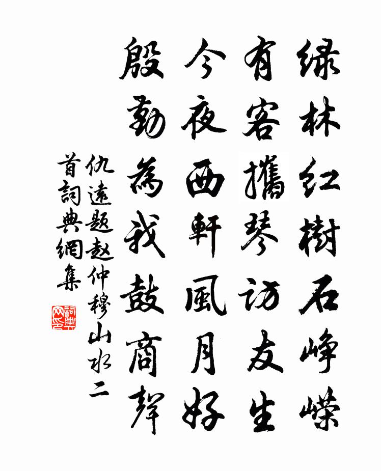 詩詞名句歷史字典書法欣賞書法字典國語詞典說文解字康熙字典古漢語字典標 題 作 者 詩 句 題趙仲穆山水二首作者:仇遠 朝代:宋代題趙仲穆山水二首原文綠林紅樹石崢嶸,有客攜琴訪友生。今夜西軒風月好,殷勤為我鼓商聲。詩詞問答問:題趙仲穆山水二首的作者是誰?答:仇遠問:題趙仲穆山水二首寫於哪個朝代?答:宋代仇遠題趙仲穆山水二首書法欣賞題趙仲穆山水二首書法作品詩詞推薦矮齋雜詠二十首落花華岳〔宋代〕東風吹恨上眉頭,兩岸桃花瞰碧流。一片紅雲飛不起,斷霞殘照落汀洲。楊柳枝皇甫松〔唐代〕爛熳春歸水國時,吳王宮殿柳絲垂。黃鶯長叫空閨畔,西子無因更得知。滿江紅(建安戲用林碧山韻)劉將孫〔宋代〕正好花時,忽辦得、匆匆來去。道一往無情,卻又別顰愁嫵。四海雲鬟高樣髻,長思紅袖□分路。怪近來、不怨客過江陵和黃虛舟韻四首李曾伯〔宋代〕詩從雙井來,太史氏復作。一葦天地旋,玄酒滋味薄。有田付鴒原,比屋賴虎幄。卻笑草玄池,投閣嗟寂寞。贈楊左司三首趙蕃〔宋代〕有來聞說上封章,造膝言之外敢昌。但見詔除頻寵渥,是知明聖識忠良。都司萬事無不理,一語九州當致康。況此偈頌一百零二首釋慧遠〔宋代〕古聖伽藍,一切成見。未跨三門,先跨三門,先見佛殿。瑞岩仰老見和復酬前韻七首曹勛〔宋代〕請得忙中物外身,要看飛瀑瀉天紳。佳時每與漁樵伴,放語相倍是故人。秋日即事三首張耒〔宋代〕蕭蕭衰草傍牆生,中有寒蟲白日鳴。秋物荒涼禾稼熟,悠悠驅馬水邊行。讀方言黃庭堅〔宋代〕八月梨棗紅,繞牆風自落。江南風雨余,未覺衣衾薄。壁蟲憂寒來,催婦織衣著。荒畦杞菊花,猶用充羹臛。連日酹江月/念奴嬌王易簡〔宋代〕暗簾吹雨,怪西風梧井,淒涼何早。一寸柔情千萬縷,臨鏡霜痕驚老。雁影關山,蛩聲院宇,做就新懷抱。湘皋遺醉行元稹〔唐代〕秋風方索漠,霜貌足暌攜。今日騎驄馬,街中醉蹋泥。題草堂李石〔宋代〕百花潭上轉疏權,金碧雕殘古寺空。只有草堂人不見,淡煙暗日馬嘶風。贈黃友把酒東臯三首葛紹體〔宋代〕風光依約上征帆,雲影參差帶遠山。野岸水平耕釣足,鏡湖消得一春閒。奉陪韋中丞使君游鶴林寺皇甫曾〔唐代〕古寺傳燈久,層城閉閣閒。香花同法侶,旌旆入深山。寒磬虛空里,孤雲起滅間。謝公憶高臥,徒御欲東還。從軍行謝惠連〔南北朝〕趙騎馳四牡。吳舟浮三翼。弓予有恆用。殳鋋無蹔息。再次韻四首陳造〔宋代〕到眼浪岐官冷熱,遇人傳得酒逡巡。曼容東老俱通夢,不勸趨榮勸養神。秋色佳甚未能一至覺際像景謾賦二絕鄭清之〔宋代〕秋光澹薄有無間,掠水斜風雨腳斑。試向菰蒲深處望,嫩黃一點荇花閒。題宋院本金陵圖乾隆〔清代〕幾經富庶幾離亂,富庶歡娛離亂愁。只有秦淮一片月,溶溶無意照千秋。春水生二絕杜甫〔唐代〕二月六夜春水生,門前小灘渾欲平。鸕鶿鸂鶒莫漫喜,吾與汝曹俱眼明。一夜水高二尺強,數日不可更禁當。南市枕上陸游〔宋代〕夜雨一再作,燈前獨詠詩。影看孤鶴瘦,吟答斷蛩悲。幽夢悠然覺,清笳何足吹。殘年猶幾日,已矣媿明時。名句推薦玉慘花愁出鳳城,蓮花樓下柳青青。聶勝瓊《鷓鴣天·別情》 危橋屬幽徑,繚繞穿疏林。柳宗元《巽公院五詠·苦竹橋》 綠竹半含籜,新梢才出牆。杜甫《嚴鄭公宅同詠竹》 佳游不可得,春風惜遠別。李白《登梅岡望金陵贈族侄高座寺僧中孚》 何處相逢,登寶釵樓,訪銅雀台。劉克莊《沁園春·夢孚若》 窗白一聲雞,枕函聞馬嘶。顧貞觀《菩薩蠻·山城夜半催金柝》 言不過行,行不過道戴聖《大戴禮記·文王官人第七十二》 布被秋宵夢覺,眼前萬里江山。辛棄疾《清平樂·獨宿博山王氏庵》 治世不一道,便國不必法古。商鞅《商君書·更法》 桂棹兮蘭枻,斵冰兮積雪;屈原《九歌》