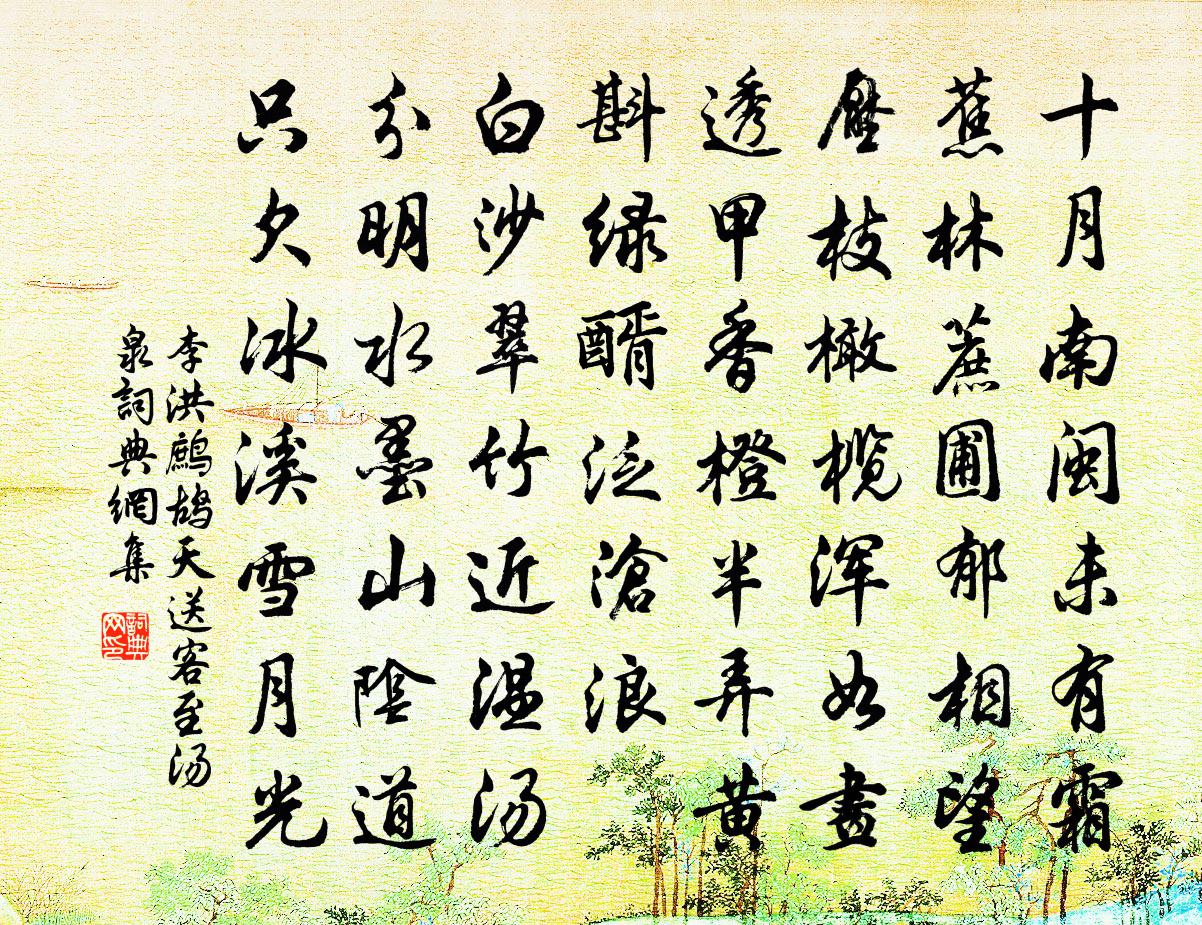 詩詞名句歷史字典書法欣賞書法字典國語詞典說文解字康熙字典古漢語字典標 題 作 者 詩 句 鷓鴣天(送客至湯泉)作者:李洪 朝代:宋代鷓鴣天(送客至湯泉)原文十月南閩未有霜。蕉林蔗圃郁相望。壓枝橄欖渾如畫,透甲香橙半弄黃。斟綠醑,泛滄浪。白沙翠竹近溫湯。分明水墨山陰1|1道,只欠冰溪雪月光。詩詞問答問:鷓鴣天(送客至湯泉)的作者是誰?答:李洪問:鷓鴣天(送客至湯泉)寫於哪個朝代?答:宋代問:鷓鴣天(送客至湯泉)是什麼體裁?答:詞李洪鷓鴣天(送客至湯泉)書法欣賞鷓鴣天(送客至湯泉)書法作品詩詞推薦浣溪沙周密〔宋代〕絲雨籠煙織晚晴。睡餘春酒未全醒。翠鈿輕脫隱香痕。生怕柳綿縈舞蝶,戲拋梅彈打啼鶯。最難消遣是殘春。夜泊東溪有懷唐彥謙〔唐代〕水昏天色晚,崖下泊行舟。獨客傷歸雁,孤眠嘆野鷗。溪聲牽別恨,鄉夢惹離愁。酒醒推篷坐,淒涼望女牛。禪人寫真求贊釋正覺〔宋代〕口方鼻直,眉棱眼深。未填溝壑,還礙叢林。萬象無得剩法,三世不見閒心。字雁沒而寒煙淡淡,華鱗潛而秋水沈吊屈原張詠〔宋代〕楚王不識聖人風,縱有英賢聲少通。可惜靈均好才術,一身空死亂離中。客邸晝寢起而追程釋紹嵩〔宋代〕客裹無聊久合併,夢回南北昧平生。苦吟風月唯添病,獨冒煙嵐促去程。城外諸峰迎落照,花邊白犬吠流鶯。阮途和顏長官百詠農桑朱繼芳〔宋代〕四月官場入納時,鄉耆旁午上門追。請看貧婦通宵織,身上曾無掛一絲。平原郡公趙福王挽章汪元量〔宋代〕大王無起日,草木盡傷悲。生在太平世,死當離亂時。南冠流遠路,北面幸全屍。舊客行霜霰,呼天淚濕麾。【越調】鬥鵪鶉 元宵佚名〔元代〕聖主寬仁,堯民盡喜。一統華夷,諸邦進禮。雨順風調,時豐歲麗。元夜值,風景奇。鬧穰穰的迓鼓喧天,明晃晃題香山湯禪師舒坦〔宋代〕千古神僧舊石扃,清風如在地還靈。溪形偃月無窮碧,山氣當雲不改青。果熟猿猱時嘯聚,錫飛岩穴尚芳磬。西來納火禮祀大辰十二首佚名〔宋代〕[太簇為徵]季秋之月;律中無射。農事備收,火功告畢。克禋克祀,有嚴有翼。風馬雲車,尚其來格。清心鏡 搜己過馬鈺〔元代〕搜己過。搜己過。自入道來,別無大過。只不合、說破玄機,是十分罪過。自知過,自知過。要免前*,將功補過奉使留金臣悟室求詩口占漫答洪皓〔宋代〕久持使節傍門庭,薄命猶賒五鼎烹。羝乳何心占北海,雁書隨夢到京城。莫言地廣頻修怨,應念民勞早戢兵。國寶百舌鳥魏野〔宋代〕長截鄰雞叫五更,數般名字百般聲。饒伊饒舌爭先曉,也待青天明即鳴。次韻陳明錫見寄林季仲〔宋代〕一別從京洛,相逢向海邦。倦遊憐舌在,多病覺眉龐。佳處隨山屐,餘生付酒缸。新詩眩老眼,細讀傍寒窗。念奴嬌程大昌〔宋代〕海角懷人,長誤喜、籟籟敲簾風竹。命駕翩然,誰信道、不怕溪山回曲。榻拂凝塵,香籠清宴,塵柄從揮玉。好音木蘭花慢周密〔宋代〕疏鐘敲暝色,正遠樹、綠愔愔。看渡水僧歸,投林鳥聚,煙冷秋屏。孤雲。漸沈雁影,尚殘簫、倦鼓別遊人。宮柳說之方憂韓公表大夫疾遽致仕乃蒙傳視送陳州晁說之〔宋代〕念公多疾病,使我頻驚愕。可恃膽氣大,何憂腠理薄。九丹詎凌空,八石聊扶弱。無煩問安否,冘冘亦自若。玉山縣南樓晚望陸游〔宋代〕小樓在何許,正在南溪上。空濛過釣船,斷續聞漁唱。征途苦偪仄,舒嘯喜清曠。安得此溪水,為我發春釀。經吳宮貫休〔唐代〕夫差昏暗霸圖傾,千古淒涼地不靈。妖艷恩作宮露濁,忠臣心苦海山青。蕭條陵隴侵寒水,仿佛樓台出杳冥。此是舟中夜坐陸游〔宋代〕風露浩無際,星河淡欲傾。遙知並船客,聞我詠詩聲。水鳥橫江去,漁舟背月行。神清不成寐,隱几待窗明。名句推薦當君懷歸日,是妾斷腸時。李白《春思》 深居俯夾城,春去夏猶清。李商隱《晚晴》 綠衣監使守宮門,一閉上陽多少春。白居易《上陽白髮人》 鼙鼓動時雷隱隱,獸頭凌處雪微微。盧肇《競渡詩 / 及第後江寧觀競渡寄袁州剌史成應元》 凡出言,信為先。詐與妄,奚可焉?李毓秀《弟子規·信》 正是霜風飄斷處,寒鷗驚起一雙雙。陸龜蒙《冬柳》 萬里雲間戍,立馬劍門關。崔與之《水調歌頭·題劍閣》 入世冷挑紅雪去,離塵香割紫雲來。曹雪芹《訪妙玉乞紅梅》 早知恁么。悔當初、不把雕鞍鎖。柳永《定風波·自春來》 福輕乎羽,莫之知載;禍重乎地,莫之知避。莊子《莊子·內篇·人間世》
