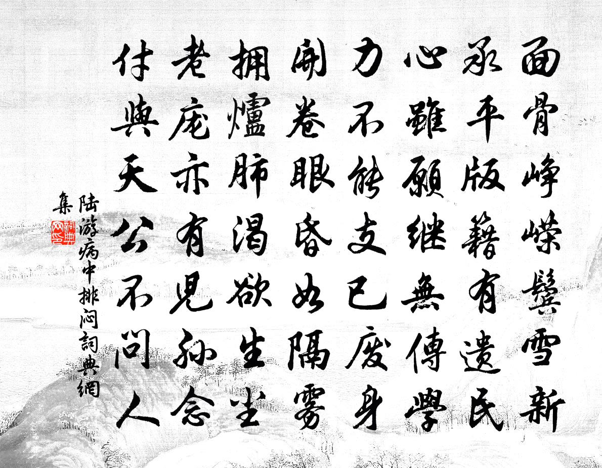 詩詞名句歷史字典書法欣賞書法字典國語詞典說文解字康熙字典古漢語字典標 題 作 者 詩 句 病中排悶作者:陸游 朝代:宋代病中排悶原文面骨崢嶸鬢雪新,承平版籍有遺民。心雖願繼無傳學,力不能支已廢身。開卷眼昏如隔霧,擁爐肺渴欲生塵。老龐亦有兒孫念,付與天公不問人。詩詞問答問:病中排悶的作者是誰?答:陸游問:病中排悶寫於哪個朝代?答:宋代問:陸游的名句有哪些?答:陸游名句大全陸游病中排悶書法欣賞病中排悶書法作品詩詞推薦覽古四十二首 其三十八楊維楨〔元代〕姚家有裨將,腰佩雙青萍。青萍夜脫匣,忽殺程務盈。為書報殺狀,伏劍隨自刑。吁嗟古義士,豈複數荊卿。八聲甘州(壽蕭帥參·九月廿三)楊守〔宋代〕問梅邊訊息有還無,似微笑應人。道近來別有,相家一種,葉葉都新。趁得嫩寒輕暖,七日小陽春。一點和羹意,朝晴陸游〔宋代〕宿雨初收雲四歸,小山草木麗朝暉。翩然雙鵲從檐下,言語分明訴濕衣。芹嘆文同〔宋代〕清霜入寒溪,水跡落一尺。飛沙上芹棄,脆卷如燎炙。孤根抱生意,春澤守遺瀝。願奉野人薦,充君盤中實。窗下戲詠陸游〔宋代〕飛來山鳥語惺惚,卻是幽人半睡中。新竹成陰無彈射,不妨同享北窗風。永遇樂(夏至)史浩〔宋代〕日永繡工,減卻一線,節臨短至。幸有杯盤,隨分快樂,□得醺醺醉。尋思塵世,寒來暑往,凍極又還熱熾。恰如和范景仁王景彝殿中雜題三十八首並次韻其二梅堯臣〔宋代〕前日宮醪賜玉尊,今朝持果小黃門。乾桃熏李非時物,置案盈盤不次恩。投以赤心思武帝,握同玄璧詠劉琨。嘗聞減字木蘭花王觀〔宋代〕才鳴□鼓。曲奏仙音如樂府。美似梨園。一派簫韶列玳筵。使人清耳。滿塵賓朋皆歡喜。勸飲金荷。祝壽延長福更擬古三首徐彥伯〔唐代〕遙裔煙嶼鴻,雙影旦夕同。交翰倚沙月,和鳴弄江風。灌若茂芳序,君子從遠戎。雲生陰海沒,花落春潭空。紅淚天街秦韜玉〔唐代〕九衢風景盡爭新,獨占天門近紫宸。寶馬競隨朝暮客,香車爭碾古今塵。煙光正入南山色,氣勢遙連北闕春。莫見燭影搖紅(歸去曲)毛滂〔宋代〕鬢綠飄蕭,漫郎已是青雲晚。古槐陰外小闌乾,不負看山眼。此意悠悠無限。有雲山、知人醉懶。他年尋我,水邊偈頌六十首釋曇華〔宋代〕金錫罷游留靠壁,草鞋乾曬待秋風。且那長夏深思省,看是平生有底功。真實行藏宜保惜,虛頭伎倆疾銷溶。老僧沁園春宋先生〔宋代〕速速修行,惜取身中,無價□珍。把金烏玉兔,爐中煉用,陰陽造化,養就陽神。虎嘯龍吟丹田裡,頂內時時仙樂通守田太尉生辰二首姜特立〔宋代〕吳頭楚尾幾名邦,公以循良達舜廊。未把勛庸齊冠鄧,直將教化繼龔黃。蠹蠲前政人云樂,最上諸司議曰臧。只恐題卷子會程公許〔宋代〕龍飛景運詔賓興,將相之階自此升。毛穎銛鋒須快戰,楮生衷甲作先登。精思可使文加點,抄寫能令價倍增。努力和李少卿游北湖六首李新〔宋代〕鞭蕖照水晚妝明,彩鷁無風自在行。爭席要人相爾汝,新來翻為玉漿驚。歙溪道中周耕雲〔宋代〕行行欲少歇,爭奈客途長。村酒略無味,野花空自香。幾家茅屋小,數畝麥田荒。何處堪投宿,林梢已夕陽。句朱浚〔宋代〕蓬萊春思重雲上,江漢秋情十載前。墨蘭黃庚〔宋代〕一幅幽花倚客窗,離騷讀罷意淒涼。筆頭喚醒靈均夢,猶憶當時楚畹香。失調名佚名〔宋代〕黃葉無風自落,彩雲不雨空歸。名句推薦試問鄉關何處是,水雲浩蕩迷南北。趙鼎《滿江紅·丁未九月南渡泊舟儀真江口作》 論德而定次,量能而授官。荀子《荀子·君道》 涼風起天末,君子意如何。杜甫《天末懷李白》 歌舞尊前,繁華鏡里,暗換青青發。薩都剌《念奴嬌·登石頭城次東坡韻》 胡雁哀鳴夜夜飛,胡兒眼淚雙雙落。李頎《古從軍行》 智者千慮,必有一失;愚者千慮,必有一得。司馬遷《史記·淮陰侯列傳》 江漢思歸客,乾坤一腐儒。杜甫《江漢》 長安大雪天,鳥雀難相覓。張孜《雪詩》 皚如山上雪,皎若雲間月。卓文君《白頭吟》 手弄生綃白團扇,扇手一時似玉。蘇軾《賀新郎·夏景》