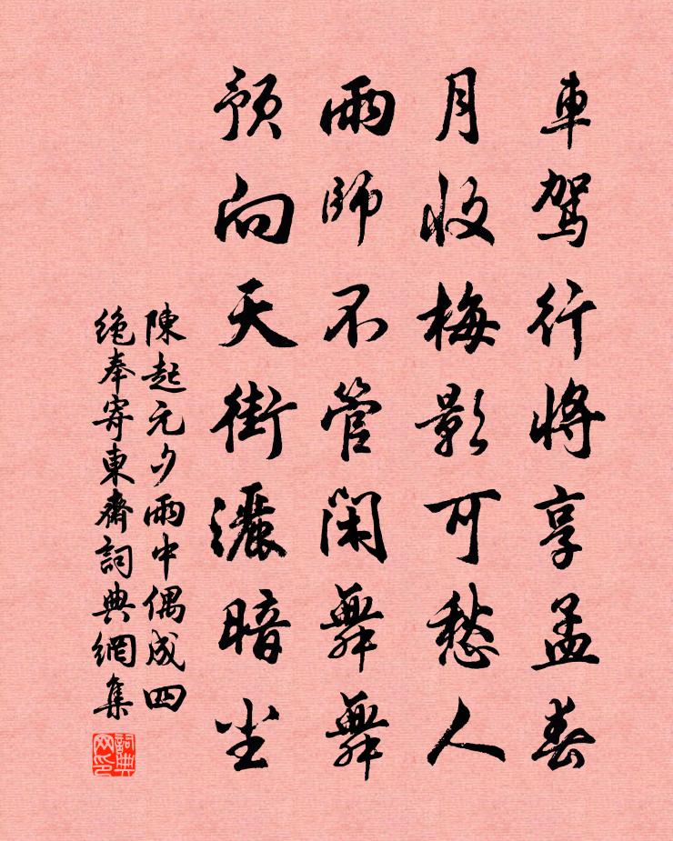 詩詞名句歷史字典書法欣賞書法字典國語詞典說文解字康熙字典古漢語字典標 題 作 者 詩 句 元夕雨中偶成四絕奉寄東齋作者:陳起 朝代:宋代元夕雨中偶成四絕奉寄東齋原文車駕行將享孟春,月收梅影可愁人。雨師不管閒舞舞,預向天街灑暗塵。詩詞問答問:元夕雨中偶成四絕奉寄東齋的作者是誰?答:陳起問:元夕雨中偶成四絕奉寄東齋寫於哪個朝代?答:宋代陳起元夕雨中偶成四絕奉寄東齋書法欣賞元夕雨中偶成四絕奉寄東齋書法作品詩詞推薦送光祿王寺丞通判徐方王禹偁〔宋代〕通悴徐方蒨綬新,老萊衣服暫離身。家君蓮幕開廳事,府帥金貂耀縉紳。戲馬台荒春寂寞,斬蛇鄉古樹輪囷。公餘郴江百詠並序浪井阮閱〔宋代〕可畏人情與世途,險如波浪起江湖。豈知荊楚山川地,坎井泓泉無處無。頌古十七首釋大觀〔宋代〕飢人貪食良農粟,渴漢錯飲蠱家水。對面還成千里遙,賊人有智過君子。雪九首傅察〔宋代〕墨雲埋日車,厚雪鎮坤軸。行路勿匆匆,包藏恐深谷。壽嫩庵趙先生十首陳元晉〔宋代〕開濟平生學,忠精一寸心,時危添白髮,意遠寄清吟。河洛風埃滿,江湖歲月深。眼明天柱壯,{氵霝}淥對渠斟江樓韋承慶〔唐代〕獨酌芳春酒,登樓已半曛。誰驚一行雁,沖斷過江雲。湛溪納涼陳文蔚〔宋代〕昌處皆炎熱,澄江消客憂。相邀讀書罷,同作浴沂游。自喜坐茂樹,誰能喚小舟。月華如有待,先在柳桃頭。句釋曇穎〔宋代〕自從游紫陌,誰肯隱青山。和權載之離合詩(時為國子司業)武少儀〔唐代〕少年慕時彥,小悟文多變。木鐸比群英,八方流德聲。雷陳美交契,雨雪音塵繼。恩顧各飛翔,因詩睹瑰麗。傅野憂患中作姜特立〔宋代〕吉凶既同域,憂喜亦同途。萬緣互起滅,誰能久歡娛。歡娛既不久,悲恨常與俱。唯有嵇阮輩,乃能脫囚抱。一醉鴛鴦篇陳子昂〔唐代〕飛飛鴛鴦鳥。舉翼相蔽虧。俱來綠潭裡。共向白雲涯。音容相眷戀。羽翮兩逶迤。苹萍戲春渚。霜霰繞寒池。浦沙綠陰舒岳祥〔宋代〕野色蒙茸翠羽蓋,山光澹蕩碧油幢。午煙時引煎茶灶,曉霧還沾讀易窗。隱映擲金鶯點點,分明藉玉鷺雙雙。莫疑送程鵬翼赴山東運司經歷柯九思〔元代〕齊人富國書猶在,煮海為鹽屬縣官。千灶飄煙雲樹濕,萬盤凝雪浪花乾。西曹儒雅聲華舊,東郡司存禮數寬。談笑風鈴胡朝潁〔宋代〕風不能調碎玉聲,宮商濫奏竟難名。誰家稚女敲言響,一曲從頭學不成。王子直輓辭二首蘇頌〔宋代〕嗟若時之彥,懷哉昔並游。十年追幾硯,一別見墳丘。滿目皆陳跡,傷心未白頭。風流何處盡,潁水去悠悠。贈鄭仁規方乾〔唐代〕一石雄才獨占難,應分二斗借人寰。澄心不出風騷外,落筆全歸教化間。蓮幕未來須更聘,桂枝才去即先攀。可憐遺吳沖卿大饗碑文韓維〔宋代〕蒼碑剝龍螭,突兀古殿側。世變文字異,歲久苔蘚蝕。諒非好事者,塵土未嘗拭。我來仰首看,百過不自息。曩者贈葉大明文天祥〔宋代〕大明標榜葉氏子,自稱後村門下士。誤言木吉孛為災,後村曾發一笑來。其師流傳說如此,寧知禍福乃不爾。犀腰送朝邑張明府(此公善琴)盧綸〔唐代〕千室暮山西,浮雲與樹齊。剖辭雲落紙,擁吏雪成泥。野火蘆千頃,河田水萬畦。不知琴月夜,誰得聽烏啼。憶舊山徐夤〔唐代〕澗竹岩雲有舊期,二年頻長鬢邊絲。游魚不愛金杯水,棲鳥敢求瓊樹枝。陶景戀深松檜影,留侯拋卻帝王師。龍爭名句推薦人歸山郭暗,雁下蘆洲白。韋應物《夕次盱眙縣》 陪都歌舞迎佳節,遙祝延安景物華。 * 《元旦口占用柳亞子懷人韻》 非懷北歸興,何用勝羈愁韓愈《洞庭湖阻風贈張十一署·時自陽山徙掾江陵》 無情不似多情苦。一寸還成千萬縷。晏殊《玉樓春·春恨》 待羔兒、酒罷又烹茶,揚州鶴。辛棄疾《滿江紅·和范先之雪》 長條短葉翠濛濛,才過西風,又過東風。夏完淳《一剪梅·詠柳》 珍重主人心,酒深情亦深。韋莊《菩薩蠻·勸君今夜須沈醉》 所謂伊人,在水一方。佚名《蒹葭》 事不三思終有悔,人能百忍自無憂。馮夢龍《醒世恆言·卷三十四》 時節是重陽,菊花牽恨長。徐燦《菩薩蠻·秋閨》