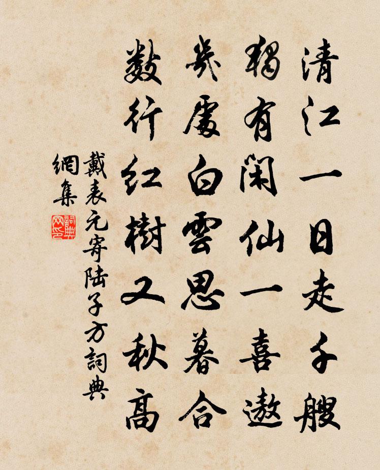 詩詞名句歷史字典書法欣賞書法字典國語詞典說文解字康熙字典古漢語字典標 題 作 者 詩 句 寄陸子方作者:戴表元 朝代:宋代寄陸子方原文清江一日走千艘,獨有閒仙一喜遨。幾處白雲思暮合,數行紅樹又秋高。詩詞問答問:寄陸子方的作者是誰?答:戴表元問:寄陸子方寫於哪個朝代?答:宋代戴表元寄陸子方書法欣賞寄陸子方書法作品詩詞推薦挽楊茂原二首趙蕃〔宋代〕松老成哀吹,天高慘暮雲。如何歲時隔,便作死生分。經紀無家事,編藏有舊文。周侯誠義士,節概過非君。春從天上來(武昌秋夜)周伯陽〔宋代〕浩蕩青冥。正涼露如洗,萬里虛明。鼓角悲健,秋入重城。彷佛石上三生。指蓬萊雲路,渺何許、月冷風清。倚南花舞史浩〔宋代〕淨客之名從此有。多謝風流,飛馭陪尊酒。持此一卮同勸後。願花長在人長壽。登榕溪閣蔡戡〔宋代〕公餘贏得暫時休,歸騎匆匆更少留。古木千章環美蔭,危亭百尺枕清流。詩翁仙去留遺蹟,病守重來訪昔游。坐久次韻戴帥初見寄二首陳著〔宋代〕胸次玲瓏達事端,入山買屋貯清寒。奉親最樂危時見,與俗相忘實處看。閒輟琴書翻兔冊,旋添竹樹隔牛闌。疏衣感皇恩李孝光〔元代〕五馬東來,人歌襦夸,春晚棠陰綠如許。草堂詩夢,應費湖中簫鼓。清香生畫戟、連嘉樹。父老踏歌、道君侯來何詠史詩驌驦陂胡曾〔唐代〕行行西至一荒陂,因笑唐公不見機。莫惜驌驦輸令尹,漢東宮闕早時歸。彭澤祭陶靖節祠王奕〔宋代〕嗚呼,典午去矣,柴桑歸矣,黃花老矣,徵士卒矣。尚饗。贈東隱小師林復祖陳著〔宋代〕萬木雕零獨有松,雪霜風裡幾春冬。須知受變方成物,直上雲霄舞翠龍。憶江南劉禹錫〔唐代〕春去也,共惜艷陽年。猶有桃花流水上,無辭竹葉醉尊前。惟待見青天。漏澤院四絕句陳造〔宋代〕雪翎如扇十鈞弓,霹靂聲前玉斝空。人似堵牆爭指似,少年場裡著衰翁。訓世孝弟詩十首邵雍〔宋代〕子孝親兮弟敬哥,怡聲下氣與謙和。難兄難弟名偏重,孝子賢孫貴自多。負米尚難為薄養,讀書寧不擢高科。仲由溽暑蘇轍〔宋代〕東風吹鼎方然薪,游魚出沒一世人。隨湯上下猶欣欣,不識河漢清涼津。十年我已不出門,可憐尚寄生死濱。老知蒙齋劉藻〔宋代〕蒙齋遠廛市,勝概幾多清。山下一泉涌,望中千畝平。林深俗客少,岩小曉煙輕。杖屨從登眺,誰知有利名。題直上天津顧逢〔宋代〕欲向銀河去,唐家有畫船。更無風浪險,竟到鬥牛邊。笑傲瓊樓上,歌吟玉宇前。乘槎今有便,不必羨張騫。詠菊二首王安石〔宋代〕補落迦山傳得種,閻浮檀水染成花。光明一室真金色,復似毗耶長者家。呈大宗丞求筆戲丘葵〔宋代〕咄咄人誰識,翩翩老更佳,王維不是畫,蘇晉已長齋。地靜白生室,天秋黃落階。日長用幽意,咫尺到無懷。病起枕上口占三絕句奉呈公實嶠之賢伯仲一笑張元乾〔宋代〕海外綠洋來萬里,齊驅黎母鷓鴣斑。肯分鐘鍾篋中富,不用公家金博山。送清隱純老住池陽杉山曹勛〔宋代〕冥冥細雨綠陰齊,湛湛長江客去時。剔起眉毛欣應供,橫擔楖栗看來期。貞元杉錢聞詩〔宋代〕鶴去悽然一古杉,傲霜凌雪幾年間。若非一種靈根異,安得青青不改顏。名句推薦能勝強敵者,先自勝者也。商鞅《商君書·畫策》 大江流日夜,客心悲未央。謝朓《暫使下都夜發新林至京邑贈西府同僚》 唯有長江水,無語東流。柳永《八聲甘州·對瀟瀟暮雨灑江天》 溪雲初起日沉閣,山雨欲來風滿樓。許渾《鹹陽城東樓 / 鹹陽城西樓晚眺 / 西門》 三更燈火五更雞,正是男兒讀書時。顏真卿《勸學詩》 紗窗日落漸黃昏,金屋無人見淚痕。劉方平《春怨》 英雄一去豪華盡,惟有青山似洛中。許渾《金陵懷古》 故人不可見,新知萬里外。文天祥《端午即事》 量大禍不在,機深禍亦深。佚名《增廣賢文·下集》 不知來歲牡丹時,再相逢何處。葉清臣《賀聖朝·留別》