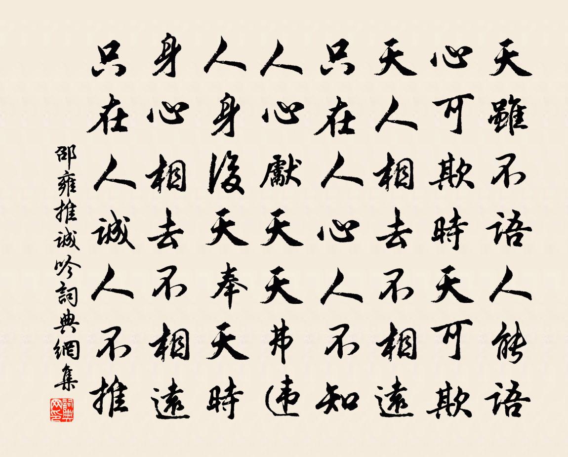 詩詞名句歷史字典書法欣賞書法字典國語詞典說文解字康熙字典古漢語字典標 題 作 者 詩 句 推誠吟作者:邵雍 朝代:宋代推誠吟原文天雖不語人能語,心可欺時天可欺。天人相去不相遠,只在人心人不知。人心先天天弗違,人身後天奉天時。身心相去不相遠,只在人誠人不推。詩詞問答問:推誠吟的作者是誰?答:邵雍問:推誠吟寫於哪個朝代?答:宋代邵雍推誠吟書法欣賞推誠吟書法作品詩詞推薦感皇恩阮閱〔宋代〕芝檢下中天,春寒猶淺。餘閏銀蟾許重看。滿城燈火,又遍高樓深院。寶鞍催繡轂,香風軟。憔悴慢翁,蕭條古縣著作李季間得閬守去國以書道別追寄四韻孫應時〔宋代〕不將塵土望清華,珍重高情久更加。肯把書來話心曲,又從今去各天涯。一麾可是君恩薄,百丈休憐江路賒。歸見游蘭溪 / 游沙湖蘇軾〔宋代〕黃州東南三十里為沙湖,亦曰螺師店。予買田其間,因往相田得疾。聞麻橋人龐安常善醫而聾。遂往求療。安常雖南楊判鎮以詩問安次韻釋紹曇〔宋代〕拙養自林泉,鏖戰驚蠻觸。心灰百念寒,虐焰肯停蓄。猗歟子云翁,惜我如龜玉。無復獻楚庭,終期毀於櫝。夢語洪咨夔〔宋代〕塵尾御犢轅,竹枝招羊車。意足各人眼,心合無天涯。寶扇閒草蟲,碧衫涼暗花。荼蘼金沙底,清歌按紅牙。醒疑田氏南樓對月馬戴〔唐代〕主人同露坐,明月在高台。咽咽陰蟲叫,蕭蕭寒雁來。影搖疏木落,魄轉曙鍾開。倖免丹霞映,清光溢酒杯。閒居有感陳著〔宋代〕參差梅竹槿花籬,強對溪山傲百罹。終日書聲清屋氣,四時蔬食壽家規。苦兒知學何妨懶,老婦安貧未覺衰。無處題趙昌父山居八詠青氈堂楊萬里〔宋代〕客來借氈看,笑指一書策。不管賣不行,且圖偷不得。二月十四日曉起看海棠八首楊萬里〔宋代〕外種百來樹,中安一小亭。放眸紅未了,紅了是天青。失調名佚名〔宋代〕別有暗愁深意。宮詞楊皇后〔宋代〕元宵時雨賞宮梅,恭請光堯壽聖來。醉裹君王扶上替,鑾輿半仗點燈回。汪氏別野次韻張祁〔宋代〕蕪湖還似鑑湖春,我亦歸來賀季真。好賦俱陪招隱士,耦耕長似問津人。襟懷處處尊前好,花柳番番雨後新。誰道題嚴君觀王嵒〔宋代〕寒雲古木罩星台,凡骨仙蹤信可哀。二十年前曾此到,一千年內未歸來。偈頌二百零五首釋正覺〔宋代〕孤筇長作水雲遊,底事而今嗾下休。一點破幽明歷歷,十分合體冷湫湫。暗中須透金針穴,轉處還藏玉線頭。劫外寺樓月夜醉中戲作陸游〔宋代〕水精盞映碧琳腴,月下泠泠看似無。此酒定從何處得,判知不是文君壚。送秀才歸南海林昉〔宋代〕歸路番禺遠,蠻鄉島嶼經。天黃春有瘴,海黑夜無星。北帖船中看,南歌枕上聽。遙知到家日,蜩響荔枝青。天仙子馬子嚴〔宋代〕白玉為台金作盞。香是江梅名閬苑。年時把酒對君歌,歌不斷。杯無算。花月當樓人意滿。翹戴一枝蟬影亂。樂事採桑行顧禧〔宋代〕三府三起,作苦何辭。靜樂用元韻為勸學之什再和鄭清之〔宋代〕士惟食志非食力,於陵奚事親屨織。靜樂一門自師友,簣進不為子貢息。元仲季方從太丘,海內人士俱願識。案上環碧園董嗣杲〔宋代〕繞舍晴波聚釣仙,五龍池畔柳洲前。清虛不類侯家屋,輪奐曾資母后錢。三面軒窗秋水觀,四時簫鼓夕陽船。攬將名句推薦醉不成歡慘將別,別時茫茫江浸月。白居易《琵琶行 / 琵琶引》 氣軟來風易,枝繁度鳥遲。李爽《芳樹》 令必行,禁必止。韓非及後人《韓非子·飾邪》 知者行之始。行者知之成。王陽明《傳習錄·卷上·門人陸澄錄》 雁聲吹過黃昏雨,籬邊月圓萋緊端木國瑚《齊天樂·菊影(雁聲吹過黃昏雨)》 春雲吹散湘簾雨,絮黏蝴蝶飛還住。納蘭性德《菩薩蠻·春雲吹散湘簾雨》 隋堤上、曾見幾番,拂水飄綿送行色。周邦彥《蘭陵王·柳》 九日明朝酒香,一年好景橙黃。張可久《滿庭芳·客中九日》 唯明主為能愛其所愛,闇主則必危其所愛。荀子《荀子·君道》 尋桃覓柳,開遍南枝未覺。辛棄疾《瑞鶴仙·賦梅》