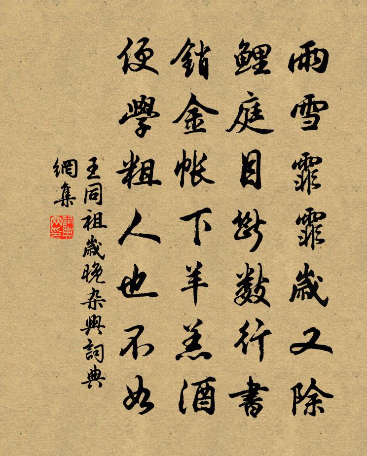 詩詞名句歷史字典書法欣賞書法字典國語詞典說文解字康熙字典古漢語字典標 題 作 者 詩 句 歲晚雜興作者:王同祖 朝代:宋代歲晚雜興原文雨雪霏霏歲又除,鯉庭目斷數行書。銷金帳下羊羔酒,便學粗人也不如。詩詞問答問:歲晚雜興的作者是誰?答:王同祖問:歲晚雜興寫於哪個朝代?答:宋代王同祖歲晚雜興書法欣賞歲晚雜興書法作品詩詞推薦朱武太傅通判常州兼寄胡武平梅堯臣〔宋代〕昔我陽夏公,嘗茲同郡治。政余作東園,草木尚有意。豈不務安養,斯民歌樂易。是時有賢才,鄉舉堪皇器。今方洞霄宮陳堯佐〔宋代〕一帆高掛出紅塵,萬仞長歌入紫雲。莫道遊仙別無侶,玉清冠蓋許同群。和王季文題九華山神穎〔唐代〕眾岳雄分野,九華鎮南朝。彩筆凝空遠,崔嵬寄青霄。龍潭古仙府,靈藥今不凋。瑩為滄海鏡,煙霞作荒標。造化張好好詩杜牧〔唐代〕牧大和三年,佐故吏部沈公江西幕,好好年十三,始以善歌來樂籍中。後一歲,公移鎮宣城,復置好好於宣城籍中游虎丘釋興肇〔宋代〕滄海何年涌,秦傳虎踞丘。池空劍光冷,墳缺鬼吟愁。石礙樓台仄,煙深草木稠。吳人貪勝概,春盡亦來游。答韓十八駑驥吟歐陽詹〔唐代〕故人舒其憤,昨示駑驥篇。駑以易售陳,驥以難知言。委曲感既深,咨嗟詞亦殷。伊情有遠瀾,余志遜其源。室在釣台詩范仲淹〔宋代〕漢包六合岡英豪。一個冥鴻惜羽毛。世祖功臣三十六,雲台爭似釣台高。簡同年刁時中俊卿五邁〔宋代〕讀君老宵詩,一讀三太息。君方未第時,憂民真懇側。直筆誅縣官,言言虹貫日。縣官怒共訕,移文加誚斥。君笑水仙盛開,留子上弟小酌楊萬里〔宋代〕手種凌波香,今歲便十斛。要知誠齋中,富底水仙國。有酒偏欠花,有花恨無客。與子對花前,不醉便了得。待勸舟過望亭三首楊萬里〔宋代〕常州盡處是望亭,已離常州第四程。柳線絆船知不住,卻教飛絮送儂行。游東西岩(即謝安東山也。)蘇軾〔宋代〕謝公含雅量,世運屬艱難。況復情所鍾,感慨萃中年。正賴絲與竹,陶寫有餘歡。嘗恐兒輩覺,坐令高趣闌。獨攜偶亦夜坐用前韻方回〔宋代〕林禽畏冷暮爭歸,水上荒城早闔扉。敲月會棋迎皂衲,斧冰供茗喚青衣。齕萁老馬廏中響,瞰燭痴蛾窗外飛。忽報採桑子謝逸〔宋代〕楚山削玉雲中碧,影落沙汀。秋水澄凝。一抹江天雁字橫。金錢滿地西風急,紅蓼煙輕。簾外砧聲。驚起青樓夢不峽中嘗茶鄭谷〔唐代〕蔟蔟新英摘露光,小江園裡火煎嘗。吳僧漫說鴉山好,蜀叟休夸鳥觜香。合座半甌輕 * ,開緘數片淺含黃。鹿門瓜橋競渡朱清〔宋代〕東吳霸業已成然,渡口瓜畦澤未乾。為問曩時仙在否,何堪雲樹鶴蹁躚。表兄峽山蕭伯鈞至會昌久之以歸歟字韻丐詩為曾豐〔宋代〕握手兩旬許,歸途千里余。繼今難得便,及早發回書。父祖初深契,兒孫久漸疏。朱陳婚嫁約,還可繼之歟。秦望山二首曾豐〔宋代〕銳意秦皇初學仙,要和雞犬也升天。那知身與鮑俱臭,嬴氏炊寒不復煙。東歸在路率爾成詠孫萬壽〔隋代〕學宦兩無成,歸心自不平。故鄉尚萬里,山秋猿夜鳴。人愁慘雲色,客意慣風聲。羈恨雖多情,俱是一傷情。持敬堂吳龍翰〔宋代〕大哉紫陽箴,誠為百世師。心法故能傳,心印幾能提。明明道統燈,於此接光輝。端居儼帝臨,暗室疑神窺。立足對雨寄楊公濟強至〔宋代〕江海歲雲晏,雨冥風自淒。葉光群木洗,翅濕幾禽低。靜榻欹寒枕,孤城隱暮鼙。少陵車馬客,催踏草堂泥。名句推薦四十年來家國,三千里地山河李煜《破陣子·四十年來家國》 貧居往往無煙火,不獨明朝為子推。孟雲卿《寒食》 千里孤墳,無處話淒涼。蘇軾《江城子·乙卯正月二十日夜記夢》 月去疏簾才數尺,烏鵲驚飛,一片傷心白。宋琬《蝶戀花·旅月懷人》 人告之以有過則喜。孟子《孟子·公孫丑章句上·第八節》 未成林,難望鳳來棲,聊醫俗。陸容《滿江紅·詠竹》 飛雪帶春風,裴回亂繞空。劉方平《春雪》 千尋鐵鎖沉江底,一片降幡出石頭。劉禹錫《西塞山懷古》 偏借其權勢,則上下易位矣,此言人臣之不可借權勢。韓非及後人《韓非子·備內》 莫見長安行樂處,空令歲月易蹉跎。李頎《送魏萬之京》