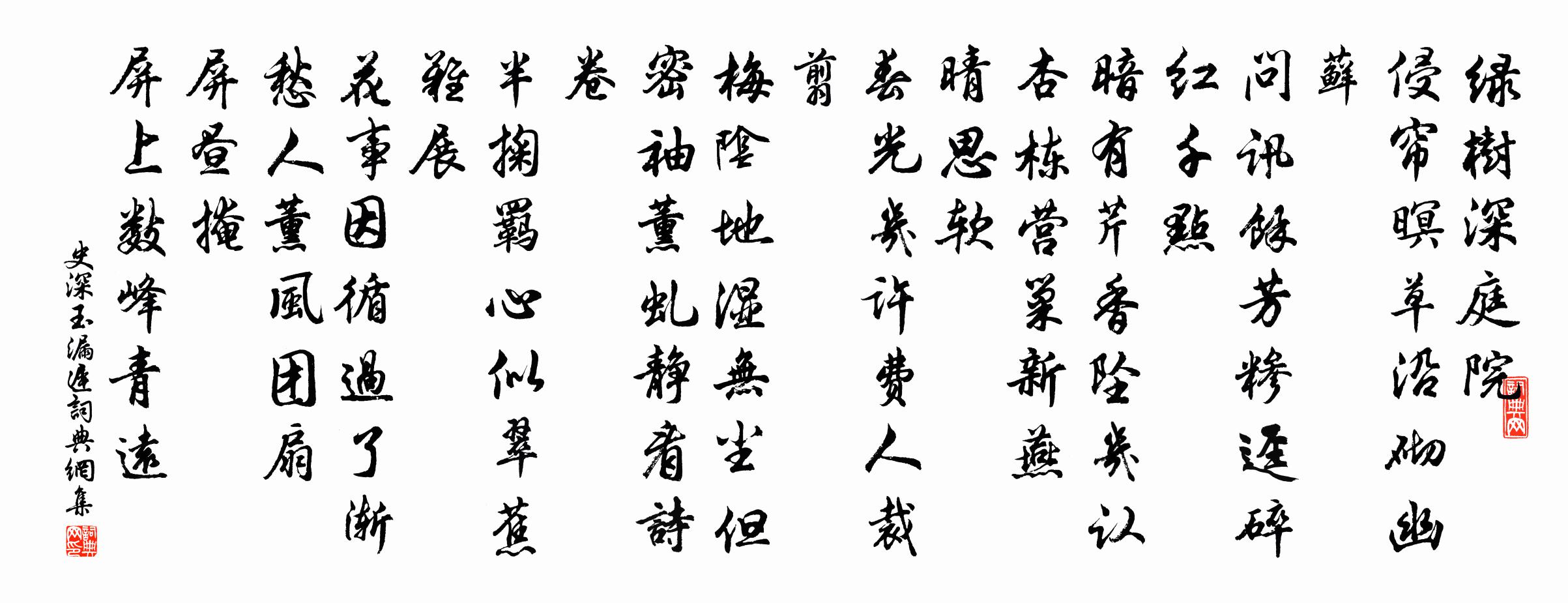 詩詞名句歷史字典書法欣賞書法字典國語詞典說文解字康熙字典古漢語字典標 題 作 者 詩 句 玉漏遲作者:史深 朝代:宋代玉漏遲原文綠樹深庭院。侵簾暝草,沿砌幽蘚。問訊餘芳,糝逕碎紅千點。暗有芹香墜幾,認杏棟、營巢新燕。晴思軟。春光幾許,費人裁翦。梅陰地濕無塵,但密袖薰虬,靜看詩卷。半掬羈心,似翠蕉難展。花事因循過了,漸愁人、薰風團扇。屏晝掩。屏上數峰青遠。詩詞問答問:玉漏遲的作者是誰?答:史深問:玉漏遲寫於哪個朝代?答:宋代問:玉漏遲是什麼體裁?答:詞史深玉漏遲書法欣賞玉漏遲書法作品詩詞推薦七里驛遇葉振卿秘校南歸三首孔武仲〔宋代〕系馬郵亭寂寞中,遠沙喬木暮號風。今霄不作江南夢,賴有之人笑語同。雨花台周弼〔宋代〕細蘚柔莎瑣舊堆,昔年曾見異僧回。如何天上飛靈雨,不為人間洗劫灰。江接潮頭諸脈應,地連崗勢一支來。只今和皇太子瑞雪二首楊萬里〔宋代〕揉雲按霧碎成塵,落不曾休酉達辰。鶴禁鏤水成七字,野人拜賜敢辭頻。雨過厲元吉〔宋代〕漠漠輕雲過野牆,新楓矮柏色蒼蒼。平田鶴跡留殘雨,深塢鸝聲帶夕陽。梁苑王昌齡〔唐代〕梁園秋竹古時煙,城外風悲欲暮天。萬乘旌旗何處在,平台賓客有誰憐。龍眼李劉〔宋代〕絳衣搖曳綻冰肌,依約華清出浴時。何物鴉兒驅不去,前身恐是食酥兒。次韻七首蘇泂〔宋代〕步蹇堪扶杖,頭童欲罷簪。渚雲秋澹泊,庭樹晚蕭森。秀穎垂千畝,遙青出寸岑。本來關個事,而獨可人心。倦尋芳(渡口酒家)王質〔宋代〕斷崖樹老,側岸槎枯,倒倚斜插。腳面淺溪,掌樣平洲重疊。著芒鞋,攜竹杖,遇亂莎幽澗縈紆涉。那人家,有竹賡吳竹修雪詩二首陳著〔宋代〕寒勒銀河不放流,幻飛六出眩人眸。誰知青女老成手,自媚玄冥冬盡頭。積峻便如群玉府,遇□還作□毛球。西湖春晚左緯〔宋代〕池上柳依依,柳邊人掩扉。蝶隨花片落,燕拂水紋飛。試數交遊看,方驚笑語稀。一年春又盡,倚杖對斜暉。送魏秘書赴召崔與之〔宋代〕國論參稽定,人材護養成。古來同此恨,老去向誰傾。太白雲猶溼,瞿塘水正生。掛帆乾斗極,屬耳鳳凰鳴。從齊武帝琅琊城講武應詔詩沈約〔南北朝〕九功播祧墠。七德陳武懸。展事昌國圖。息兵由重戰。皇情咨閱典。出車迨辰選。飾徒映寒隰。翻綏臨廣甸。颯杳水龍吟(九日登城)黎廷瑞〔宋代〕荒城落日西風,滿街芳草無行路。樓台羽化,螢飛故苑,蛩吟殘礎。不減承平,半湖秋月,隔溪煙樹。慨江南風景奉陪侍中春日過武安君廟盧綸〔唐代〕長裾間貔虎,遺廟盛攀登。白羽三千騎,紅林一萬層。元臣達幽契,祝史告明徵。撫坐悲今古,瞻容感廢興。迴風渡揚子陳造〔宋代〕濤江吞天去,委此舟一葉。有之恃勇往,微命幾顛跲。弱纜維復解,宿浪俄妥帖。北風不滿帆,晴空欲凌躡。淮人嘉禾百詠披雲閣張堯同〔宋代〕茲樓當勝地,高望極堎贈。欲睹青天色,還須上一層。句夏噩〔宋代〕謝守風流為騰事,杜郎吟詠屬多才。詠雞詩,題金雞報曉圖 其三唐寅〔明代〕血染冠頭錦做翎,昂昂氣象羽毛新;大明門外朝天客,立馬先聽第一聲。 龍蛇歌先秦無名〔先秦〕有龍矯矯。頃失其所。五蛇從之。周遍天下。龍飢無食。一蛇割股。龍返其淵。安其壤土。四蛇入穴。皆有處所。簡李伯仁節甫趙蕃〔宋代〕溧水忽再到,清明無隔晨。一翁方上府,二季曲留賓。詩律嘆仍舊,鬢霜驚漸新。君家直李杜,我乃愧黃陳。名句推薦春潮帶雨晚來急,野渡無人舟自橫。韋應物《滁州西澗》 獨抱影兒眠,背看燈花落。汪懋麟《誤佳期·閨怨》 三日柴門擁不開,階平庭滿白皚皚。柳宗元《酬王二十舍人雪中見寄》 天蒼蒼,野茫茫。風吹草低見牛羊。佚名《敕勒歌》 綠葉漸成陰,下有遊人歸路。王安石《傷春怨·雨打江南樹》 不辭山路遠,踏雪也相過。張九齡《答陸澧》 君子將說富貴,必勉於仁也。戴聖《大戴禮記·曾子制言中第五十五》 野梅燒不盡,時見兩三花劉基《古戍》 所敬者寡,而悅者眾,此之謂要道也。孔子及其弟子《孝經·廣要道》 積善之家必有餘慶,積不善之家必有餘殃。佚名《易傳·文言傳·坤文言》
