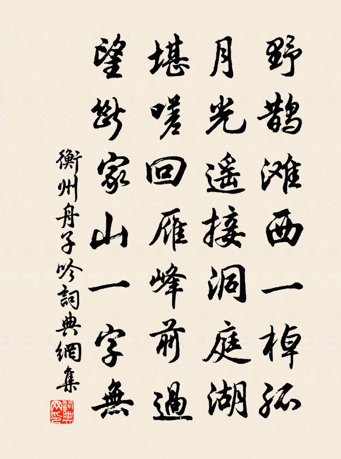 詩詞名句歷史字典書法欣賞書法字典國語詞典說文解字康熙字典古漢語字典標 題 作 者 詩 句 吟作者:衡州舟子 朝代:唐代吟原文野鵲灘西一棹孤,月光遙接洞庭湖。堪嗟回雁峰前過,望斷家山一字無。詩詞問答問:吟的作者是誰?答:衡州舟子問:吟寫於哪個朝代?答:唐代問:吟是什麼體裁?答:七絕衡州舟子吟書法欣賞吟書法作品注釋全唐詩:卷784-28詩詞推薦伏謁太神御殿詩鄭獬〔宋代〕景煙滿殿曉香清,日角龍顏五色明。五季積成天下亂,千年方有聖人生。重開混沌立萬象,獨斬蚩尤銷五兵。願作送裴二虬尉永嘉杜甫〔唐代〕孤嶼亭何處?天涯水氣中。故人官就此,絕境與誰同?隱吏逢梅福,游山憶謝公。扁舟吾已具,把釣待秋風。楊先高題漱玉軒聞九成〔宋代〕二龍觸斗一不支,化為怪石檐之垂。神泉內溢石齒迸,漱激猶作瓊瑤飛。琴高赤鱓或在邇,借我一跨邀安期。遠來芙蓉吳芾〔宋代〕誰向澄波上,心將雲錦鋪。無因一寓目,卻憶小西湖。緣識宋太宗〔宋代〕乾剛展轉運陰陽,一味清虛道不忙。玄妙永通天地久,未言大海變田桑。嚴陵決曹易允升自官下遣騎歸,寫予老醜,因楊萬里〔宋代〕玉泉半潭冰,釣台萬岳雪。汝往訪客星,剩挾一磨衲。崇恩太后升袝十四首真宗〔宋代〕雝雝玉佩,清酤惟良。粢盛具列,有飶其香。懷其徽范,德洽無疆。於茲燕止,降福穰穰。同振之德久分韻賦坐石東坡字程公許〔宋代〕千年間氣落岷峨,驚世聲名鎮不磨。吟詠西湖雖有案,經年儋耳卻無波。細看據石橫藜坐,想見騎龍跨海過。山谷秋浦清溪雪夜對酒,客有唱山鷓鴣者李白〔唐代〕披君作我貂,對君白玉壺。雪花酒上滅,頓覺夜寒無。客有桂陽至,能吟山鷓鴣。清風動窗竹,越鳥起相呼。持此送曇知客歸感山釋惟一〔宋代〕嫩向人前送又迎,飄然去路一身輕。到家有問到家句,雨過蕭湘秋月明。初過隴山途中,呈宇文判官岑參〔唐代〕一驛過一驛,驛騎如星流。平明發鹹陽,暮及隴山頭。隴水不可聽,嗚咽令人愁。沙塵撲馬汗,霧露凝貂裘。西來送舟過南山用琴韻二首李彌遜〔宋代〕雲濤一葦意雄夸,慣與灘頭雁聚沙。年後臘前梅喚客,山南水北竹為家。蓬蒿影里開三徑,笳鼓聲中聽兩衙。去住松陳宓〔宋代〕擎天端作柱,度漢可為梁。不受紅塵涴,長依皦日光。風行氣錠韻,雨過發真香。偏向閩中道,炎時散午涼。女曰雞鳴佚名〔先秦〕女曰雞鳴,士曰昧旦。子興視夜,明星有爛。將翱將翔,弋鳧與雁。弋言加之,與子宜之。宜言飲酒,與子偕老。喜劉伯宣尚書至五首方回〔宋代〕湖海襟期落,山林骨相寒。自慚知道晚,未覺忍窮難。缺米臨炊糴,逢花就擔看。尚能中酒聖,肯諱作詩酸。眉州驛舍睡起陸游〔宋代〕平生百無能,一嬾每自喜。胡為八年間,逐食走萬里。身如盤汞轉,人似爐丹死。事君未免媿,富貴不如已。雨余沁園春(□竹窗紙枕屏)陳著〔宋代〕小枕屏兒,面兒素淨,吾自愛之。向春晴欲曉,低斜半展,夜寒如水,屈曲深圍。消得題詩,不須作畫,瀟灑風流郡界閔雨州將率官屬禳禬宋祁〔宋代〕劭農方狎野,熯旱嘆焦原。六幕沈雲族,千箱害稼孫。都人望天漢,國相閉陽門。盛怒風生穴,汙邪祝有豚。征徒催妝詩成郎中〔宋代〕一床兩好世間無,好女如何得好夫。高捲珠簾明點燭,試教菩薩看麻胡。二月十八日席上憶季長未還不同斯樂欲作詩寄宋祁〔宋代〕煙壓西郊雨壓津,滿城歌吹為芳辰。江形左右衣留帶,柳色高低麴與塵。暖逼園花迎望密,曉催林鳥每啼新。知君名句推薦古人今人若流水,共看明月皆如此。李白《把酒問月·故人賈淳令予問之》 十分不耐煩,乃為人大病王永彬《圍爐夜話·第五四則》 想今宵、也對新月,過輕寒、何處小橋。趙汝茪《戀繡衾·柳絲空有千萬條》 萬事莫貴於義。墨子《墨子·47章 貴義》 天時人事日相催,冬至陽生春又來。杜甫《小至》 別來半歲音書絕,一寸離腸千萬結。韋莊《應天長·別來半歲音書絕》 春遊浩蕩,是年年、寒食梨花時節。丘處機《無俗念·靈虛宮梨花詞》 一壺酒,一竿身,快活如儂有幾人。李煜《漁父·浪花有意千里雪》 辛勤三十日,母瘦雛漸肥。白居易《燕詩示劉叟》 寒來暑往,秋收冬藏。周興嗣《千字文·全文》