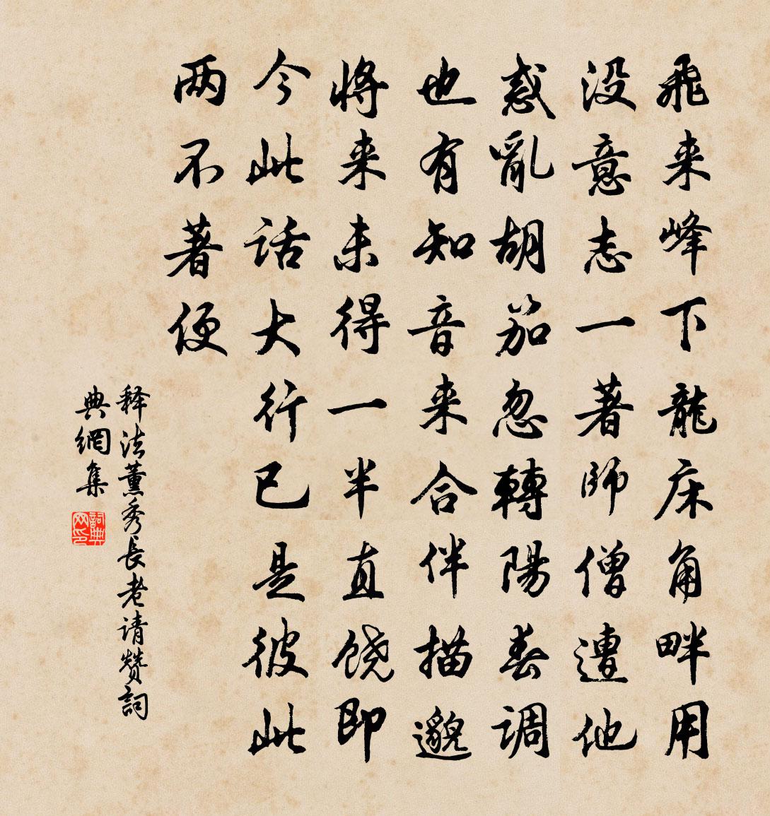 詩詞名句歷史字典書法欣賞書法字典國語詞典說文解字康熙字典古漢語字典標 題 作 者 詩 句 秀長老請贊作者:釋法薰 朝代:宋代秀長老請贊原文飛來峰下,龍床角畔。用沒意志一著,師僧遭他惑亂。胡笳忽轉陽春調,也有知音來合伴。描邈將來,未得一半。直饒即今此話大行,已是彼此兩不著便。詩詞問答問:秀長老請贊的作者是誰?答:釋法薰問:秀長老請贊寫於哪個朝代?答:宋代釋法薰秀長老請贊書法欣賞秀長老請贊書法作品詩詞推薦聞杜鵑張榘〔宋代〕流落江南帝魄痴,年年啼到綠陰肥。蜀山邈在青天外,只勸人歸不自歸。西省北院新構小亭種竹開窗東通騎省…隔窗小飲各題四韻白居易〔唐代〕結托白須伴,因依青竹叢。題詩新壁上,過酒小窗中。深院晚無日,虛檐涼有風。金貂醉看好,回首紫垣東。驪駒詩佚名〔先秦〕驪駒在門。僕夫具存。驪駒在路。僕夫整駕。春秋戰國門楊回周曇〔唐代〕三逐鄉閭五去君,莫知何地可容身。楊回不是逢英鑒,白首無成一旅人。浪淘沙·一泊沙來一泊去白居易〔唐代〕一泊沙來一泊去,一重浪滅一重生。相攪相淘無歇日,會教東海一時平。次韻子瞻山村五絕蘇轍〔宋代〕塍間白水細無聲,日暖泥融草不生。似恐田家忘帝力,多差使者出催耕。朝謁太清宮九首真宗〔宋代〕邈矣道祖,冥機惚恍。常德不離,至真無象。引位清穹,降祥神壤。酌楝薦誠,控飈來享。賀阮亭三十陳維崧〔清代〕牛馬江東走。陪滿座、鄒枚上客,為君稱壽。七葉貂禪連鳳闕,坐擁銀箏翠袖。又兄弟、才雄八斗。三十王郎正年失調名佚名〔宋代〕不如柳絮,穿簾透幕,飛到伊行。和師厚郊居示里中諸君黃庭堅〔宋代〕籬邊 * 關心事,窗外青山不世情。江橘千頭供歲計,秋蛙一部洗朝酲。歸鴻往燕競時節,宿草新墳多友生。身後題儀真常平倉壁劉宰〔宋代〕苦被微官縛此身,汗衣亭午亞紅塵。維舟醉臥垂楊下,輸與江湖自在人。和張規臣水墨梅五絕陳與義〔宋代〕含章檐下春風面,造化功成秋兔毫。意足不求顏色似,前身相馬九方皋。宿定林示無外王安石〔宋代〕天女穿林至,姮娥度隴來。欲歸今晼晚,相值且徘徊。誰謂我忘老,如聞蟲造哀。鄰衾亦不寐,共盡白雲杯。失調名仲殊〔宋代〕遙想天孫離別後,一宵歡會,暫停機杼。句張釜〔宋代〕登臨思渺然。三年冬大禮五首曹唐〔唐代〕皇帝齋心潔素誠,自朝真祖報昇平。華山秋草多歸馬,滄海寒波絕洗兵。銀箭水殘河勢斷,玉爐煙盡日華生。千官紹熙四年加上壽聖皇太后尊號八首佚名〔宋代〕熙辰禮備,濟濟雍雍。言奉斯冊,重親之宮。宮帷既敞,協氣感通。皇儀親展,壽祉無窮。偈頌六十七首釋原妙〔宋代〕水中鹹味,色里膠青。決定是有,不見其形。見其形,失卻山前一村人眼睛。送客不及劉筠〔宋代〕日上旗亭第五重,百壺春釀與誰同。黃山遠隔奔霽騎,紫塞孤飛避弋鴻。湘竹几時休染淚,楚旌終日自搖風。此情江上逢春張均〔唐代〕離憂耿未和,春慮忽蹉跎。擇木猿知去,尋泥燕獨過。驚花翻霽日,垂柳拂煙波。激意屢怡賞,無如鄉念何。名句推薦曲終人醉。多似潯陽江上淚。朱敦儒《減字木蘭花·劉郎已老》 白雪關山遠,黃雲海戍迷。李白《紫騮馬》 清明過了,不堪回首,雲鎖朱樓。朱淑真《眼兒媚·風日遲遲弄輕柔》 數樹梨花,晚風吹墮半汀鷺。吳文英《齊天樂·新煙初試花如夢》 天下無指者,生於物之各有名,不為指也。公孫龍《公孫龍子·指物論》 君子之德風,小人之德草,草上之風必偃。孔子弟子《論語·顏淵篇》 天下三分明月夜,二分無賴是揚州。徐凝《憶揚州》 小桃枝下試羅裳,蝶粉斗遺香。陳子龍《訴衷情·春遊》 男兒西北有神州,莫滴水西橋畔淚。劉克莊《玉樓春·戲林推》 丹楓萬葉碧雲邊,黃花千點幽岩下。張掄《踏莎行·秋入雲山》