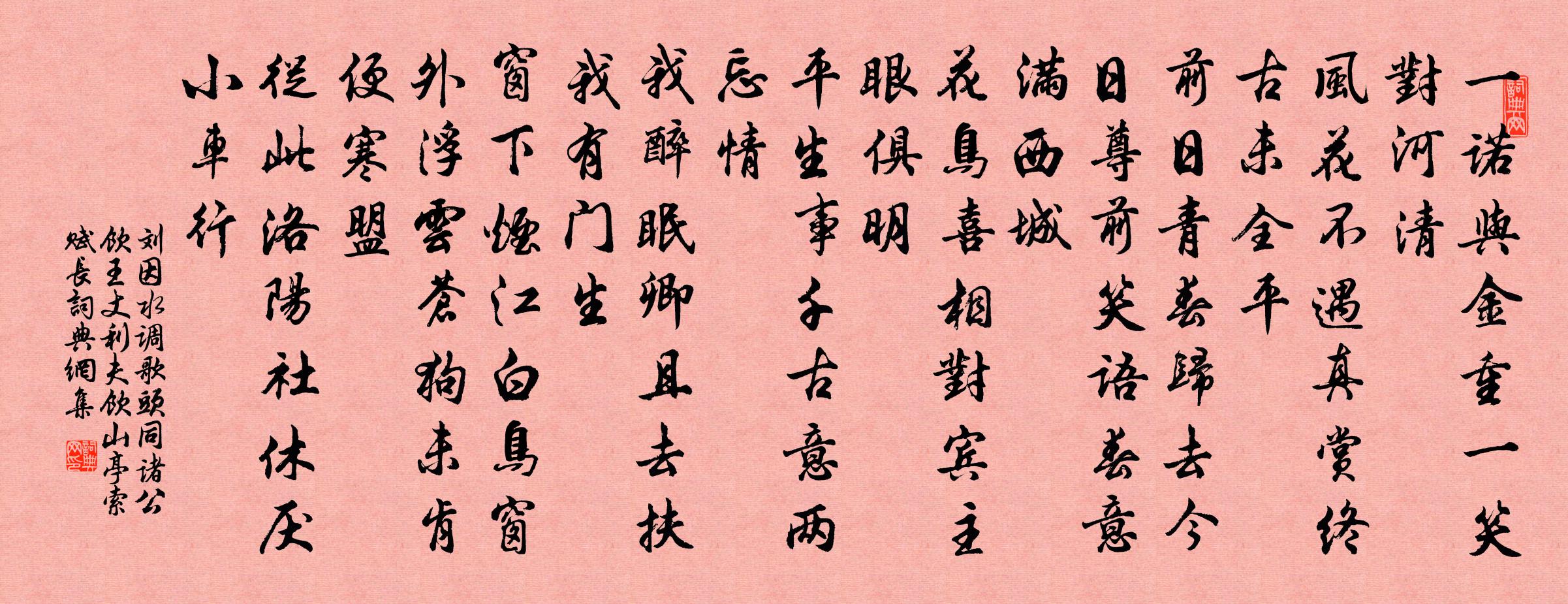 詩詞名句歷史字典書法欣賞書法字典國語詞典說文解字康熙字典古漢語字典標 題 作 者 詩 句 水調歌頭 同諸公飲王丈利夫飲山亭,索賦長作者:劉因 朝代:元代原文一諾與金重,一笑對河清。風花不遇真賞,終古未全平。前日青春歸去,今日尊前笑語,春意滿西城。花鳥喜相對,賓主眼俱明。平生事,千古意,兩忘情。我醉眠卿且去,扶我有門生。窗下煙江白鳥,窗外浮雲蒼狗,未肯便寒盟。從此洛陽社,休厭小車行。詩詞問答問:《水調歌頭 同諸公飲王丈利夫飲山亭,索賦長》的作者是誰?答:劉因問:該詩寫於哪個朝代?答:元代問:該詩是什麼體裁?答:詞書法欣賞水調歌頭 同諸公飲王丈利夫飲山亭,索賦長書法作品詩詞推薦題金華方韶卿在雅堂連文鳳〔宋代〕仲儀作楚奏,莊舄吟越聲。土風固爾殊,心事終當明。韶濩久不倫,矧復英與莖。正聲何寥寥,淫哇鳴縱橫。世有有寄魯交〔宋代〕思君又是東風起,樓倚浮雲目千里。芳草不知人斷腸,帶煙帶雨連春水。禪人請贊釋鹹傑〔宋代〕天無私蓋,地無私載,如何形容,生此奇怪。為僧不稟僧儀,學佛力破佛戒。鼓舌搖唇,叢林殃害。若無伽梨裹渾閨怨四首趙蕃〔宋代〕紅芳不可待,綠蔭忽已成。妾貌愧花好,郎姿如柳明。贈胡侍朗致仕溫良玉〔宋代〕送友長江上,長江水正平。岸花縈別恨,風柳蘊離情。子去添惆悵,人稱最老成。家鄉歸到日,童僕擁歡迎。嵩山十二首公路澗歐陽修〔宋代〕驅馬渡寒流,斷澗橫荒堡。槎危欲欹岸,花落多依草。擊汰翫游鯈,倒影看飛鳥。留連愛芳杜,漸下西峰照。法華院僧祖月寫余真戲贊周必大〔宋代〕老子七十七,到處遮人壁。住世更十年,化身千百億。寄孫山人儲光羲〔唐代〕新林二月孤舟還,水滿清江花滿山。借問故園隱君子,時時來往住人間。第一百四十卷十二時歌釋印肅〔宋代〕晡時申,衙鼓冬冬妙意新。括地該天人不會,如飄野馬入迷津。不敢相,勿疏親,露體堂堂絕翳塵。屠兒一念無諸臥陶軒黃庭堅〔宋代〕陶公白頭臥,宇宙一北窗。但聞窗風雨,平陸漫成江。卯金扛九鼎,把菊醉胡床。城南晁正字,國器無等雙。日月題錢靜觀江山萬里圖陳著〔宋代〕迢迢江山上,萬變紛起伏。中閒崛奇多,忽此入平沃。草對近或遠,來去自鳧鶩。宇宙本來寬,景物常滿目。看梅絕句陸游〔宋代〕梅花宜寒更宜陰,摩挲拄杖過溪尋。幽香著人索管領,不信如今鐵石心。和蠟梅詩吳則禮〔宋代〕江邊一樹垂垂花,酒杯曾覓黃公家。誰教五出作黃蠟,六出休論屬尤物。鼻端有竅儂自知,群兒空誦詩人詩。天公歸舍吟孔武仲〔宋代〕長堤蓋夾天溝,蓋浩蕩東風流。上有騎馬客,枯髯清兩眸。馬後無飛蓋,馬前無嗚騶。進無趑趄謁,退無輕俠游。鷓鴣天周紫芝〔宋代〕年少登高意氣多。黃花壓帽醉嵯峨。如今滿眼看華發,強拈茱萸奈老何。千壘岫,萬重波。一時分付與秦娥。明年瓶花李雲岩〔宋代〕點檢春風事,瓶花最可憐。本根不知處,猶自向人妍。浣溪沙(意在亭)葉夢得〔宋代〕休笑山翁不住山。二年偷向此中閒。歸來贏得鬢毛斑。瓮底新醅供酩酊,城頭曲檻俯淙潺。山翁老去此山間。句楊徽之〔唐代〕廢宅寒塘水,荒墳宿草煙。空城雀陳陶〔唐代〕古城濛濛花覆水,昔日住人今住鬼。野雀荒台遺子孫,千年飲啄枯桑根。不隨海燕柏梁去,應無玉環銜報恩。近村說之復兼二公而作圓機既同邪籍之契顯夫又與晁說之〔宋代〕波臣好盪箕風急,浮世誰為自必人。顧我高飛摧短翮,念君闊步躓長紳。一枝青桂憎兄好,三府丹書重友因。近接名句推薦大膽天下去得,小心寸步難行。馮夢龍《警世通言·卷二十一》 鶯啼燕語報新年,馬邑龍堆路幾千。皇甫冉《春思》 當時明月在,曾照彩雲歸。晏幾道《臨江仙·夢後樓台高鎖》 利之中取大,害之中取小。墨子《墨子·44章 大取》 知有兒童挑促織,夜深籬落一燈明。葉紹翁《夜書所見》 天地合而萬物生,陰陽接而變化起,性偽合而天下治。荀子《荀子·禮論》 飲馬渡秋水,水寒風似刀。王昌齡《塞下曲四首》 玉慘花愁出鳳城,蓮花樓下柳青青。聶勝瓊《鷓鴣天·別情》 莫笑農家臘酒渾,豐年留客足雞豚。陸游《游山西村》 疊嶂西馳,萬馬迴旋,眾山欲東。辛棄疾《沁園春·靈山齋庵賦時築偃湖未成》