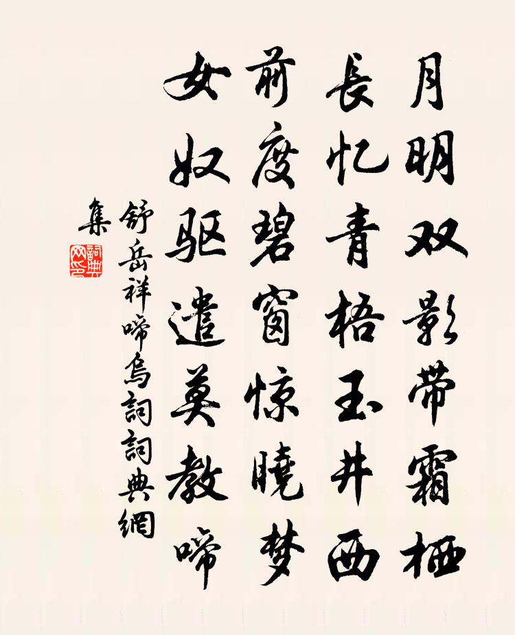 詩詞名句歷史字典書法欣賞書法字典國語詞典說文解字康熙字典古漢語字典標 題 作 者 詩 句 啼烏詞作者:舒岳祥 朝代:宋代啼烏詞原文月明雙影帶霜棲,長憶青梧玉井西。前度碧窗驚曉夢,女1~1奴驅遣莫教啼。詩詞問答問:啼烏詞的作者是誰?答:舒岳祥問:啼烏詞寫於哪個朝代?答:宋代舒岳祥啼烏詞書法欣賞啼烏詞書法作品詩詞推薦山樂官周文璞〔宋代〕山樂官,爾誰魂,逃河入海俱奔奔,伶倫梨園何可論。山樂官,予欲爾兮無言。如有言,不余歌雲門。寒夜懷友雜體二首王勃〔唐代〕北山煙霧始茫茫,南津霜月正蒼蒼。秋深客思紛無已,復值征鴻中夜起。復閤重樓向浦開,秋風明月度江來。故人眼兒媚(泊松洲)方岳〔宋代〕雁帶新霜幾多愁。和月落滄洲。桂花如許,菊花如許,怎不悲秋。江山例合閒人管,也白幾分頭。去年曾此,今年洛川懷古劉希夷〔唐代〕萋萋春草綠,悲歌牧征馬。行見白頭翁,坐泣青竹下。感嘆前問之,贈予辛苦詞。歲月移今古,山河更盛衰。晉家和開祖丹陽別子瞻後寄陳舜俞〔宋代〕仙舟系柳野橋東,會合情多勞謫翁。相對一樽浮蟻酒,輕寒二月小桃風。羈懷散誕謳歌里,世事縱橫醉笑中。莫恨秋途暮息曾豐〔宋代〕密密初秋雨,蒙蒙欲暮天。牛羊爭欲下,車馬敢求前。蟋蟀挑孤詠,梧桐攪獨眠。及身無一事,夢到汗漫邊。楊柳枝 贈雲中子蘇鉉馬鈺〔元代〕猛棄榮華兒女妻。悟玄機。騰騰兀兀任無為。做憨痴。雲水不游芳草徑,內行持。功成行滿獨何之。赴瑤池。王鞏屢約重九見訪,既而不至,以詩送將官梁蘇軾〔宋代〕知君月下見傾城,破恨懸知酒有兵。老守亡何惟日飲,將軍競病自詩鳴。花枝不共秋攲帽,筆陣空來夜斫營。愛惜又五言徐鉉〔唐代〕彩仗映花韉,春庭散曙煙。毬飛皆應手,馬駿不須鞭。仙樂飄雲外,祥風近日邊。籌多不虛發,制生在機先。題汪水雲詩卷十首胡斗南〔宋代〕篋里新詩意不傳,飄蓬白髮地行仙。江南江北都看了,更往西湖一百年。次韻徐中散丙寅二月見訪之什朱長文〔唐代〕數年解紱隱林扉,乘興頻來訪羽池。老似樂天兼少病,官如叔夜又能詩。身閒幸與耆英接,學淺虛蒙國士如。白雪送張子野知虢州先歸湖州梅堯臣〔宋代〕未赴虢太守,暫歸吳興家。吳興近洞庭,橘林正吹花。君當橘柚時,摘包帶霜華。清甘不楚齒,若酒傾殘霞。雞山賀新郎(和狄志父秋日述懷)廖行之〔宋代〕玉宇□蓬戶。渺涼聲、箾槮梧井,亂零楓浦。得得西山朝來爽,碧瘦千崖萬樹。清興在、煙霞深處。拄笏風流今誰贈別冀侍御崔司議陳子昂〔唐代〕有道君匡國。無悶( 一作機 )余在林。白雲峨眉( 一作岷峨 )上。歲晚來相尋。九日與友人登高鮑溶〔唐代〕雲木疏黃秋滿川,茱萸風裡一尊前。幾回為客逢佳節,曾見何人再少年。霜報征衣冷針指,雁驚幽夢淚嬋娟。古來寄蘭屋府教釋雲岫〔宋代〕入門便有湘江意,數米幽香見屈原。蕭艾若教同一色,清標不在座中看。宮中行樂詞其四李白〔唐代〕玉樹春歸日。金宮樂事多。後庭朝未入。輕輦夜相過。笑出花間語。嬌來竹下歌。 莫教明月去。留著醉嫦蛾。泛舟城南會者五人分韻賦詩得人皆若炎字四首蘇軾〔宋代〕城中樓閣似魚鱗,不見清風起白苹。試選苕溪最深處,仍呼我輩不羈人。窺船野鶴何曾下,見燭飛蟲空自馴。繞郭南鄉子 送李仲先還集慶 詞綜卷三十六唐桂芳〔元代〕社雨燕交飛。不解行人有別離。明月鳳凰台上酒,堪思。天闊雲昏海樹低。風正一帆遲。簾卷芙蓉江上移。去去霜瓜洲張蘊〔宋代〕如此江濤更有人,佛狸竟死不能兵。幅巾短櫂鷗前夢,未省當時有此城。名句推薦風雨端陽生晦冥,汨羅無處吊英靈。貝瓊《已酉端午》 至今雲雨帶愁容,月斜江上,征棹動晨鐘牛希濟《臨江仙·峭壁參差十二峰》 望處雨收雲斷,憑闌悄悄,目送秋光。柳永《玉蝴蝶·望處雨收雲斷》 雁柱十三弦,一一春鶯語。歐陽修《生查子·含羞整翠鬟》 不見穿針婦,空懷故國樓。孟浩然《他鄉七夕》 晴雲滿戶團傾蓋,秋水浮階溜決渠。杜甫《柏學士茅屋》 繡帳已闌離別夢,玉爐空裊寂寥香。馮延巳《浣溪沙·春到青門柳色黃》 似醉煙景凝,如愁月露泫。崔護《五月水邊柳》 亂離何處見,訊息苦難真。吳偉業《遇舊友》 城頭一片西山月,多少征人馬上看。李攀龍《塞上曲送元美》