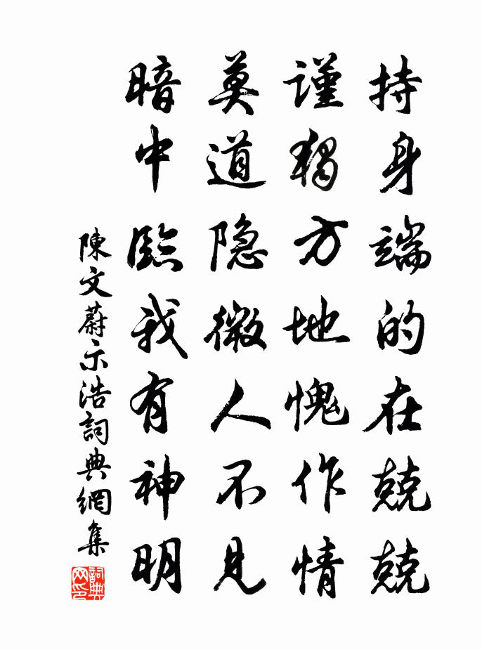 詩詞名句歷史字典書法欣賞書法字典國語詞典說文解字康熙字典古漢語字典標 題 作 者 詩 句 示浩作者:陳文蔚 朝代:宋代示浩原文持身端的在兢兢,謹獨方地愧作情。莫道隱微人不見,暗中臨我有神明。詩詞問答問:示浩的作者是誰?答:陳文蔚問:示浩寫於哪個朝代?答:宋代陳文蔚示浩書法欣賞示浩書法作品詩詞推薦送程孚叟知歸州蘇籀〔宋代〕岷江浮萬里,吳嶠駐彌年。笑理歸艎去,牢愁失眼前。德門桑梓盛,佳郡鶺鴒聯。委寄參羊陸,宜知備敵先。柳花侯畐〔宋代〕嫩水浴鳧芳草短,淡煙飛燕落花天。綠楊也識春來暖,一夜東風脫卻綿。鳳池小飲鄧肅〔宋代〕北山知有出郊心,為霽春寒十日陰。水石本為遷客共,一枝端欲寄深林。夜泊鷗磯楊萬里〔宋代〕峽中盡日沒人煙,船泊鷗磯也有村。已被子規酸骨死,今宵第一莫鳴猿。近者昌言多出諸賢之後有感一首高斯得〔宋代〕吾觀唐虞時,輔佐多也胄。一時謀謨嘉,十世典刑舊。古道日以衰,象賢始不懋。近者梧桐鳴,多出芝蘭秀。杜李七老會詩(渾年七十七)張渾〔唐代〕幽亭春盡共為歡,印綬居身是大官。遁跡豈勞登遠岫,垂絲何必坐谿磻。詩聯六韻猶應易,酒飲三杯未覺難。每況洞仙歌(柳)蔣捷〔宋代〕枝枝葉葉,受東風調弄。便是鶯穿也微動。自鵝黃千縷,數到飛綿,閒無事,誰管將春迎送。輕柔心性在,教得游次韻宇文贈趙宿州洪皓〔宋代〕尹京便可繼翁歸,暫向符離一馬麾。善撫新邊千里肅,復還舊治九重知。策勛久矣推多算,琢句飄然泯小疵。三事金縷曲(和潭東勸飲壽觴)劉辰翁〔宋代〕拍瓮春醅動。洞庭霜、厭綠堆黃,林苞堪貢。況有老人潭邊菊,搖落賞心入夢。數百歲、半來許中俗語中半。兒女彭城山徐兢〔宋代〕高館不知處,遊人空往還。亂鴉殘雪樹,荒冢夕陽山。贈江寧王高士梅堯臣〔宋代〕自古江南風俗美,喜君高趣慕先賢。藥無遠近寧論報,家有圖書不計錢。已住秦淮借風月,遍尋吳國舊山川。塵纓寄題左叔寶昆仲松竹書院曾豐〔宋代〕南窗晃郎宜春夏,松竹與君為大雅。雨雜吾伊聲灑灑,勸君讀書無苟且。北窗窈窕宜秋冬,松竹與君為大忠。風雜中夜陳舜俞〔宋代〕強寢夜何永,通宵夢不成。曉燈寒有暈,跳蚤靜聞聲。宦拙宜身退,家貧長道情。自憐前計失,半世慕虛名。單于川對雨二首蘇味道〔唐代〕崇朝遘行雨,薄晚屯密雲。緣階起素沫,竟水聚圓文。河柳低未舉,山花落已芬。清尊久不薦,淹留遂待君。飛雨九日岳陽待黃遂、張渙劉長卿〔唐代〕別君頗已久,離念與時積。楚水空浮煙,江樓望歸客。徘徊正佇想,仿佛如暫覿。心目徒自親,風波尚相隔。青林觀書梅堯臣〔宋代〕山陽女子大字書,不比常流事梳洗。親傳筆法中郎孫,妙作蠶頭魯公體。試寫麻牋滑似苔,黑蛟矯矯秋潭底。斫竹杜牧〔唐代〕寺廢竹色死,宦家寧爾留。霜根漸隨斧,風玉尚敲秋。江南苦吟客,何處送悠悠。句釋曉瑩〔宋代〕那敢謂長城。答魏子悌詩盧諶〔魏晉〕崇台非一{韓韋=余}。珍裘非一腋。多士成大業。羣賢濟弘績。遇蒙時來會。聊齊朝彥跡。顧此腹背羽。愧彼排感懷 其五王冕〔元代〕槲衣山中人,短髮披襟領。寸心雄萬夫,片語重九鼎。不作好顏色,遂與世俗迥。始旦旭日明,默默有深省。上愧名句推薦爭渡,爭渡,驚起一灘鷗鷺。李清照《如夢令·常記溪亭日暮》 語之所貴者意也,意有所隨。意之所隨者,不可言傳也。莊子《莊子·外篇·天道》 草滿池塘水滿陂,山銜落日浸寒漪。雷震《村晚》 為學不外靜敬二字,教人先去驕惰二字。王永彬《圍爐夜話·第一四八則》 新妝宜面下朱樓,深鎖春光一院愁。劉禹錫《和樂天春詞 / 春詞》 昔我往矣,楊柳依依。佚名《採薇》 為善則流芳百世,為惡則遺臭萬年。程登吉《幼學瓊林·卷三·人事》 李白乘舟將欲行,忽聞岸上踏歌聲。李白《贈汪倫》 黃河西來決崑崙,咆哮萬里觸龍門。李白《公無渡河》 貧而無諂,富而無驕孔子弟子《論語·學而篇》