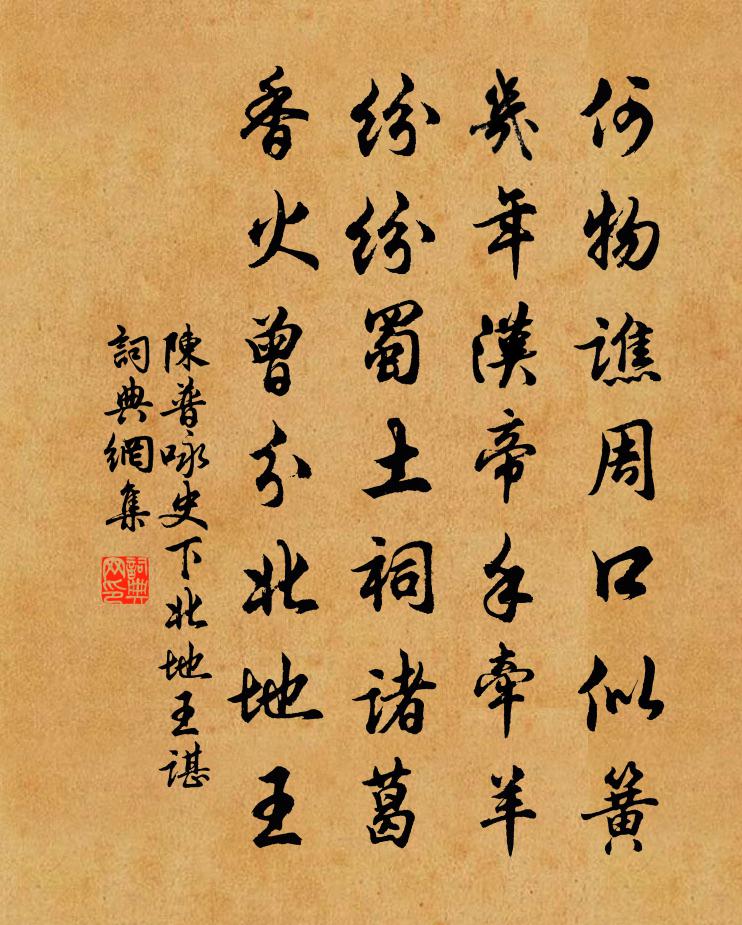 詩詞名句歷史字典書法欣賞書法字典國語詞典說文解字康熙字典古漢語字典標 題 作 者 詩 句 詠史下北地王諶作者:陳普 朝代:宋代詠史下北地王諶原文何物譙周口似簧,幾年漢帝手牽羊。紛紛蜀土祠諸葛,香火曾分北地王。詩詞問答問:詠史下北地王諶的作者是誰?答:陳普問:詠史下北地王諶寫於哪個朝代?答:宋代陳普詠史下北地王諶書法欣賞詠史下北地王諶書法作品詩詞推薦江城子 為祖母夫人八十之壽魏初〔元代〕如兒花額粉香勻。點妝新。看來真。八十風流,都屬太平人。長日篆煙琴一曲,瓶水暖,麝梅薰。酒烘仙頰暈微醺偈頌八首釋宗印〔宋代〕春山青,春水綠,春風包裹無纖粟。目前事,量外機,東村王老暗攢眉。暗攢眉,獨腳山魈舞柘杜枝。初得南園蘇轍〔宋代〕倒囊僅得千竿竹,掃地初開一畝宮。千里故園魂夢裡,百年生事寂寥中。晏家不願諸侯賜,顏氏終成陋巷風。洗竹贈蓑衣道人王之道〔宋代〕七年兩見西湖濱,似向賤貧求貴人。安民扶世在豪傑,貴人何必皆岩莘。嗟予坎壈今老矣,餬口相煎未能已。願君登真觀在利州嘉川縣西五里南臨宋江相傳雲張張嵲〔宋代〕天師羽化久,殊館臨官道。系馬松門深,風清亂蟬噪。開基今幾時,庭樹皆連抱。有池號遺履,無地尋丹灶。金像題宣州後堂壁四首張耒〔宋代〕過雨山亭暑氣微,老人猶未試生衣。滿園閒綠無人到,春日南風燕子飛。客以詩為東園飲不果次其韻二首陳造〔宋代〕春池照影紅錦衣,鴛鴦與鴨同低摧。金籠鸚鵡頗誶語,解道春色今寒灰。客來命笑還錯莫,此情不似君情薄。會須前此諸韓來飲獨仲連以小兒病不至明日仲連有梅堯臣〔宋代〕夜與賢豪飲,方聞默坐時。我斟相樂酒,君詠寄來詩。莫恨殊喧寂,真緣篤愛慈。何當因雪興,過此未應遲。和趙周錫制乾峽中韻四首袁說友〔宋代〕急峽高流日夜東,嵌空怪石浪穿礲。濤喧灘口波翻雪,雲斷山腰氣吐虹。幾陣堂堂峰硉矹,一泉滴滴水玲瓏。我行晚步門外散懷陸游〔宋代〕萬化紛紛本一機,不為腐骨欲安歸?彭殤共盡孰修短?堯桀兩忘無是非。濡首極知當痛飲,翦翎那復許群飛。江郊八陣磧孫應時〔宋代〕江近瞿唐急,沙從魚腹磺。千秋應有恨,八陳竟難平。望斷青煙晚,愁邊白鳥明。身微定何補,且復老躬耕。伐木黎廷瑞〔宋代〕牆角有惡木,據我千畝園。蔽虧日月光,壅遏雨露恩。其下草不殖,況乃蘭與蓀。蒼藤交龍蛇,護擁何雄尊。廚人圓禪者求頌釋正覺〔宋代〕枯歇身心百不思,湛圓自照劫空時。妙明智鑒那留垢,虛廓靈機未度絲。的的髑髏看活眼,堂堂塵剎用閒眉。是須送謝希孟歸黃岩四首陳傅良〔宋代〕法令如牛毛,斯鞅信手成。簿書積丘山,趙張眼愈明。萬人立下風,國勢尊且榮。未省三代前,誰獨有此名。和俞幾先喜雨二首曾協〔宋代〕萬人望歲正艱難,坐對盤餐泚在顏。沿泝謾談舟楫利,圃畦未放桔槔閒。歡呼甘雨今朝足,準擬豐年舊觀還。眼裹壽范漕吳泳〔宋代〕伏波老子縛長虬,典護蘭闈更兩秋。學問只從苗脈看,辭章不響語言求。俱稱腳跡門生好,無復顏行執事羞。夾袋文宣王及其弟子贊宋高宗〔宋代〕東平子產,性著盛時。奉師於塾,講道之微。答問其敏,婉妙以思。升降陛廉,尚想英姿。五日觀妓萬楚〔唐代〕西施謾道浣春紗,碧玉今時鬥麗華。眉黛奪將萱草色,紅裙妒殺石榴花。新歌一曲令人艷,醉舞雙眸斂鬢斜。誰道頌古一○一首釋子淳〔宋代〕水澄月滿道人愁,妙盡無依類莫收。劫外正偏兼帶路,不萌枝上辨春秋。讀秦紀陳恭尹〔清代〕謗聲易弭怨難除,秦法雖嚴亦甚疏。夜半橋邊哼孺子,人間猶有未燒書。名句推薦盡無言、閒品秦箏,淚滿參差雁呂渭老《薄倖·青樓春晚》 君子將說富貴,必勉於仁也。戴聖《大戴禮記·曾子制言中第五十五》 一春略無十日晴,處處浮雲將雨行。汪藻《春日·一春略無十日晴》 前村後壟桑柘深,東鄰西舍無相侵。貫休《春晚書山家屋壁二首》 音塵絕,西風殘照,漢家陵闕。李白《憶秦娥·簫聲咽》 燕子歸來依舊忙。憶君王,月破黃昏人斷腸。謝克家《憶君王·依依宮柳拂宮牆》 角聲吹徹小梅花。夜長人憶家。趙長卿《阮郎歸·客中見梅》 尋河愁地盡,過磧覺天低。岑參《磧西頭送李判官入京》 繞遍迴廊還獨坐。月籠雲暗重門鎖。蘇軾《蝶戀花·雨霰疏疏經潑火》 霧失樓台,月迷津渡。秦觀《踏莎行·郴州旅舍》