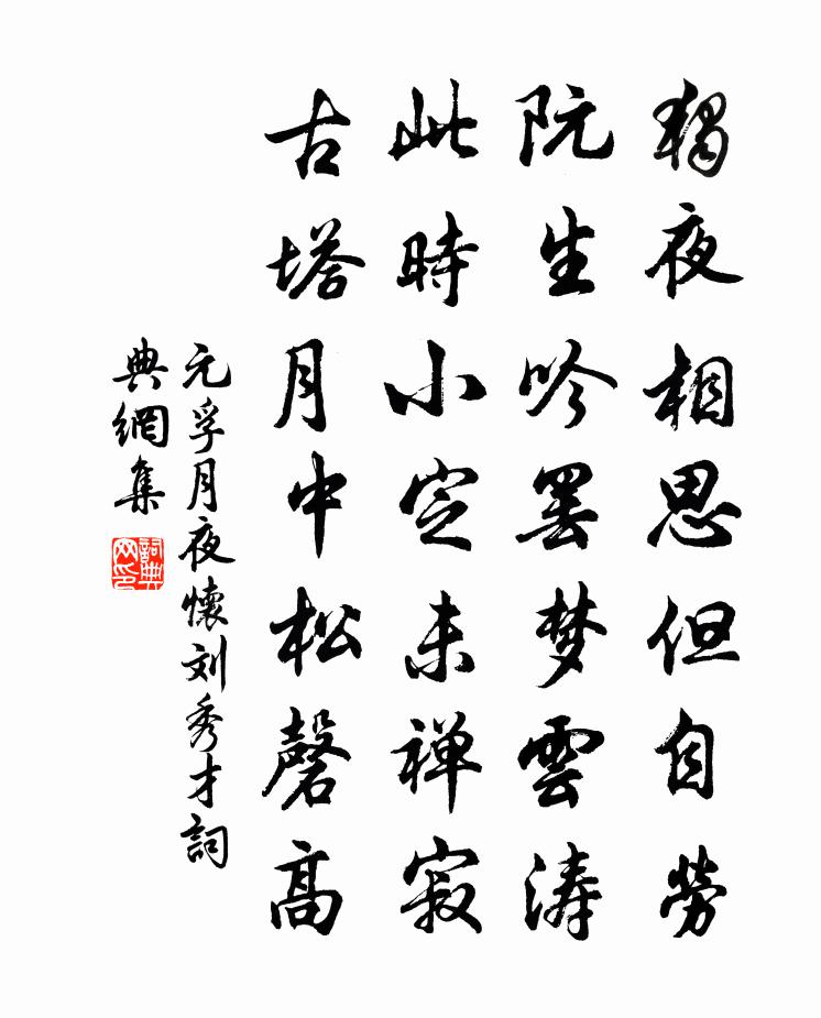 詩詞名句歷史字典書法欣賞書法字典國語詞典說文解字康熙字典古漢語字典標 題 作 者 詩 句 月夜懷劉秀才作者:元孚 朝代:唐代月夜懷劉秀才原文獨夜相思但自勞,阮生吟罷夢雲濤。此時小定未禪寂,古塔月中松磬高。詩詞問答問:月夜懷劉秀才的作者是誰?答:元孚問:月夜懷劉秀才寫於哪個朝代?答:唐代問:月夜懷劉秀才是什麼體裁?答:七絕元孚月夜懷劉秀才書法欣賞月夜懷劉秀才書法作品注釋全唐詩:卷823-10詩詞推薦嫦娥奔月 / 嫦娥飛天佚名〔兩漢〕昔者,羿狩獵山中,遇姮娥於月桂樹下。遂以月桂為證,成天作之合。 逮至堯之時,十日並出。焦禾稼,殺草有為予言烏龍高嶮不可到處有僧岩居不知其年陸游〔宋代〕樵子向予說,有僧巢翠微;岩扉雲共宿,錫杖鶴同飛。日暮松明火,天寒槲葉衣。棄官從此逝,非子尚誰歸?清平樂 九月回至隆興 隆興廳事壁間作六鶴圖劉敏中〔元代〕雲峰咫尺。竹靜芭蕉靜。鶴繞蒼苔行又立。不見高堂素壁。簿書*騎匆匆。暫時留住衰翁。一片歸心難畫,野亭繡橫吹曲辭。雨雪曲翁綬〔唐代〕邊聲四合殷河流,雨雪飛來遍隴頭。鐵嶺探人迷鳥道,陰山飛將濕貂裘。斜飄旌旆過戎帳,半雜風沙入戍樓。一自送杜起莘殿院出守遂寧陸游〔宋代〕羽檄聯翩晝夜馳,臣憂顧不在邊陲。軍容地密寧當議,陛下恩深不忍欺。白簡萬言幾慟哭,青編一傳可前知。平生中夜二首王令〔宋代〕晝日苦卒卒,忽焉不加思。長夜漫不眼,起復日所為。所為浩多愧,不與初心期。虛雲聖賢學,實從世俗歸。雖恥贈陳教諭熊禾〔宋代〕每惟斯道南,七閩小鄒魯。考亭四書學,日月行萬古。我生亦何幸,私淑欣有遇。南來證文獻,令人動遐慮。斯文竹友為徐南卿作姜夔〔宋代〕世路蒼黃總是愁,暮年須得小優遊。如今漸覺知心少,勝種青青伴白頭。送先侍者釋智愚〔宋代〕半 * 病未甦,出辯護人無力為三呼。諸方辣手如靈驗,秋晚應歸捋虎鬚。二月二十七日病後始能扶頭范成大〔宋代〕復幕重簾苦見遮,暮占棲雀曉占鴉。殘燈煮藥看成老,細雨鳴鳩過盡花。心為蚤衰元自化,發從無病已先華。更蒙野蠶李復〔宋代〕野蠶緣桑自成繭,群兒采繭殘桑枝。明年家蠶黑蟻出,四中桑死蠶忍飢。野繭更彩不滿筥,家蟻歲生無盡時。翁乎蟋蟀郭印〔宋代〕秋蟲推爾傑,風韻太粗生。衰草年年恨,寒砧夜夜聲。軸閒催婦織,衣薄念夫征。誰謂心如石,欹眠不掛情。僧惠白蓮李洪〔宋代〕拄頰看山暑頓空,修眉橫嶂障晴空。太真姊妹溫泉浴,竇氏兒郎丹桂風。古驛荒涼征騎還,里居好事古人同。明年病足戲效樂天體樓鑰〔宋代〕課得退連茹,蓬逢新太醫。居閒幸餘暇,養病任多時。步屧雖非便,調琴足自怡。曉來風雨急,高臥到晨炊。湖山雜賦陸游〔宋代〕不到梅山二十霜,望中常似隔他鄉。一杯甖粟紗燈下,最憶初寒宿上方。頌證道歌證道歌釋印肅〔宋代〕如來藏裹親收得,隨時影現青黃白。珠體元無一色同,無端也被溈山索。山中酬江州崔使君見寄白居易〔唐代〕眷眄情無恨,優容禮有餘。三年為郡吏,一半許山居。酒熟心相待,詩來手自書。庾樓春好醉,明日且回車。和九日從楊氏姊游權德輿〔唐代〕秋光風露天,令節慶初筵。易象家人吉,閨門女士賢。招邀菊酒會,屬和柳花篇。今日同心賞,全勝落帽年。次韻經略吳及石門洞杜於能〔宋代〕桂風泛泛桂江流,南師旌牙喜訪求。詩刻蒼崖留篆在,雲生纖徑稱欄幽。而今入幕賓僚盛,又況褰帷政事修。更對宋江三十六贊龔開〔宋代〕東家之西,即西家東。汝雖待立,何有吾宮。名句推薦烏鳥之狡,雖善不親。不重之結,雖固必解管仲《管子·形勢》 歸來報名主,恢復舊神州。岳飛《送紫岩張先生北伐》 乖僻自是,悔誤必多;頹惰自甘,家道難成。朱柏廬《朱子家訓·全文》 阿婆還似初笄女,頭未梳成不許看。袁枚《遣興》 隔岸荒雲遠斷,繞磯小樹微明。歸莊《錦堂春·半壁橫江矗起》 滾滾長江東逝水,浪花淘盡英雄。楊慎《臨江仙·滾滾長江東逝水》 牧童騎黃牛,歌聲振林樾。袁枚《所見》 落花水香茅舍晚,斷橋頭賣魚人散。馬致遠《壽陽曲·遠浦帆歸》 久在樊籠里,復得返自然。陶淵明《歸園田居·其一》 黃河捧土尚可塞,北風雨雪恨難裁。李白《北風行》