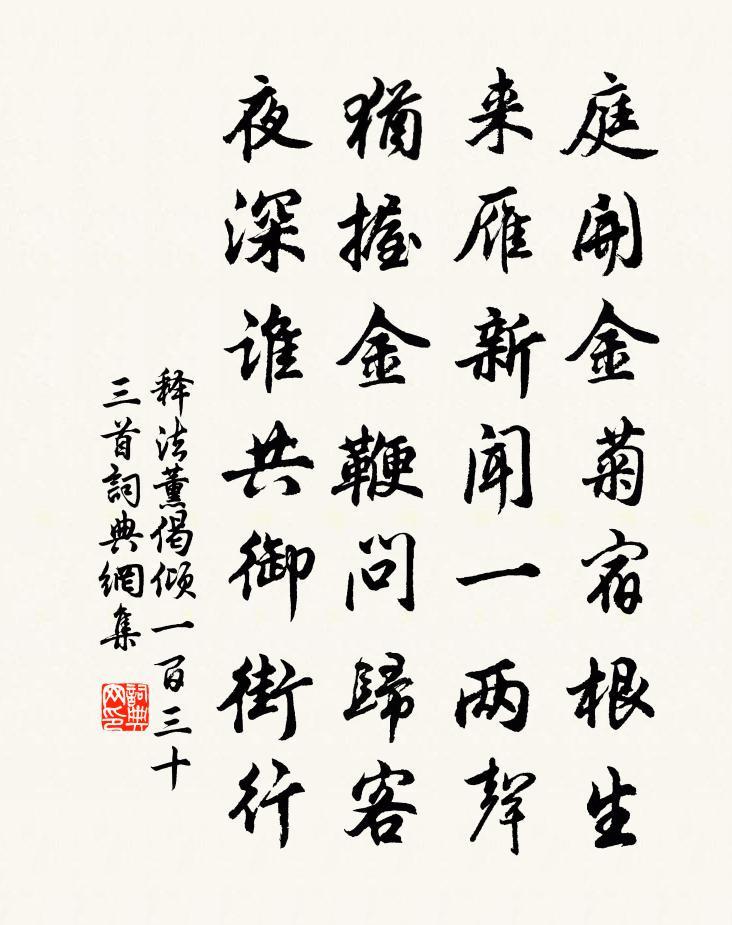 詩詞名句歷史字典書法欣賞書法字典國語詞典說文解字康熙字典古漢語字典標 題 作 者 詩 句 偈傾一百三十三首作者:釋法薰 朝代:宋代偈傾一百三十三首原文庭開金菊宿根生,來雁新聞一兩聲。猶握金鞭問歸客,夜深誰共御街行。詩詞問答問:偈傾一百三十三首的作者是誰?答:釋法薰問:偈傾一百三十三首寫於哪個朝代?答:宋代釋法薰偈傾一百三十三首書法欣賞偈傾一百三十三首書法作品詩詞推薦輦下言懷喻良能〔宋代〕馬蹄重踏帝京塵,七載江湖飽問津。白髮有人疑甲子,清齋無日不庚申。不才詎敢誣明主,厚祿那能羨故人,乞得再用舊韻寄孔毅甫黃庭堅〔宋代〕鑒中之發蒲柳望秋衰,眼中之人風雨俱星散。往者托禮同青山,健者漂零不相見。庾公樓上有詩人,平生落筆瀉河寄童梅岩顧逢〔宋代〕數盡寒更六十點,鐘聲聽了又雞催。枕間展轉不得睡,底事故人猶未來。再上湘江柳宗元〔唐代〕好在湘江水,今朝又上來。不知從此去,更遣幾年回。雜劇·救孝子賢母不認屍佚名〔元代〕第一折(沖末扮王脩然領張千上,雲)老夫乃王脩然是也,自出身以來,跟隨郎主,累建奇功。謝聖恩可憐,官拜登戲馬台作儲光羲〔唐代〕君不見宋公仗鉞誅燕後,英雄踴躍爭趨走。小會衣冠呂梁壑,大征甲卒碻磝口。天鬥神武樹元勛,九日茱萸饗六軍途次近蜀驛蒙恩賜寶刀及飛龍廄馬…寄中書李鄭二公武元衡〔唐代〕草草事行役,遲遲違故關。碧幃遙隱霧,紅旆漸依山。感激酬恩淚,星霜去國顏。捧刀金錫字,歸馬玉連環。威鳳蝶戀花蕭允之〔宋代〕十幅歸帆風力滿。記得來時,買酒朱橋畔。遠樹平蕪空目斷。亂山惟見斜陽半。誰把新聲翻玉管。吹過滄洲,多少游清都觀尋沈道士得清字許敬宗〔唐代〕幽人蹈箕潁,方士訪蓬瀛。豈若逢真氣,齊契體無名。既詮眾妙理,聊暢遠遊情。縱心馳貝闕,怡神想玉京。或命寺前書院中寄季平鄭剛中〔宋代〕已投幽僻避塵坌,更向檐頭著小門。滿案韋編供白書,一爐柏子對黃昏。後生秀爽慚無補,舊學荒涼喜再溫。此外別帥垣登泝江程公許〔宋代〕輥來偶作兩旬留,下榻慚非孺子儔,西閣夜闌猶跋燭,北岩晚霽趣歸舟。高城回首煙波暝,短棹支頤水國秋。歲晚汝州等慈寺閣望嵩岳梅堯臣〔宋代〕崢嶸古寺閣,蒼山插晴檐。少室出天外,巍巍何尊嚴。王都在其下,風露國所沾。日暮飛雲歸,已失中頂尖。鴛鴦湖棹歌 之九十七朱彝尊〔清代〕舍南舍北繞春流,花外初鶯囀未休。畢竟林塘輸甪里,愛攜賓客醉山樓。 偈頌一百零一首釋慧性〔宋代〕丹霞燒木佛,院主眉須落。兩個無孔鐵錐,彼此將錯就錯。焦磚打著連底凍,笑它普化搖鈴鐸。袁高給事石介〔宋代〕擲毫不肯草絲綸,宰相難巡命別人。明日執迥盧杞制,始知唐室有忠臣。春雨陸游〔宋代〕江頭一夜雨,曉路無新花。我今為陳人,感此重嘆嗟。羲和挾兩曜,疾走不可遮。古今俛仰間,那暇惜物華。祭神州樂章。肅和佚名〔唐代〕大矣坤儀,至哉神縣。包含日域,牢籠月竁。露絜三清,風調六變。皇祇介祉,式歆恭薦。舟中雜紀 其一王冕〔元代〕水竹連平野,人家帶夕陽。道途忘險阻,風景異尋常。借艇移行李,持杯看步光。英雄無所似,堪笑老夫狂。即事寄人楊凌〔唐代〕中禁鳴鐘日欲高,北窗欹枕望頻搔。相思寂寞青苔合,唯有春風啼伯勞。邊城作薛能〔唐代〕行止象分符,監州是戲儒。管排蠻戶遠,出箐鳥巢孤。北向秦何在,南來蜀已無。懷沙悔不及,只有便乘桴。名句推薦紛紛墜葉飄香砌。夜寂靜,寒聲碎。范仲淹《御街行·秋日懷舊》 能近取譬,可謂仁之方也已。孔子弟子《論語·雍也篇》 應無所住而生其心。鳩摩羅什譯《金剛經·莊嚴淨土》 少年聽雨歌樓上。紅燭昏羅帳。蔣捷《虞美人·聽雨》 陽春布德澤,萬物生光輝。佚名《長歌行》 秦地羅敷女,採桑綠水邊。李白《子夜吳歌·春歌》 千古江山,英雄無覓孫仲謀處辛棄疾《永遇樂·京口北固亭懷古》 行得春風,指望夏雨馮夢龍《警世通言·卷二十五》 知而弗為,莫如勿知;親而弗信,莫如勿親。佚名《孔子家語·子路初見》 翠貼蓮蓬小,金銷藕葉稀。李清照《南歌子·天上星河轉》