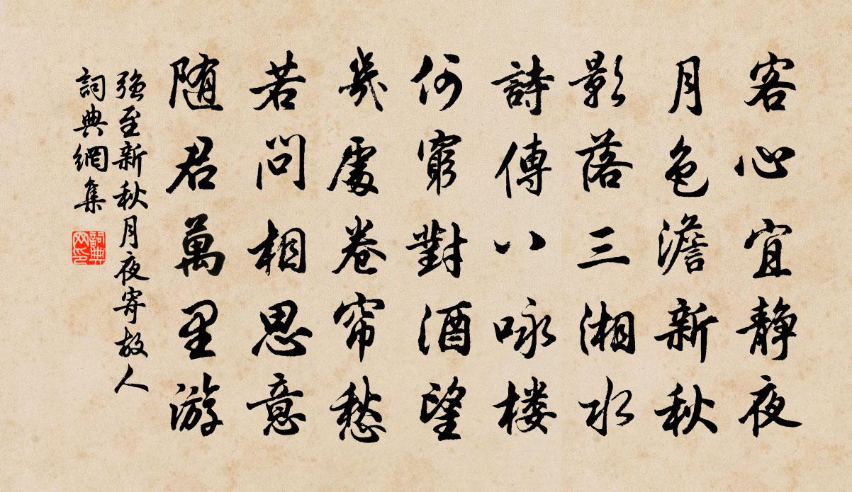 詩詞名句歷史字典書法欣賞書法字典國語詞典說文解字康熙字典古漢語字典標 題 作 者 詩 句 新秋月夜寄故人作者:強至 朝代:宋代新秋月夜寄故人原文客心宜靜夜,月色澹新秋。影落三湘水,詩傳八詠樓。何窮對酒望,幾處捲簾愁。若問相思意,隨君萬里游。詩詞問答問:新秋月夜寄故人的作者是誰?答:強至問:新秋月夜寄故人寫於哪個朝代?答:宋代問:新秋月夜寄故人是什麼體裁?答:五律強至新秋月夜寄故人書法欣賞新秋月夜寄故人書法作品詩詞推薦西江月(一名白蘋香,一名步虛詞)歐陽炯〔唐代〕月映長江秋水,分明冷浸星河。淺沙汀上白雲多,雪散幾叢蘆葦。扁舟倒影寒潭,煙光遠罩輕波。笛聲何處響漁歌臨終詩薛準〔唐代〕舊國深恩不易酬,又離繼母出他州。誰知天怒無因息,積愧終身乞速休。驀山溪(壽熊尚友)佚名〔宋代〕四時美景,最好惟春晝。仙誕彌辰,況還當、中春時候。日遲風軟,是處靄晴煙,桃散錦,柳搖金,交映門庭秀。醉梅花/鷓鴣天盧祖皋〔宋代〕傳得西林一派清。年華垂過欠官稱。居無多地花常好,客有來時鶴自鳴。分蕊館,駐箳星。齊眉相對眼尤明。弄孫喜雨陸游〔宋代〕去年禹廟歸梅梁,今年黑虹見東方。巫言當豐十二歲,父老相告喜欲狂。插秧正得十日雨,高下到處水滿塘。六月東湖第三溪戴表元〔宋代〕日晏霜濃十二月,林疏石瘦第三溪。雲沙有徑縈寒燒,松屋無人鳴書雞。幾聚衣冠塊作土,當年歌舞醉如泥。早知導引 正隆六年六月駕幸南京林鐘宮佚名〔宋代〕神宮壯麗,宮殿壓蓬萊。向曉九門開。聖明天子初巡幸,遙駕六龍來。五雲影里排仙仗,清蹕絕塵埃。都人齊唱升游雲光寺李提舉領客將至留二小詩周必大〔宋代〕作者正七人,飲中空八仙。長齋詎容醉,晉也合逃禪。木文真人章聖朝合州進到其事甚怪至京其木中李廌〔宋代〕犀視月通角,蟬想丸目入。果臝祝螟蛉,天風化陰鶂。物變知品殊,尚可易形質。真人友造化,故與物為一。持此朋黨論歐陽修〔宋代〕臣聞朋黨之說,自古有之,惟幸人君辨其君子小人而已。大凡君子與君子以同道為朋,小人與小人以同利為朋,此武陵桃源送人包融〔唐代〕武陵川逕入幽遐,中有雞犬秦人家。先時見者為誰耶?源水今流桃復花。新居秋夕寄李廓姚合〔唐代〕羈滯多共趣,屢屢同室眠。稍暇更訪詣,寧唯候招延。愧君備蔬藥,識我性所便。罷吏童僕去,灑掃或自專。古巷偈頌二十一首釋智愚〔宋代〕憂民恤物斂天威,坐斷乾坤肅四夷。先放臘梅凝瑞雪,次教春色到瑤池。三吳漫遊集唐方鳳〔宋代〕愁看直北是長安,雲樹深深碧殿寒。心折此時無一寸,夢魂不到關山難。寄元齡弟五首裘萬頃〔宋代〕餘生端合老吾廬,心地全然與世疎。安得數椽西嶺下,自行溪水灌園蔬。醉桃源王吉昌〔元代〕武曲廉貞武廉幽貫地天根。綿綿息若存。六天交戰定朝昏。丹爐火力溫。驅神窟,養生門。玄功主掌尊。牝關天閉丙寅十四首效韋蘇州黃庭堅〔宋代〕漸嘉樓外花,嘉賞亭邊柳。作者歸山丘,今春為誰有。千秋萬歲後,還復來游否。挽趙南塘方大琮〔宋代〕晚起蘇公以禮郎,侍經掌制位文昌。端平氣脈真堪寄,元佑光陰惜未長。馬邑深憂形諫墨,鸞台寧徙恥書黃。門生夏樹文同〔宋代〕夏樹始繁密,條縷方且柔。左右覆吾廬,合如張碧油。新蟬噪晴午,餘響藏深幽。軒窗轉炎日,清影為我留。蚊蚋短歌行陸機〔魏晉〕置酒高堂,悲歌臨觴。人壽幾何,逝如朝霜。時無重至,華不再陽。苹以春暉,蘭以秋芳。來日苦短,去日苦長。名句推薦酒醒人靜奈愁濃。殘燈孤枕夢,輕浪五更風。徐昌圖《臨江仙·飲散離亭西去》 雁字無多,寫得相思幾許。周密《掃花游·九日懷歸》 黃埃散漫風蕭索,雲棧縈紆登劍閣。白居易《長恨歌》 墉集欺貓鼠,林藏逐雀鸇。徐威《中秋詠懷借杜子美秋日述懷一百韻和寄柳州假鳴桑先生》 戎馬關山北,憑軒涕泗流。杜甫《登岳陽樓》 至今雲雨帶愁容,月斜江上,征棹動晨鐘牛希濟《臨江仙·峭壁參差十二峰》 木謂之華,草謂之榮。佚名《爾雅·釋草》 同居長乾里,兩小無嫌猜。李白《長干行二首》 舍心腹而順手足羅貫中《三國演義·第二十三回》 千尺陰崖塵不到,惟有層冰積雪。辛棄疾《賀新郎·用前韻送杜叔高》