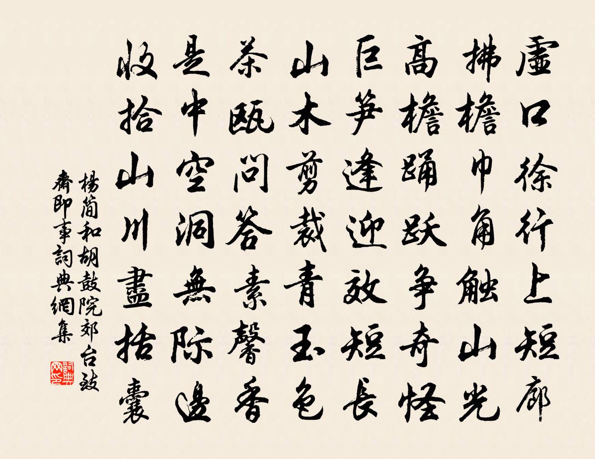 詩詞名句歷史字典書法欣賞書法字典國語詞典說文解字康熙字典古漢語字典標 題 作 者 詩 句 和胡鼓院郊台致齋即事作者:楊簡 朝代:宋代和胡鼓院郊台致齋即事原文虛口徐行上短廊,拂檐巾角觸山光。高檐踴躍爭奇怪,巨筍逢迎效短長。山木剪裁青玉色,茶甌問答素馨香。是中空洞無際邊,收拾山川盡括囊。詩詞問答問:和胡鼓院郊台致齋即事的作者是誰?答:楊簡問:和胡鼓院郊台致齋即事寫於哪個朝代?答:宋代楊簡和胡鼓院郊台致齋即事書法欣賞和胡鼓院郊台致齋即事書法作品詩詞推薦疇依王柏〔宋代〕至哉子思,憂道失傳。推本遺訓,中庸一編。提挈網維,開示蘊奧。無聲無臭,熟窺其妙。謝李兼善書庫寄近作袁說友〔宋代〕筆下陳無己,香分一瓣奇。有孫今見嫡,得髓政忘皮。懷舊書來日,驚人語妙時。猶思頻咀嚼,咽子百篇詩。當窗織王建〔唐代〕嘆息復嘆息,園中有棗行人食。貧家女為富家織。翁母隔牆不得力。水寒手澀絲脆斷,續來續去心腸爛。草蟲促促未試即事雜書率用秋日同文館為首句三首鄧忠臣〔宋代〕秋日同文館,沉沉鎖棘闈。捲簾襟乍快,欹枕夢先歸。驟雨憂環堵,迴風喜袷衣。十年經五試,撫事意多違。次韻劉耘廬趙文〔宋代〕江南有故事,極熱介秋夏。空齋得幽景,眾綠天所畫。對景愜余情。談文及茲暇。山風吹池月,不似城中夜。百年寄樓子山雲棲上人劉得仁〔唐代〕一室鑿崔嵬,危梯疊蘚苔。永無塵事到,時有至人來。澗谷冬深靜,煙嵐日午開。修身知得地,京寺未言回。張端義應詔上書謫曲江正月一日贛州相遇戴復古〔宋代〕正朝送遷客,好去看梅花。此嶺幾人過,念君雙鬢華。直言知為國,遠地莫思家。韶石叫虞舜,傷哉古道賒。幽居華岳〔宋代〕莫問門無長者車,只圖深巷樂樵漁。一園黃落食無限,萬壑碧蓑衣有餘。雁足北來歸訊杳,馬蹄南去故人疏。東風上劉左史二首釋寶曇〔宋代〕不為窮愁始著書,一燈今與影同孤。從公亟欲問奇字,隨世無因識故吾。賴有霜鍾當北道,不應璧月自西湖。舉頭清平樂(題倦耕圖)張炎〔宋代〕一犁初卸。息影斜陽下。角上漢書何不掛。老子近來慵跨。煙村草樹離離。臥看流水忘歸。莫飲山中清味,怕教洗頌古八首釋深〔宋代〕行喝也打,禮拜也打。臨濟大師,可知禮也。次韻遣懷洪咨夔〔宋代〕不用憂春雨,時來百草芳。貓頭肥可臿,雀舌嫩堪囊。舊酒聞香烈,新詩索味長。櫻桃空落去,吾老白雲鄉。沁園春李道純〔元代〕曲徑旁蹊,三百六十,門門不同。若泥在一身,終須著物,離於形體,又屬頑空。無有兼行,如何下手,兩下俱捐奇都管請贊釋惟一〔宋代〕牧以卑,守以規,迅雷疾風,鐵石不移。須彌其頹,只手力持。電光石火里軀耕奪食,春風和氣中摧枯拉萎。極等讀友人詩卷杜荀鶴〔唐代〕冰齒味瑤軸,只應神鬼知。坐當群靜後,吟到月沈時。雪峽猿聲健,風檉鶴立危。篇篇一字字,誰復更言詩。閒居作皇甫冉〔唐代〕多病辭官罷,閒居作賦成。圖書唯藥籙,飲食止藜羹。學謝淹中術,詩無鄴下名。不堪趨建禮,詎是厭承明。已輟簡航禪師吳則禮〔宋代〕縱橫古帙散繩床,臥對疏簾卷夕陽。春去殘花已無蹤,娟娟新綠上篔簹。【雙調】駐馬聽近鄭光祖〔元代〕秋閨財葉將殘,雨霽風高摧木杪;江鄉瀟灑,數株衰柳罩平橋。露寒波冷翠荷凋,霧濃霜重丹楓老。暮雲收,晴虹湓城贈別陳陶〔唐代〕楚岸青楓樹,長隨送遠心。九江春水闊,三峽暮雲深。氣調桓伊笛,才華蔡琰琴。迢迢嫁湘漢,誰不重黃金。鷓鴣天(范靜州良輔生日十月二十一日二十三日交十一月節)魏了翁〔宋代〕誰把璿璣運化工。參旗又掛玉梅東。三三律琯聲余亥,九九玄經卦起中。新歲月,舊遊從。一觴還似去年冬。人間名句推薦高齋今夜雨,獨臥武昌城。徐禎卿《在武昌作》 冰雪林中著此身,不同桃李混芳塵;王冕《白梅》 綠葉兮素華,芳菲菲兮襲予;屈原《九歌》 枯藤老樹昏鴉,小橋流水人家,古道西風瘦馬。馬致遠《天淨沙·秋思》 縱使文章驚海內,紙上蒼生而已。龔自珍《金縷曲·癸酉秋出都述懷有賦》 王者之宰民也,莫不同四海,一遠近, 為父母而子之。令狐德棻《周書·本紀·卷四》 啼時驚妾夢,不得到遼西。金昌緒《春怨 / 伊州歌》 鵲辭穿線月,花入曝衣樓。李賀《七夕》 深林人不知,明月來相照。王維《竹里館》 日暮平沙秋草亂,一雙白鳥避人飛。袁宏道《感事·湘山晴色遠微微》