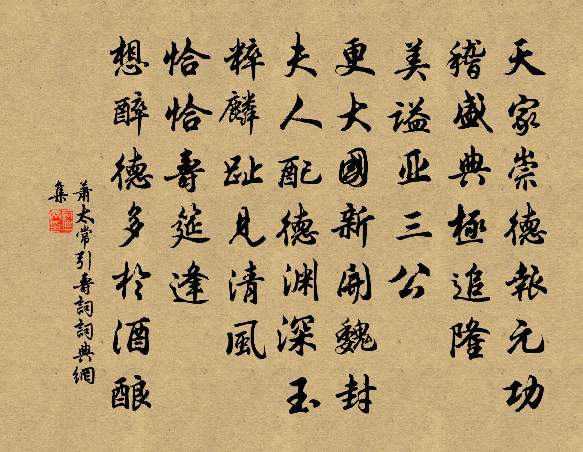 詩詞名句歷史字典書法欣賞書法字典國語詞典說文解字康熙字典古漢語字典標 題 作 者 詩 句 太常引 壽詞作者:蕭 朝代:元代太常引 壽詞原文天家崇德報元功。稽盛典,極追隆。美謚亞三公。更大國、新開魏封。夫人配德,淵深玉粹,麟趾見清風。恰恰壽筵逢。想醉德、多於酒釀。詩詞問答問:太常引 壽詞的作者是誰?答:蕭問:太常引 壽詞寫於哪個朝代?答:元代問:太常引 壽詞是什麼體裁?答:詞蕭太常引 壽詞書法欣賞太常引 壽詞書法作品詩詞推薦日鑄山中阻雪釋文珦〔宋代〕來訪幽人宿,春風未變和。水聲依澗遠,雪意向山多。坡竹摧新粉,杉失舊柯。山童曉相報,鹿跡夜曾過。太甲山汪應辰〔宋代〕君王自古幸游多,未必南從山澗阿。龍虎真藏金鼎火,鳳凰從食玉山禾。雲霞落日舒旗幟,琪樹西風響佩珂。伊尹荒亭晚坐王禹偁〔宋代〕荒亭秋日沉,獨坐白頭吟。為郡殊無味,歸田素有心。鵲翻楓葉亂,蛬響菊叢深。微物休相聒,幽懷老不禁。別晦庵趙蕃〔宋代〕身墮南州已覺賒,五溪從此更天涯。別腸何止成萬轉,霜鬢不堪今半加。頗念客留同此日,絕憐歸夢每還家。公如儒富莊謝枋得〔宋代〕東觀群儒作好官,束書不許散人看。何時遂作西林友,讀得韓文熟已難。臨江仙(和元規覽楊羲傳)張繼先〔宋代〕自古清真靈妙降,安妃來就楊君。因緣冥會異常倫。仙風聊設相,真道本無親。惟有元規能訪問,深將此意相聞。八月韓淲〔宋代〕山林風雨便清涼,待把鄰家社瓮嘗。到手自應無美惡,回頭誰解別斟量。深居但覺秋聲起,熟睡焉知夜漏長。未老欲晚訪韓持國忽道損見過不克往持國示詩因答梅堯臣〔宋代〕西雲沈日腳,命仆駕我車。我車已在庭,有客方詣廬。談笑不覺夕,雞黍且煩渠。重約勿以怪,但當摘園蔬。送顧秘書獻書後歸岳州盧綸〔唐代〕黃葉落不盡,蒼苔隨雨生。當軒置尊酒,送客歸江城。竹里聞機杼,舟中見弟兄。岳陽賢太守,應為改鄉名。頌古四十八首釋慧開〔宋代〕白日青天,夢中說夢。捏怪捏怪,誑謼一眾。十二月二十六日早起雪已三寸許夜來初不覺也虞儔〔宋代〕曉來眼界忽然新,一色瓊瑤與爛銀。人事乖時空請禱,天心回後只逡巡。不教三白孤殘臘,要與千家作好春。宿麥寓蓬萊館陸游〔宋代〕朱門高柳畫橋南,掠面風埃喜解驂。霽日偶逢春盎盎,野人不慣屋潭潭。堂中剩喜簪裾集,樓上時聞鼓角酣。明發再贈陳季張拒霜花二首之二黃庭堅〔宋代〕倒著接(上四下離)吾素風,當時酩酊似山公。且看小檻新花蕊,休泥他家晚菊叢。顧笑千金延客醉,解酲五斗為春晴一首蘇籀〔宋代〕高槐湯餅排朝饌,喜菊香菹芼戛羹。餉早趁墟樵墾計,澆春量腹聖賢並。無由屠嚼相親就,豈{左言右尼}奇章侈銅雀台(一作沈佺期詩)宋之問〔唐代〕昔年分鼎地,今日望陵台。一旦雄圖盡,千秋遺令開。綺羅君不見,歌舞妾空來。恩共漳河水,東流無重回。晚眺羅隱〔唐代〕憑古城邊眺晚晴,遠村高樹轉分明。天如鏡面都來靜,地似人心總不平。雲向嶺頭閒不徹,水流溪里太忙生。誰人醉花間·晴雪小園春未到馮延巳〔唐代〕晴雪小園春未到,池邊梅自早。高樹鵲銜巢,斜月明寒草。山川風景好,自古金陵道,少年看卻老。相逢莫厭醉金寄鄭薦玉項安世〔宋代〕鄭公身與我同寒,陸子泉頭隔幾山。為客蓋頭無一瓦,何時開眼見千間。非乾世俗人情薄,自是書生命運慳。三邑南湖溫庭筠〔唐代〕湖上微風入檻涼,翻翻菱荇滿回塘。野船著岸偎春草,水鳥帶波飛夕陽。蘆葉有聲疑霧雨,浪花無際似瀟湘。飄然念奴嬌丘崈〔宋代〕燭花漸暗,似夢來非夢,今夕何夕。簾幕生香人醉里,家住深深密密。松客難為,獨留無計,此意誰知得。相看無名句推薦與善人居,如入蘭芷之室,久而不聞其香,則與之化矣;與惡人居,如入鮑魚之肆,久而不聞其臭,亦與之化矣。劉向《說苑·雜言》 何當共剪西窗燭,卻話巴山夜雨時。李商隱《夜雨寄北》 輕舟泛月尋溪轉,疑是山陰雪後來李白《東魯門泛舟二首》 長風幾萬里,吹度玉門關。李白《關山月》 風摧寒棕響,月入霜閨悲。李白《獨不見》 君子少思長,則學;老思死,則教;有思窮,則施也。荀子《荀子·法行》 成人不自在,自在不成人。佚名《增廣賢文·下集》 雨洗娟娟淨,風吹細細香。杜甫《嚴鄭公宅同詠竹》 望天王降詔,早招安,心方足。宋江《滿江紅·喜遇重陽》 不似春風逞紅艷,鏡前空墜玉人釵。司空圖《華下對菊》