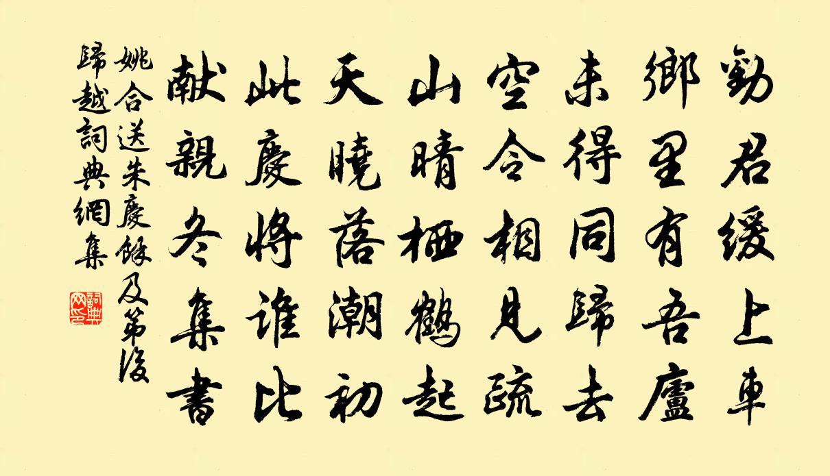 詩詞名句歷史字典書法欣賞書法字典國語詞典說文解字康熙字典古漢語字典標 題 作 者 詩 句 送朱慶餘及第後歸越作者:姚合 朝代:唐代送朱慶餘及第後歸越原文勸君緩上車,鄉里有吾廬。未得同歸去,空令相見疏。山晴棲鶴起,天曉落潮初。此慶將誰比,獻親冬集書。詩詞問答問:送朱慶餘及第後歸越的作者是誰?答:姚合問:送朱慶餘及第後歸越寫於哪個朝代?答:唐代問:送朱慶餘及第後歸越是什麼體裁?答:五律姚合送朱慶餘及第後歸越書法欣賞送朱慶餘及第後歸越書法作品注釋全唐詩:卷496-56詩詞推薦上已同沈虞卿、尤延之、王順伯、林景思游湖楊萬里〔宋代〕憑久欄乾可一桮,湖山飛入水中來。多情燕子能相勸,舞破東風去卻回。十五日別福昌因有所感。邵雍〔宋代〕連昌宮廢昌河在,事去時移語浪傳。下有荒祠難問處,古槐枝禿竹參天。清明日早出太平門蕭彥毓〔宋代〕江頭楊柳暗藏鴉,江上鵝兒浴淺沙。早起一風如此惡,路旁落盡刺桐花。少年行四首令狐楚〔唐代〕少小邊州慣放狂,驏騎蕃馬射黃羊。如今年老無筋力,猶倚營門數雁行。家本清河住五城,須憑弓箭得功名。等閒讀故許昌薛尚書詩集鄭谷〔唐代〕篇篇高且真,真為國風陳。澹薄雖師古,縱橫得意新。翦裁成幾篋,唱和是誰人。華岳題無敵,黃河句絕倫。吟殘水調歌頭(戊申和八窗叔為壽韻)李曾伯〔宋代〕壯志宮小鵬背,宮萬里欲乘宮風。馬瘏宮裘敝,老來無復舊遊重。楚尾吳頭蜀口,三十載間陳跡,袞袞水之東。休湖莊謝客曹彥約〔宋代〕漸撤疏籬短作垣,與春期約老田園。晴多易得花開早,地迥難藏鳥語喧。我欲偷安頻謝客,人誰見許數敲門。定知和秦壽之春晚偶成八絕王之道〔宋代〕官閒時醉秀溪春,醉里吟詩字字新。欲報自慚無好語,年來胸次亦埃塵。又次曾端伯春日韻四首郭印〔宋代〕瑞白春前已見三,向來膏雨物頻沾。山城二月寒猶峭,生怕東風巧揭簾。好事近蔡伸〔宋代〕花露滴香紅,花低漏聲初歇。人似一枝梅瘦,照冰壺清徹。翠娥雲鬢為誰容,蟲絲寶奩結。可惜一春憔悴,負滿懷玉照堂觀梅二十首張鎡〔宋代〕喜客能揮白玉琴,此花端解古時音。只防老鶴來偷聽,引起翻雲萬里心。久雨奉懷象之九兄韓維〔宋代〕蕭灑崔居士,高閒養性靈。涼風滿樽酒,永日一函經。竹色垂遮戶,桐花開滿庭。未嗟相見闊,交照本忘形。懷古題雪十首蘇武窖雪方鳳〔宋代〕子卿遠使匈奴國,持節堂堂不肯屈。置之深窖死為神,飢齧氈衣渴飲雪。但懷忠赤自通神,未必長伴羝為群。西風送徐涉南歸釋惟鳳〔宋代〕長安來雁急,相顧話離心。日落思家遠,天寒歸路深。秋光生獨樹,夕吹響孤砧。漸入雲鄉望,應無越客吟。雜興皎然〔唐代〕人生分已定,富貴豈妄來。不見海底泥,飛上成塵埃。焦仲卿妻楊維楨〔元代〕生為仲卿婦,死與仲卿齊。廬江同樹鳥,不過別枝啼。平時兄弟間十三章四句送定叟弟之官桂林張栻〔宋代〕履度如履冰,猶恐有不及。毫釐儻不念,放去如決拾。題淮南惠照寺律師院貫休〔唐代〕儀冠凝寒玉,端居似沃州。學徒梧有鳳,律藏目無牛。茗滑香粘齒,鍾清雪滴樓。還須結西社,來往悉諸侯。贈方乾貫休〔唐代〕盛名與高隱,合近謝敷村。弟子已得桂,先生猶灌園。垂綸侵海介,拾句歷雲根。白日升天路,如君別有門。奉酬李相公見示絕句(時初聞國喪)白居易〔唐代〕碧油幢下捧新詩,榮賤雖殊共一悲。涕淚滿襟君莫怪,甘泉侍從最多時。名句推薦勝法之務莫急於去奸,去奸之本莫深於嚴刑。商鞅《商君書·開塞》 山甫歸應疾,留侯功復成。張九齡《奉和聖制送尚書燕國公赴朔方》 時靸雙鴛響,廊葉秋聲。吳文英《八聲甘州·靈岩陪庾幕諸公游》 征人去日殷勤囑,歸雁來時數附書。王維《伊州歌》 令苛則不聽,禁多則不行。呂不韋《呂氏春秋·覽·離俗覽》 不管三七二十一馮夢龍《醒世恆言·卷一》 來如風雨,去似微塵。佚名《增廣賢文·上集》 曲終人不見,江上數峰青。錢起《省試湘靈鼓瑟》 雨下飛花花上淚,吹不去,兩難禁陳子龍《唐多令·寒食》 露從今夜白,月是故鄉明。杜甫《月夜憶舍弟》