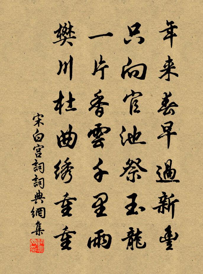 詩詞名句歷史字典書法欣賞書法字典國語詞典說文解字康熙字典古漢語字典標 題 作 者 詩 句 宮詞作者:宋白 朝代:宋代宮詞原文年來春早過新豐,只向官池祭玉龍。一片香雲千里雨,樊川杜曲繡重重。詩詞問答問:宮詞的作者是誰?答:宋白問:宮詞寫於哪個朝代?答:宋代宋白宮詞書法欣賞宮詞書法作品詩詞推薦漁歌子張炎〔宋代〕□□□□濯塵纓。嚴瀨磻溪有重輕。多少事,古今情。今人當似古人清。進賢初食白菜,因名之以水精菜雲二首楊萬里〔宋代〕江西菜甲帶霜栽,逗到炎天總不佳。浪說水菘水蘆菔,硬根瘦葉似生柴。偈頌八十五首釋妙倫〔宋代〕將軍令下閃旌旗,胡騎紛紛頓失威。縱有突然驍驟者,不知身已陷重圍。贈黃校書先輩璞閒居徐夤〔唐代〕馭得驪龍第四珠,退依僧寺卜貧居。青山入眼不乾祿,白髮滿頭猶著書。東澗野香添碧沼,南園夜雨長秋蔬。月明寒山寺壞莊產盡為勢家所奪余游天台甚為賢惜薛師石〔宋代〕寒山寺廢佛燈寒,有客來游欲住難。夙世閭丘今攝郡,不妨饒舌似豐乾。早過劉功父清溪鄧林〔宋代〕月里山河大,風前草木涼。征塵生杖屨,捍霧濕衣裳。古領扳棲鶻,荒蹊蹴聚蝗。白雲看未遠,已轉九迴腸。雜劇·西遊記·第五本楊景賢〔元代〕萬里韶光應節來三天寶籙徹明開分明龍女擎珠出疑是仙人帶月回第十七折女王逼配(唐僧引孫、豬、沙、馬上,雲徐守生辰毛滂〔宋代〕徐卿二子後,吉夢亦羆熊。骨氣本英物,文華今鉅翁。聊因頷燕出,已覺額犀豐。誰伴歲寒色,冰霜十八公。贈陳履常張耒〔宋代〕勞苦陳夫子,欣聞病肺蘇。席門遷次數,僧米乞時無。旨蓄親庖急,青錢藥裹須。我場方不給,何以縶君駒。贈鑒堂徐元傑〔宋代〕方寸無塵眼有筋,如他圖了幾勛臣。更煩提起丹青手,寫出驚天動地人。孟子湍水陳普〔宋代〕湍水縈迴隨所決,亦須順道乃從流。若非所性元趨下,料可東西決得不。題延慶觀六時泉王之望〔宋代〕千尺高崖屏翠琰,六時甘露雨真珠,梯岩穿壑身親到,始信仙靈境界殊。郭璞徐鈞〔宋代〕博學多聞世所宗,推占小術驗奇功。人生禍福既前定,猶撰青囊啟後蒙。醜奴兒慢/採桑子慢潘汾〔宋代〕愁春未醒,還是清和天氣。對濃綠陰中庭院,燕語鶯啼。數點新荷翠鈿,輕泛水平池。一簾風絮,才晴又雨,梅子呂所盤已回故居月余日忽憶舊時與游因約再訪丘葵〔宋代〕匆匆別後又秋涼,佳句遙知塞錦囊。聞道拾遺流落久,歸尋小隱釣游鄉。舊時鄰曲渾如夢,此日江東欲斷腸。擬待報師恩 俗瑞鷓鴣王哲〔元代〕地仙中仙與天仙。認得三田月正圓。自己若能施笑面,那人未肯便興拳。撇*弄腳虛粘地,猛烈回頭合上天。若被頌十玄談轉位釋印肅〔宋代〕披毛戴角入廛來,水底桃花幾度開。世界未生唯此性,任他遷變豈輪迴。丫頭石梅堯臣〔宋代〕丫頭石雖斷,文字未全訛。年筭赤烏近,書疑黃象多。幾時經霹靂,異代見干戈。更與千秋看,松煤定費摩。休致後效樂天體曹勛〔宋代〕從來受性豈其天,遇物常隨處處緣。未病遽為辭職去,欲歸亟引掛冠年。冒寒須放尋梅步,更窘常留買藥錢。恩許漣漪洞姚辟〔宋代〕五門高除勢摩天,洞底清冷瀉碧漣。苹藻魚游知暮雨,薜蘿人去鎖寒煙。山櫻已熟垂朱實,岩竹新抽露玉鞭。只恐名句推薦諫爭輔拂之人,社稷之臣也,國君之寶也,明君之所尊厚也荀子《荀子·臣道》 蕭蕭遠樹疏林外,一半秋山帶夕陽。寇準《書河上亭壁》 林花謝了春紅,太匆匆。無奈朝來寒雨晚來風。李煜《相見歡·林花謝了春紅》 楊柳青青著地垂,楊花漫漫攪天飛。佚名《送別詩》 枕前何事最傷情?梧桐葉上,點點露珠零。尹鶚《臨江仙·深秋寒夜銀河靜》 但見宵從海上來,寧知曉向雲間沒。李白《把酒問月·故人賈淳令予問之》 望天王降詔,早招安,心方足。宋江《滿江紅·喜遇重陽》 萬里雲間戍,立馬劍門關。崔與之《水調歌頭·題劍閣》 別有相思處,啼鳥雜夜風。尹式《別宋常侍》 易其田疇,薄其稅斂,民可使富也。孟子《孟子·盡心章句上·第二十三節》