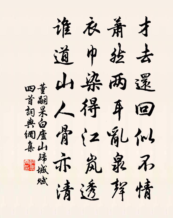 詩詞名句歷史字典書法欣賞書法字典國語詞典說文解字康熙字典古漢語字典標 題 作 者 詩 句 白廬山歸城賦四首作者:董嗣杲 朝代:宋代白廬山歸城賦四首原文才去還回似不情,蕭然兩耳亂泉聲。衣巾染得江嵐透,誰道山人骨亦清。詩詞問答問:白廬山歸城賦四首的作者是誰?答:董嗣杲問:白廬山歸城賦四首寫於哪個朝代?答:宋代董嗣杲白廬山歸城賦四首書法欣賞白廬山歸城賦四首書法作品詩詞推薦偈頌五十一首釋大觀〔宋代〕蓮開陸地,海涌鰲山。不知今夕是何夕,山林城市約同持。簡鄭高士二首方回〔宋代〕再見湖東岸,遷居傍廢城。鷺群窺釣石,荷氣馥棋枰。歉歲難羈旅,泥途厭步行。幽懷徯清話,豈不向君傾。舟至合江度周卿以詩相迓次韻魏了翁〔宋代〕雨滿長空水拍疇,荔香松色倚江流。半窗燈火千年夢,萬里風波一葉舟。謾道班卿若仙去,誰知謝傅正同憂。西歸宿別瀑上二首劉克莊〔宋代〕兩日相疏鄙吝生,今當遠別若為情。夜窗看到千峰黑,枕上猶貪落澗聲。高司業二首張嵲〔宋代〕旌頭落盡少微明,追復成均雅頌聲。詔起儒宗高一代,禮隆師範表諸生。拾遺柱史當螭立,潤色綸言倚馬成。行氫丁未九日青宮侍飲姜特立〔宋代〕重陽開燕侍清躬,次第攜壺到菊叢。仙手撚花親泛酒,此時榮遇少人同。次洪景伯韻曾惇〔宋代〕半刺風流雅好賢,幽導同舉蔡經鞭。江梅滿樹為誰好,官柳著行還自妍。筆陣如君難索敵,詩鋒顧我敢爭先。一春日入趙蕃〔宋代〕日出復日入,寢飯但默默。堪哀籠中鳥,欲去飛不得。秋思陸游〔宋代〕才不才間未必全,胸中元自要超然。黃金不博身強健,且醉江湖萬里天。題墨梅王柏〔宋代〕胸中含靜操,筆下走寒梢。一見孤山客,清香盡拆苞。題扇二十四首曹勛〔宋代〕瀰瀰水檻俯橫橋,水面新荷影動搖。時向青空飛白鷺,不妨悲翠立蘭苕。天辰歐陽修〔宋代〕天形如車輪,晝夜常不息。三辰隨出沒,曾不差分刻。北辰居其所,帝座嚴尊極。眾星拱而環,大小各有職。不動採桑子晏幾道〔宋代〕秋來更覺消魂苦,小字還稀。坐想行思,怎得相看似舊時。南樓把手憑肩處,風月應知。別後除非,夢裡時時得見老椿舒岳祥〔宋代〕江南江北皆宜產,濠上莊生語不虛。京口舊來曾記此,紙屏流落近何如。【正宮】醉太平_寒食珠簾外王元鼎〔元代〕寒食珠簾外燕飛,喬木上鶯啼,鶯鶯燕燕正寒食,想人生有幾。有花無酒難成配,無花有酒難成對。今日有花有酒雜興十二首方回〔宋代〕生世六六載,始獲玷末科。選官六六載,仕少閒日多。逆旅脫兵火,專城免干戈。中原久隔絕,忽焉得經過。水涸自方廣過高台張栻〔宋代〕兩寺清聞磬,群峰石作城。風生雲影亂,猿嘯月華明。香火遠公社,江湖鷗鳥盟。是中俱不著,俯仰見平生。汝平諸公見和復用韻二首陳棣〔宋代〕鵝黃快瀉映金盆,白隨湘酃豈並論。酩酊不妨尋醉侶,鞠躬底事入公門。杯觴往往陪嘲謔,筆札時時荷記存。指日題楊秘書新居張籍〔唐代〕愛閒不向爭名地,宅在街西最靜坊。抄近藁六言二首劉克莊〔宋代〕東鄰莫效西子,南窗何減北扉。一螢道我來往,焉用宮蓮送歸。名句推薦臣子恨,何時滅!駕長車,踏破賀蘭山缺。岳飛《滿江紅·寫懷》 雨暗殘燈棋散後,酒醒孤枕雁來初。杜牧《齊安郡晚秋》 古之人,得志,澤加於民;不得志,修身見於世。窮則獨善其身,達則兼善天下。孟子《孟子·盡心章句上·第九節》 秋風起兮木葉飛,吳江水兮鱸正肥。張翰《思吳江歌》 月黑見漁燈,孤光一點螢。查慎行《舟夜書所見》 蘭葉春葳蕤,桂華秋皎潔。張九齡《感遇十二首·其一》 兵者兇器,將者危任,是以器剛則缺,任重則危。諸葛亮《將苑·卷一·將志》 一樹梨花一溪月,不知今夜屬何人?佚名《雜詩·舊山雖在不關身》 半卷紅旗臨易水,霜重鼓寒聲不起。李賀《雁門太守行》 鳳簫聲斷月明中,舉手謝、時人慾去。蘇軾《鵲橋仙·七夕送陳令舉》