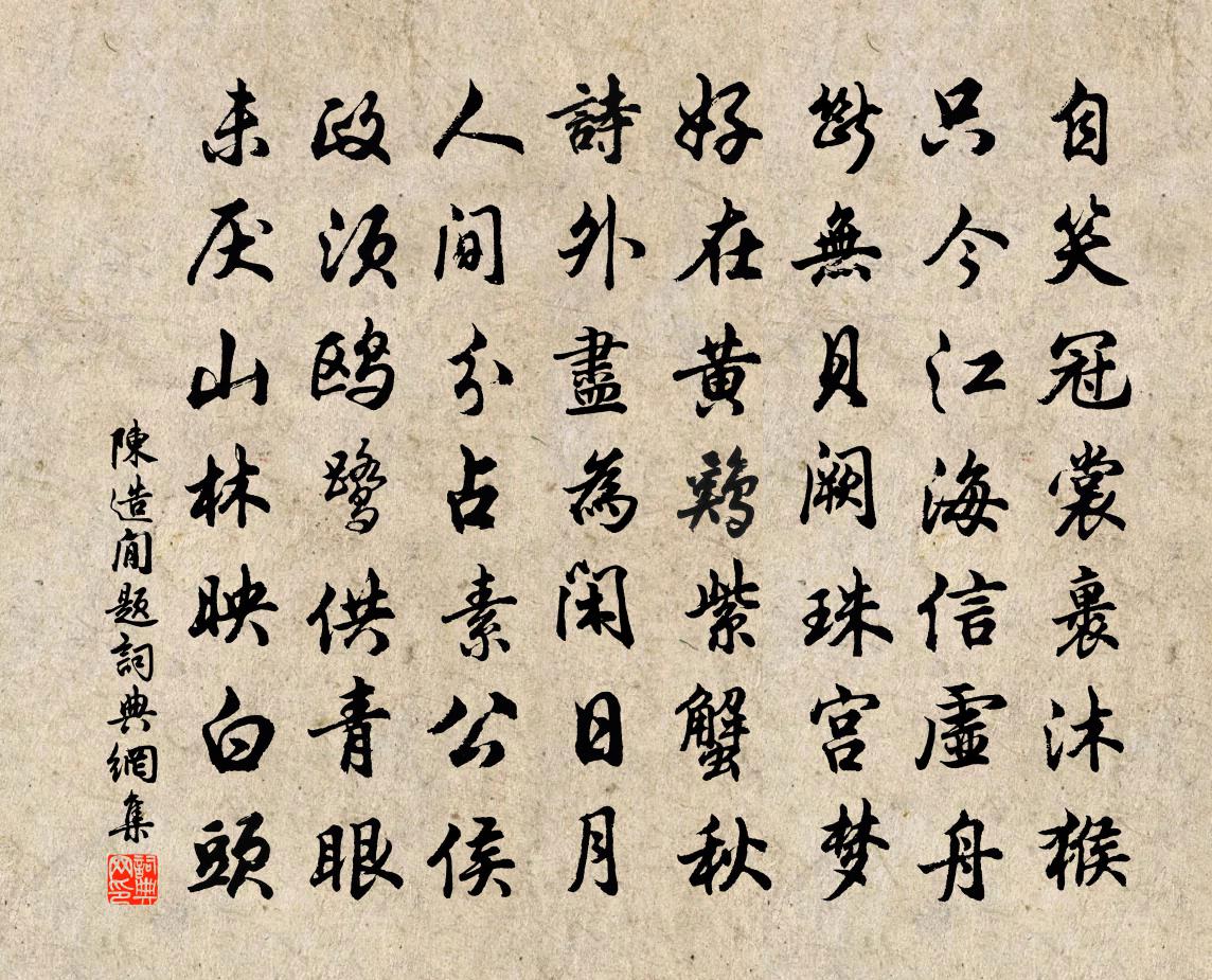 詩詞名句歷史字典書法欣賞書法字典國語詞典說文解字康熙字典古漢語字典標 題 作 者 詩 句 閒題作者:陳造 朝代:宋代閒題原文自笑冠裳裹沐猴,只今江海信虛舟。斷無貝闕珠宮夢,好在黃雞紫蟹秋。詩外盡為閒日月,人間分占素公侯。政須鷗鷺供青眼,未厭山林映白頭。詩詞問答問:閒題的作者是誰?答:陳造問:閒題寫於哪個朝代?答:宋代陳造閒題書法欣賞閒題書法作品詩詞推薦贈鄭讜處士李商隱〔唐代〕浪跡江湖白髮新,浮雲一片是吾身。寒歸山觀隨棋局,暖入汀洲逐釣輪。越桂留烹張翰鱠,蜀姜供煮陸機蓴。相逢至揚州文天祥〔宋代〕飄零無緒嘆途窮,搔首踟躕日已中。何處人聲似潮泝,黑雲驟起滿山風。驀山溪(春情)易祓〔宋代〕海棠枝上,留得嬌鶯語。雙燕几時來,並飛入、東風院宇。夢回芳草,綠遍舊池塘,梨花雪,桃花雨。畢竟春誰主游響山梅堯臣〔宋代〕久憶門前勝,聊乘逸興游。寒篙進溪曲,古木暗城頭。鳥過空潭響,船隨碧瀨流。梅花三疊罷,煙火起滄洲。悼亡詩潘岳〔魏晉〕荏苒冬春謝,寒暑忽流易。之子歸窮泉,重壤永幽隔。私懷誰克從?淹留亦何益。黽勉恭朝命,回心反初役。望廬句劉望之〔宋代〕海山無瘴八蠻清。喜雨和趙右司吳潛〔宋代〕車水耕田正閔農,夜來好雨一犁通。相近可是須群望,陟降元來即上穹。擊壤何曾知帝力,觀風誰與達天聰。見他天仙子韋莊〔唐代〕蟾彩霜花夜不分,天外鴻聲枕上聞。繡衾香冷懶重熏。人寂寂,葉紛紛,才睡依前夢見君。偈傾一百三十三首釋法薰〔宋代〕萬古長空,一朝風月。有祖以來,話作兩橛。石田好是明明說,八十翁翁嚼生鐵。菩薩蠻程垓〔宋代〕平蕪冉冉連雲綠。斜陽襯雨明溪足。小鴨睡晴沙。翠烘三兩花。春光閒婉娩。盡日無人見。試著小屏山。圖歸雲際題劉知宮愚圃三首王炎〔宋代〕蝸角橫戈不解,羊腸覆轍相尋。爭似藏明納智,淡然高臥山林。久旱微雨江公著〔宋代〕雲葉紛紛雨腳勻,亂花柔草長精神。雷車卻碾前山過,不灑原頭陌上塵。送裴饒歸會稽羅隱〔唐代〕金庭路指剡川隈,珍重良朋自此來。兩鬢不堪悲歲月,一卮猶得話塵埃。家通曩分心空在,世逼橫流眼未開。笑殺問菊曹雪芹〔清代〕欲訊秋情眾莫知,喃喃負手叩東籬。孤標傲世偕誰隱,一樣花開為底遲?圃露庭霜何寂寞,鴻歸蛩病可相思?休言秋夕趙希桐〔宋代〕霄虛白露溥,木葉下危闌。月澹鐘聲曉,燈青劍影寒。人心正莽莽,世事海漫漫。何日平胡虜,西風望眼寬。鶗鴂吟劉禹錫〔唐代〕朝陽有鳴鳳,不聞千萬祀。鶗鴂催眾芳,晨間先入耳。秋風白露晞,從是爾啼時。如何上春日,唧唧滿庭飛。寄山僧張喬〔唐代〕閒倚 * 向日眠,不能歸老岳雲邊。舊時僧侶無人在,惟有長松見少年。送謝師直秘丞通判莫州兼寄張和叔梅堯臣〔宋代〕河湟宿兵地,勁勇天下聞。侵疆古甚熾,薄伐詩所云。往今勢且異,利害理頗分。遠以塘設險,遂輕甲屯雲。昔傳香玉花張鎡〔宋代〕風雨溪山數宿,歸來盡有佳晴。小疾何妨隱几,隔窗嬌聽鶯聲。南樓劉似祖〔宋代〕雁過危欄字字愁,誰將官柳系行舟。不知東去大江水,流出西川第幾州。漢上僅遺孤壘在,斗邊忽見數星浮。夜深名句推薦烏啼鵲噪昏喬木,清明寒食誰家哭。白居易《寒食野望吟》 九州生氣恃風雷,萬馬齊喑究可哀。龔自珍《己亥雜詩·其二百二十》 北風夜卷赤亭口,一夜天山雪更厚。岑參《天山雪歌送蕭治歸京》 籬落疏疏一徑深,樹頭花落未成陰。楊萬里《宿新市徐公店》 客路青山外,行舟綠水前。王灣《次北固山下》 楊柳絲絲弄輕柔,煙縷織成愁。王雱《眼兒媚·楊柳絲絲弄輕柔》 雷雨窈冥而未半,皦日籠光於綺寮。左思《三都賦》 不蔽人之善,不言人之惡劉向《戰國策·楚一·江乙為魏使於楚》 蟬噪林逾靜,鳥鳴山更幽。王籍《入若耶溪》 不論平地與山尖,無限風光盡被占羅隱《蜂》