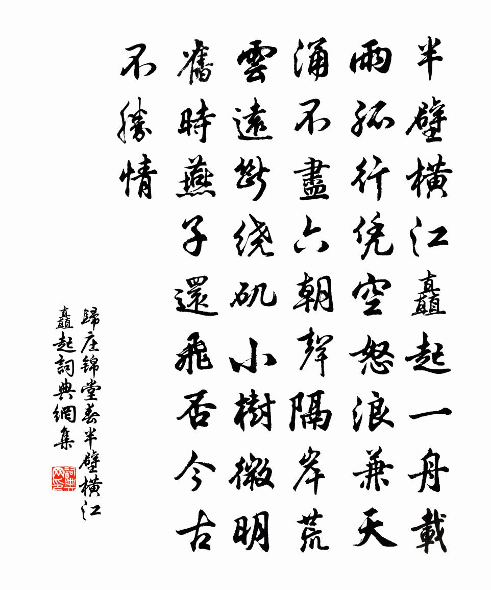 詩詞名句歷史字典書法欣賞書法字典國語詞典說文解字康熙字典古漢語字典標 題 作 者 詩 句 錦堂春·半壁橫江矗起作者:歸莊 朝代:明代錦堂春·半壁橫江矗起原文半壁橫江矗起,一舟載雨孤行。憑空怒浪兼天涌,不盡六朝聲。隔岸荒雲遠斷,繞磯小樹微明。舊時燕子還飛否?今古不勝情。詩詞問答問:錦堂春·半壁橫江矗起的作者是誰?答:歸莊問:錦堂春·半壁橫江矗起寫於哪個朝代?答:明代歸莊錦堂春·半壁橫江矗起書法欣賞錦堂春·半壁橫江矗起書法作品注釋燕子磯:在江蘇南京附近之觀音山。山上有石,俯瞰大江,形如飛燕,故名。兼天涌:兼天,連天。形容不得波浪之高。舊時燕子還飛否:酈道元《水經注》:“石燕山相傳其石或大或小,及有雷風則石燕群飛。”詞意本此。標籤:寫景,懷古詩詞推薦臨江仙·千里瀟湘挼藍浦秦觀〔宋代〕千里瀟湘挼藍浦,藍橈昔日曾經。月高風定露華清。微波澄不動,冷浸一天星。獨倚危檣情悄悄,遙聞妃瑟泠泠。臨江仙·西湖春泛趙溍〔宋代〕堤曲朱牆近遠,山明碧瓦高低。好風二十四花期。驕驄穿柳去,文艗挾春飛。簫鼓晴雷殷殷,笑歌香霧霏霏,閒情南湖早春白居易〔唐代〕風回雲斷雨初晴,返照湖邊暖復明。亂點碎紅山杏發,平鋪新綠水蘋生。翅低白雁飛仍重,舌澀黃鸝語未成。不道清明日狸渡道中范成大〔宋代〕灑灑沾巾雨,披披側帽風。花燃山色里,柳臥水聲中。石馬立當道,紙鳶鳴半空。墦間人散後,烏鳥正西東。田園樂七首·其四王維〔唐代〕萋萋春草秋綠,落落長松夏寒。牛羊自歸村巷,童稚不識衣冠。小桃紅·碧湖湖上柳陰陰楊果〔元代〕碧湖湖上柳陰陰,人影澄波浸,常記年時歡花飲。到如今,西風吹斷迴文錦。羨他一對,鴛鴦飛去,殘夢蓼花深。七里瀨謝靈運〔南北朝〕羈心積秋晨,晨積展游眺。孤客傷逝湍,徒旅苦奔峭。石淺水潺湲,日落山照曜。荒林紛沃若,哀禽相叫嘯。遭物浣溪沙·清潤風光雨後晁端禮〔宋代〕清潤風光雨後天。薔薇花謝綠窗前。碧琉璃瓦欲生煙。 十里閒情憑蝶夢,一春幽怨付鯤弦。小樓今夜月重圓。楚宮李商隱〔唐代〕湘波如淚色漻漻,楚厲 * 逐恨遙。楓樹夜猿愁自斷,女蘿山鬼語相邀。空歸腐敗猶難復,更困腥臊豈易招。但使清平樂·瓜洲渡口李好古〔宋代〕瓜州渡口。恰恰城如斗。亂絮飛錢迎馬首。也學玉關榆柳。面前直控金山。極知形勝東南。更願諸公著意,休教忘南陵道中 / 寄遠杜牧〔唐代〕南陵水面漫悠悠,風緊雲輕欲變秋。正是客心孤回處,誰家紅袖憑江樓?雪後到乾明寺遂宿蘇軾〔宋代〕門外山光馬亦驚,階前屐齒我先行。風花誤入長春苑,雲月長臨 * 。未許牛羊傷至潔,且看鴉鵲弄新晴。更須生查子·春山煙欲收牛希濟〔唐代〕春山煙欲收,天澹星稀小。殘月臉邊明,別淚臨清曉。語已多,情未了,回首猶重道:記得綠羅裙,處處憐芳草。水仙子·懷古張可久〔元代〕秋風遠塞皂雕旗,明月高台金鳳懷。紅妝肯為蒼生計,女妖嬈能有幾?兩蛾眉千古光輝:漢和番昭君去,越吞吳西竹鄭谷〔唐代〕宜煙宜雨又宜風,拂水藏村復間松。移得蕭騷從遠寺,洗來疏淨見前峰。侵階蘚拆春芽迸,繞徑莎微夏蔭濃。無賴初至巴陵與李十二白、裴九同泛洞庭湖三首·其一賈至〔唐代〕江上相逢皆舊遊,湘山永望不堪愁。明月秋風洞庭水,孤鴻落葉一扁舟。黃州快哉亭記蘇轍〔宋代〕江出西陵,始得平地,其流奔放肆大。南合沅、湘 ,北合漢沔,其勢益張。至於赤壁之下,波流浸灌,與海相若秦州雜詩二十首·其十二杜甫〔唐代〕山頭南郭寺,水號北流泉。老樹空庭得,清渠一邑傳。秋花危石底,晚景臥鍾邊。俯仰悲身世,溪風為颯然。水調歌頭 題李季允侍郎鄂州吞雲樓戴復古〔宋代〕輪奐半天上,勝概壓南樓。籌邊獨坐,豈欲登覽快雙眸。浪說胸吞雲夢,直把氣吞殘虜,西北望神州。百載一機會南鄉子·山果熟李珣〔五代〕山果熟,水花香,家家風景有池塘。木蘭舟上珠簾卷,歌聲遠,椰子酒傾鸚鵡盞。名句推薦黃鶴一去不復返,白雲千載空悠悠。崔顥《黃鶴樓 / 登黃鶴樓》 今年歡笑復明年,秋月春風等閒度。白居易《琵琶行 / 琵琶引》 有情知望鄉,誰能鬒不變?謝朓《晚登三山還望京邑》 快意事過非快意,自古敗名因敗事。佚名《增廣賢文·下集》 歸夢寄吳檣。水驛江程去路長。陸游《南鄉子·歸夢寄吳檣》 氣相得則和,不相得則病佚名《黃帝內經·素問·五運行大論》 去年元夜時,花市燈如晝。歐陽修《生查子·元夕》 三日入廚下,洗手作羹湯。王建《新嫁娘詞三首》 尿泡雖大無斤兩,秤鉈雖小壓千斤。吳承恩《西遊記·第三十一回》 悲懷感物來,泣涕應情隕。潘安《悼亡詩三首》