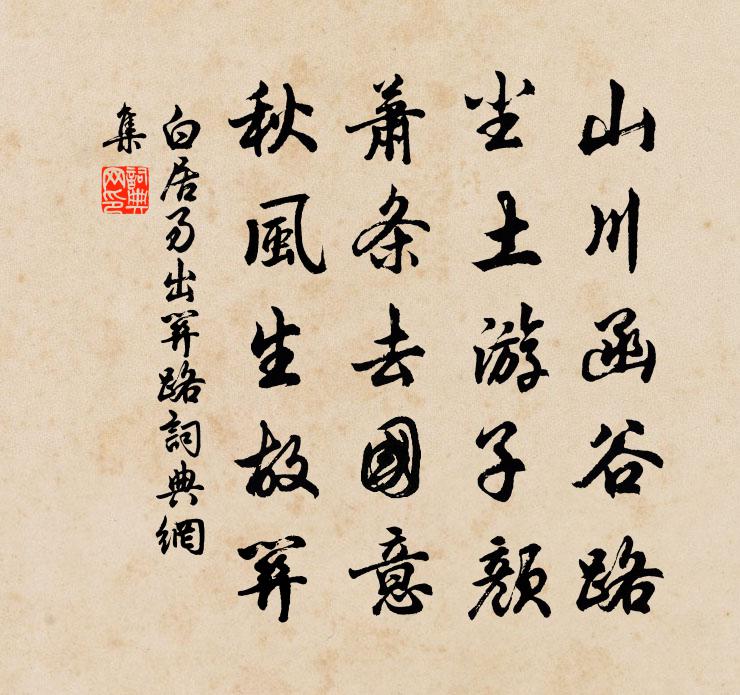 詩詞名句歷史字典書法欣賞書法字典國語詞典說文解字康熙字典古漢語字典標 題 作 者 詩 句 出關路作者:白居易 朝代:唐代出關路原文山川函谷路,塵土遊子顏。蕭條去國意,秋風生故關。詩詞問答問:出關路的作者是誰?答:白居易問:出關路寫於哪個朝代?答:唐代問:出關路是什麼體裁?答:五絕問:白居易的名句有哪些?答:白居易名句大全白居易出關路書法欣賞出關路書法作品注釋全唐詩詩詞推薦念奴嬌盧炳〔宋代〕晚天清楚,掃太虛纖翳,涼生江曲。四顧青冥天地闊,惟有殘霞孤騖。山氣凝藍,汀煙引素,竦竦浮群木。白苹風贈別講僧若水毛滂〔宋代〕道人永嘉老,口作智者語。從揮鐵如意,寶藏發深貯。行住自如如,當亦無住所。踏雪來東山,了不憚修阻。孤雲偈頌二百零五首釋正覺〔宋代〕今朝臘月二十五,衲僧一曲和雲門。誰將節奏亂孔竅,不到瘢痕傷斧斤。舌無骨,眼有筋,方見韶陽老子能。拍拍寄別左與言鄭剛中〔宋代〕寒生坐孤窮,浪跡遠羈寓。千金買卜龜,所用良失措。如聞過瓜期,騫揚引雄翥。放直州縣腰,闊作台省步。念欲春眠白居易〔唐代〕枕低被暖身安穩,日照房門帳未開。還有少年春氣味,時時暫到夢中來。四月二十日書二首張耒〔宋代〕久將醉眼視群兒,只與旁觀作笑嘻。賦芋狙公曾未悟,牽絲木偶幾多時。雲間炎景人方畏,地下微陰誰得知。榮謝挽李自玉趙必象〔宋代〕安樂窩中寄幅巾,床頭易註墨猶新。蓋棺只著深衣去,疑是堯夫輩行人。羅湖八首劉克莊〔宋代〕中州無地堪投足,垂老攜家泛瘴江。不愛朱丹畫車轂,且貪紫翠入船窗。傷柘枝妓李群玉〔唐代〕曾見雙鸞舞鏡中,聯飛接影對春風。今來獨在花筵散,月滿秋天一半空。頌十六首釋慧暉〔宋代〕不行心處,不盡凡心。若於心處見於凡心,不妨個個了得心心。不掛本衣,不著元裳。自求本衣,再裝元裳。不用送廖倚歸衡山梅堯臣〔宋代〕雌猿夜啼別湘東,曉尋故人背孤桐。孤桐有聲彈不響,弦絕曲在埋蒿蓬。知音萬古期必逢,今日已聞天下雄。陟山重陽後絕句五首方回〔宋代〕九月重陽菊未開,十月小春梅又來。賞過日長添一線,一瓶菊伴一瓶梅。送龐舅大夫張舜民〔宋代〕外家門館未應疏,舅氏多能作大夫。才命淹回猶半刺,舟船繚繞向三吳。興公自有游山賦,鄭老寧無過海圖。去國送江州薛尚書(一作郎中)周繇〔唐代〕匡廬千萬峰,影匝郡城中。忽佩虎符去,遙疑鳥道通。煙霞時滿郭,波浪暮連空。樹翳樓台月,帆飛鼓角風。郡齋神光燦 贈趙先生譚處端〔元代〕趙仙入道,猛烈投玄,割除頓悟浮華。對境修持,不若火長蓮花。予今誠言少付,遇戈矛、寬納教他。若有病,便江陵即事王建〔唐代〕瘴雲梅雨不成泥,十里津樓壓大堤。蜀女下沙迎水客,巴童傍驛賣山雞。寺多紅藥燒人眼,地足青苔染馬蹄。夜半送無為倅張南仲歸吉州王之道〔宋代〕吾友李粹老,少也游膠庠。六年得一第,自謂貴且昌。衽席不知戒,飛黃中道僵。三閱大淵獻,歲月亦已長。嗟嗟偈頌六十首釋曇華〔宋代〕識得橙子,周匝有餘。識得橙子,天地懸殊。若向周匝有餘處會,理上偏枯。若向天地懸殊處會,事上偏枯。送制帥林和叔歸樓鑰〔宋代〕使君一何清,鶴骨天與瘦。少年場屋聲,六藝飽芳漱。一行起作吏,所立已不苟。立朝凜大節,論事幾及霤。發言青門引 棋洪希文〔元代〕白日沉西永。棋局閒尋清興。兩賢既不為山河,強令南北,黑白交分陣。雌雄未決誰能省。勢若曹劉競。英雄到底名句推薦人有賢愚,任人勿求過己。來俊臣《羅織經·固榮卷第六》 風遞幽香出,禽窺素艷來。齊己《早梅》 青蒲銜紫茸,長葉復從風。佚名《拔蒲二首》 粉骨碎身全不怕,要留清白在人間。于謙《石灰吟》 江流石不轉,遺恨失吞吳。杜甫《八陣圖》 青春花姊不同時。淒涼生較遲。吳文英《醉桃源·芙蓉》 還作一段相思,冷波葉舞愁紅,送人雙槳。吳文英《解蹀躞·醉雲又兼醒雨》 為問暗香閒艷,也相思、萬點付啼痕魯逸仲《南浦·旅懷》 缺月掛疏桐,漏斷人初靜。蘇軾《卜運算元·黃州定慧院寓居作》 盡做舊愁都忘卻,新愁何處著王庭筠《謁金門·雙喜鵲》