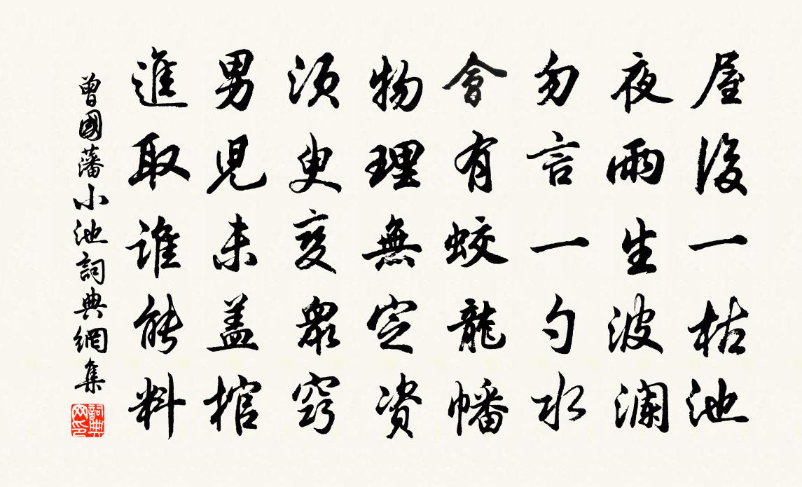 詩詞名句歷史字典書法欣賞書法字典國語詞典說文解字康熙字典古漢語字典標 題 作 者 詩 句 小池作者:曾國藩 朝代:清代小池原文屋後一枯池,夜雨生波瀾。勿言一勺水,會有蛟龍幡。物理無定資,須臾變眾竅。男兒未蓋棺,進取誰能料。詩詞問答問:小池的作者是誰?答:曾國藩問:小池寫於哪個朝代?答:清代曾國藩小池書法欣賞小池書法作品詩詞推薦必明庵王銍〔宋代〕佛心猶日出,何曾礙須彌。散為普光明,合作四威儀。萬古止此日,群目盡見之。普現一切水,君自分澠淄。高垂浮萍寄水行釋文珦〔宋代〕浮萍寄諸水,漂流本無要。倚水以為命,然後生意蕃。女子方在室,怙恃父母恩。及其既結髮,託身向他門。室家次韻答鄰友況六首戴表元〔宋代〕三間瓦屋數弓園,旋學桑麻又一年。村酒沾唇頻得酒,山歌出口即成篇。怨歌行 長安見內人出嫁,友人令余代為之李白〔唐代〕十五入漢宮,花顏笑春紅。君王選玉色,侍寢金屏中。薦枕嬌夕月,卷衣戀春風。寧知趙飛燕,奪寵恨無窮。沉憂感舊陸游〔宋代〕早發金堆市,更衣石櫃亭。灘聲秋後壯,山色雨余青。道濘愁車轍,橋危避駝鈴。功名竟何在?撫事感頹齡。寄題汪君秀山高處方回〔宋代〕秀山高處我未到,想見斯人獨嘯歌。靜賞奇雲臨翠巘,醉吞朗月上銀河。異香染筆花間寫,清影搖衣竹里過。愧無詠史上賈逵陳普〔宋代〕經術何曾得暫行,漢家空有表章名。石渠但把雷霆壓,焉用低帷鑿壁生。閒書陸龜蒙〔唐代〕病學高僧置一床,披衣才暇即焚香。閒階雨過苔花潤,小簟風來薤葉涼。南國羽書催部曲,東山毛褐傲羲皇。昇平月夜泛小舟湖中三更乃歸陸游〔宋代〕落日愁思把釣鉤,南鄰借得采菱舟。湖心月上明如晝,樹杪風生冷逼秋。壯歲功名慚汗馬,暮年心事許沙鷗。桐江抱拙以三通鼓為韻見寄次韻胡仲弓〔宋代〕夜闌缺月浸寒潭,亂山倒影空中涵。此時萬籟寂無語,碧雲郁對如晴嵐。可人已趁春風去,舉杯對影成三三。割席挽陳菊坡樞密二首陳著〔宋代〕家學淵源遠,公今德行科。一純光白璧,重望壓頹波。職業居朝久,文章八石多。平生何所似,霜菊在秋坡。讀書所見(六首選二)趙翼〔清代〕其一後人觀古書,每隨己境地。譬如廣場中,環看高台戲。矮人在平地,舉頭仰而企。危樓有憑檻,劉楨方平視。步入衡山范成大〔宋代〕應有人家往隔溪,綠陰亭午但聞雞。松根當路龍筋瘦,竹筍漫山鳳尾齊。墨染深雲猶似瘴,絲來小雨不成泥。更無滁州官舍王禹偁〔宋代〕忽從天上謫人間,知向山州住幾年。俸外不教收果實,公餘多愛入林泉。朝簪未解雖妨道,宦路無機即是禪。鈴閣書院諸客登仲宣樓以詩寄之李曾伯〔宋代〕指點層雲氣阿乾,官身浩嘆不如閒。幾回落日詩懷古,一半春風酒破慳。許我婆娑從白髮,於人嫵媚有青山。前身欒城遇風效韓孟聯句體歐陽修〔宋代〕歲暮氛霾惡,冬餘氣候爭。吹噓回暖律,號令發新正。遠響來猶漸,狂奔勢益橫。頹城鏖戰鼓,掠野過陰兵。掃蕩夜坐王銍〔宋代〕夜久燈花自吐紅,歲華已盡尚飄蓬。身游百越風波外,路入千山雨雪中。失馬舊知無得喪,拂龜那更問窮通。懶將城南江館文同〔宋代〕漢江之北涯,軒宇頗高爽。西南正空闊,時此托遐想。誰家有竹石,更可悅新賞。待學袁愍孫,乘興欲直往。夢句蘇泂〔宋代〕元日新春又一年,剡溪仍是舊山川。白頭野叟無時事,獨自尋僧雪滿船。頌古五十三首釋文禮〔宋代〕說理談真面紫宸,鵝湖大義枉勞神。由來佛性難名邈,爭似君王默契親。名句推薦馬上逢寒食,愁中屬暮春。宋之問《途中寒食題黃梅臨江驛寄崔融》 人見利而不見害,魚見食而不見鉤。李汝珍《鏡花緣·第九十二回》 今歲早梅開,依舊年時月。張孝祥《卜運算元·雪月最相宜》 死生驚懼不入乎其胸,是故忤物而不懾。列子及其弟子《列子·黃帝》 是是、非非謂之知,非是、是非謂之愚。荀子《荀子·修身》 秋風吹到江村,正黃昏,寂寞梧桐夜雨不開門。顧彩《相見歡·秋風吹到江村》 露清枕簟藕花香,恨悠揚。顧敻《虞美人·觸簾風送景陽鍾》 六翮飄颻私自憐,一離京洛十餘年。高適《別董大二首》 今宵酒醒何處?楊柳岸,曉風殘月。柳永《雨霖鈴·寒蟬淒切》 北風利如劍,布絮不蔽身。白居易《村居苦寒》
