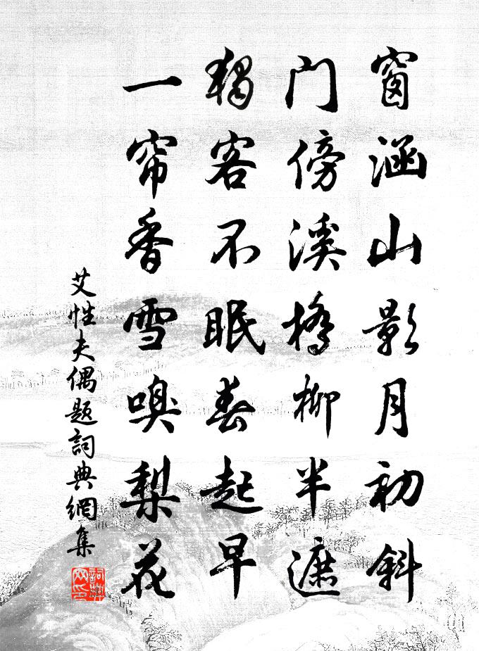 詩詞名句歷史字典書法欣賞書法字典國語詞典說文解字康熙字典古漢語字典標 題 作 者 詩 句 偶題作者:艾性夫 朝代:宋代偶題原文窗涵山影月初斜,門傍溪橋柳半遮。獨客不眠春起早,一簾香雪嗅梨花。詩詞問答問:偶題的作者是誰?答:艾性夫問:偶題寫於哪個朝代?答:宋代問:偶題是什麼體裁?答:七絕艾性夫偶題書法欣賞偶題書法作品詩詞推薦次韻方教采芹亭方岳〔宋代〕亭與樵嵐一樣新,詩書不受世間塵。清風明月來無盡,不在溪山只在人。奉送六舅歸陸渾王維〔唐代〕伯舅吏淮泗。卓魯方喟然。悠哉自不競。退耕東皋田。條桑臘月下。種杏春風前。酌醴賦歸去。共知陶令賢。養蠶宋沆〔宋代〕男必耕耘女必蠶,古人尚爾我何貪。浴沂時候成春服,歌詠來歸道味甘。庚子荐饑戴復古〔宋代〕餓走拋家舍,從橫死路岐。有天有雨粟,無地可埋屍。劫數慘如此,吾曹忍見之。官司行賑卹,不過是文移。原蠶李復〔宋代〕蠶馬巨細殊,異物同精氣。物生不兩大,此衰彼所致。周人禮有禁,蠶為馬之祟。織女天上明,多蠶今為利。贈泗口苗居士鄭谷〔唐代〕歲晏樂園林,維摩契道心。江雲寒不散,庭雪夜方深。酒勸漁人飲,詩憐稚子吟。四郊多壘日,勉我舍朝簪。茂恭見和再用前韻奉酬喻良能〔宋代〕少陵時時醉里,子山日日愁邊。白髮新來滿鏡,故人萬一能憐。秀綠亭陳岩〔宋代〕曾看雙峰老子詩,秀攢綠繞妙天機。有人愛此無聲畫,更著幽亭相發揮。記九月二十六夜夢陸游〔宋代〕海山萬峰郁參差,宮殿插水蟠蛟螭。碧桃千樹自開落,飛橋架空來者誰?桐枝高聳宿丹鳳,蓮葉半展巢金龜。和風解連環吳潛〔宋代〕彩橈芳苑。嗟東風夢斷,燕殘鶯懶。謾記得、標格精神,正雲漲暮天,雨荒閒館。嫩綠殷紅,但回首、一川波暖。思越人/朝天子賀鑄〔宋代〕京口瓜洲記夢間。朱扉猶想映花關。東風太是無情思,不許扁舟興盡還。春水漫,夕陽閒。烏檣幾轉綠楊灣。紅塵題畫十首唐寅〔明代〕江南春盡野花稀,綠樹陰陰結夏幃。詩在浩然驢背上,按鞭徐詠夕陽歸。偈頌七十一首釋了惠〔宋代〕撥亂乾坤老賊精,天教化火 * 身。賊心賊行難磨滅,二月依前是仲春。寓宿洞霄釋寶印〔宋代〕窈窕門前九鎖山,琮琤石角千層水。白雲影里閱群仙,風斷木犀香未已。我從青城大面來,羽衣駕鶴欣相陪。五峰讀書堂五首葉子強〔宋代〕少長事壯厲,意氣彌九州。鞭車踏長路,渠料能夷猶。困此九折坂,嶔崎不容輈。彼須匪所強,此售寧或求。猶有剡溪久寓王銍〔宋代〕山水戴逵色,尚余清興中。千岩落花雨,一徑卷松風。酒茗延幽子,圖書伴老翁。長生吾不羨,久悟去來同。文監丞出關子東西湖春遊倡和且約為重九之游王之望〔宋代〕西湖爛醉踏青天,秀句重尋未隔年。已約清樽攜九日,要將 * 薦三賢。深秋風日明寒水,宿雨波瀾起畫船。佳所梅龍黃庚〔宋代〕孤根蟠屈浸冰壺,蟄裹陽和發朽枯。雪樹鱗封寒水玉,月梢頷吐夜明珠。暗香吹冷龍涎濕,疏影涵清蛻骨癯。安得過甓社諸湖,進退格,東西長七十里,南北闊楊萬里〔宋代〕為愛淮中掌似平,忽逢巨浸卻心驚。怪來萬頃不生浪,凍合五湖都是冰。碧玉湖寬容我到,白銀地滑沒人行。茲游滿江紅王玠〔元代〕太極渾淪,才開口、便分仁義。把清真支離,大道已廢。世事機謀求愈遠,人情往復相牽繫。都不如、收拾早回頭名句推薦人生如寄,何事辛苦怨斜暉。朱熹《水調歌頭·隱括杜牧之齊山詩》 三顧頻煩天下計,兩朝開濟老臣心。杜甫《蜀相》 一水護田將綠繞,兩山排闥送青來王安石《書湖陰先生壁》 桃李春風一杯酒,江湖夜雨十年燈。黃庭堅《寄黃幾復》 奢則不孫,儉則固。與其不孫也,寧固。顏之推《顏氏家訓·治家篇》 時不可留,眾不可逆。范曄《後漢書·本紀·光武帝紀上》 微雨過,小荷翻。榴花開欲然。蘇軾《阮郎歸·初夏》 怒濤卷霜雪,天塹無涯。柳永《望海潮·東南形勝》 追亡事、今不見,但山川滿目淚沾衣辛棄疾《木蘭花慢·席上送張仲固帥興元》 彩線輕纏紅玉臂,小符斜掛綠雲鬟。蘇軾《浣溪沙·端午》