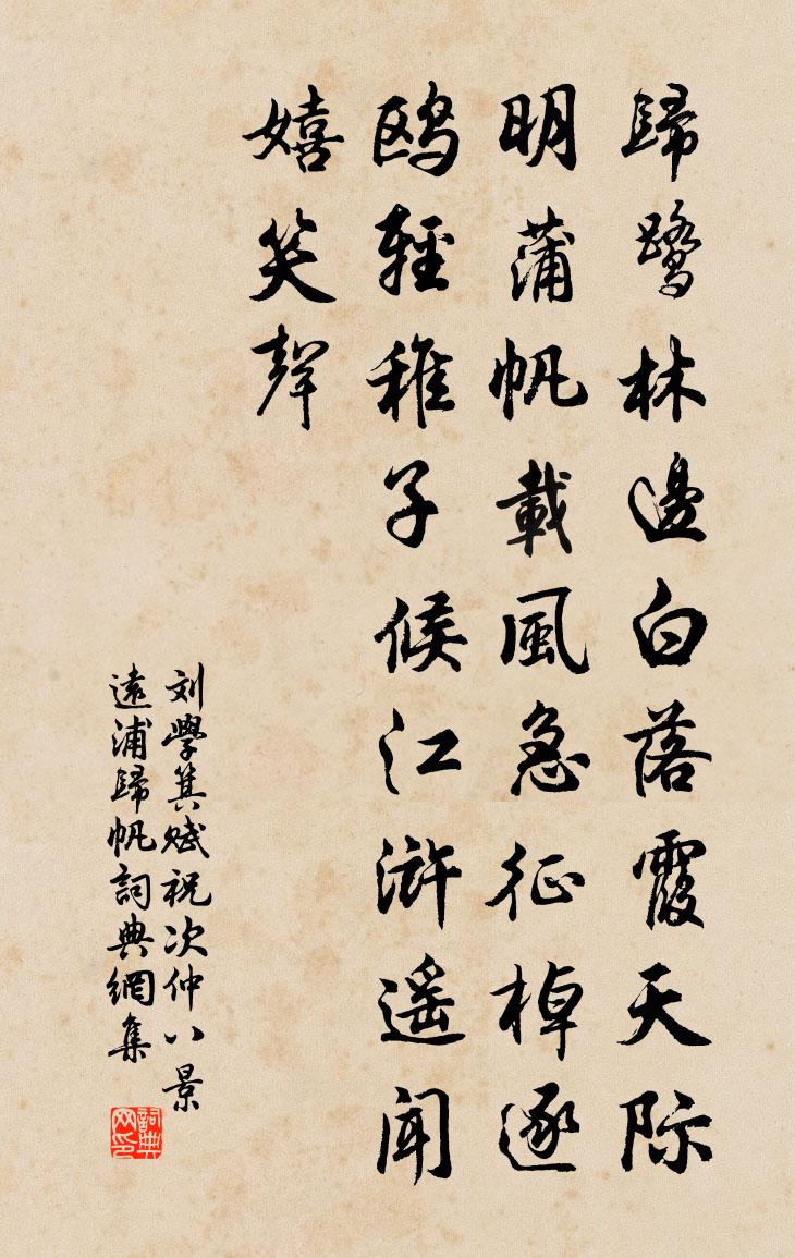 詩詞名句歷史字典書法欣賞書法字典國語詞典說文解字康熙字典古漢語字典標 題 作 者 詩 句 賦祝次仲八景遠浦歸帆作者:劉學箕 朝代:宋代賦祝次仲八景遠浦歸帆原文歸鷺林邊白,落霞天際明。蒲帆載風急,征棹逐鷗輕。稚子候江滸,遙聞嬉笑聲。詩詞問答問:賦祝次仲八景遠浦歸帆的作者是誰?答:劉學箕問:賦祝次仲八景遠浦歸帆寫於哪個朝代?答:宋代劉學箕賦祝次仲八景遠浦歸帆書法欣賞賦祝次仲八景遠浦歸帆書法作品詩詞推薦村居馮時行〔宋代〕飛蛾故故撲燈光,風雨蕭蕭打紙窗。人為官方搔白首,虎來村落渡清江。猿啼冷日誰家夢,故國愁牽幾曲腸。籬菊次韻沈駒甫留別韓元吉〔宋代〕筆下縱橫自學林,胸中玉海更清深。識君異縣見眉宇,過我空山聆足音。月近中秋還惜別,雪飛窮臘會重臨。閉門第一百九十六文天祥〔宋代〕客從何鄉來,挾矢身漢月。殺身傍權要,門戶有旌節。舟中夜坐楊萬里〔宋代〕與月隔一簟,去天爭半篷。若無篷與簟,身在大虛中。送李判官赴東江王維〔唐代〕聞道皇華使,方隨皂蓋臣。封章通左語,冠冕化文身。樹色分揚子,潮聲滿富春。遙知辨璧吏,恩到泣珠人。詠十月桃張榘〔宋代〕十月桃開三四枝,淒涼時候見芳菲,小紅不著黃花蝶,一樹春風怨落暉。句南呂薄媚舞洪适〔宋代〕可倩,本事願聞。答踢軟塵之陌,傾一見於月膚;會采萍之洲,迷千嬌於雨夢。且蛾眉有伐性之戒,而狐媚無傷人黃雀食新二首楊萬里〔宋代〕侯門信口總稱珍,只見陳人不見新。三日荔投香味變,況開醬瓿柫蛛塵。一春黃庚〔宋代〕新緣園林雨過時,黃鸝無語恨春歸。楊花怕逐東風去,搭住闌乾不肯飛。人問應舉雍陶〔唐代〕莫驚西上獨遲回,只為衡門未有媒。惆悵賦成身不去,一名閒事逐秋回。郭將軍廟陳份〔宋代〕天欲亡佗開漢境,將軍英武契風雲。遠驅函谷三千騎,南下番禺十萬兵。自此河山消壘拒,至今民俗荷庸勛。後來鶴廟松張堅〔宋代〕誰種飛仙百丈梯,風摧雨折昔人非。憑誰寄語楊員外,留取孫令待令威。口號秦觀〔宋代〕平原居士今無影,鸚鸝空洲誰舉杯。猶有漁陽摻檛鼓,為君醉後作輕雷。贈畫士陳兄宋自適〔宋代〕解衣盤礴任猜疑,神悟如狂又似痴。學到卻須堅自守,世間絕藝少人知。水調歌頭汪莘〔宋代〕誰與玩芳草,公子未西歸。天然脫去雕飾,秋水落芙蕖。發軔朝兮東壁,弭節夕兮西極,故國入躊躇。夢裡不知路蒼嶺行三首葛紹體〔宋代〕只將客路當山行,自覺春光步步生。幾許花開到桃李,東風又趣隴頭耕。頌古九十八首釋印肅〔宋代〕教人夢裹撮虛空,要顯盲參離相通。色即是空空是色,色空不異體還同。胡笳曲四拍文天祥〔宋代〕黃河北岸海西軍,翻身向天仰射雲。胡馬長鳴不知數,衣冠南渡多崩奔。山木慘慘天欲雨,前有毒蛇後猛虎。欲問靜中胡仲弓〔宋代〕靜中天地闊,歲月聽悠悠。往事渾如夢,長江不盡流。恐吟似懷古,雁陣去防秋。習得看山痴,終朝懶下樓。挽汪約叟王柏〔宋代〕憶昔先君子,金蘭氣味投。中間有生死,一別幾春秋。曉漏傳幽夢,英魂覓舊遊。城東煙月冷,應是訪新丘。名句推薦神女生涯原是夢,小姑居處本無郎。李商隱《無題·重幃深下莫愁堂》 醉舞梁園夜,行歌泗水春杜甫《寄李十二白二十韻》 野雲萬里無城郭,雨雪紛紛連大漠。李頎《古從軍行》 逍遙以針勞,談笑以藥倦劉勰《文心雕龍·養氣》 婦人依倚子與夫,同居貧賤心亦舒。張籍《征婦怨》 若似月輪終皎潔,不辭冰雪為卿熱。納蘭性德《蝶戀花·辛苦最憐天上月》 守分安命,順時聽天。朱柏廬《朱子家訓·全文》 故人入我夢,明我長相憶。杜甫《夢李白二首·其一》 救人須救急,施人須當厄。馮夢龍《醒世恆言·卷十》 門隔花深舊夢遊,夕陽無語燕歸愁。玉纖香動小簾鉤。吳文英《浣溪沙·門隔花深舊夢遊》