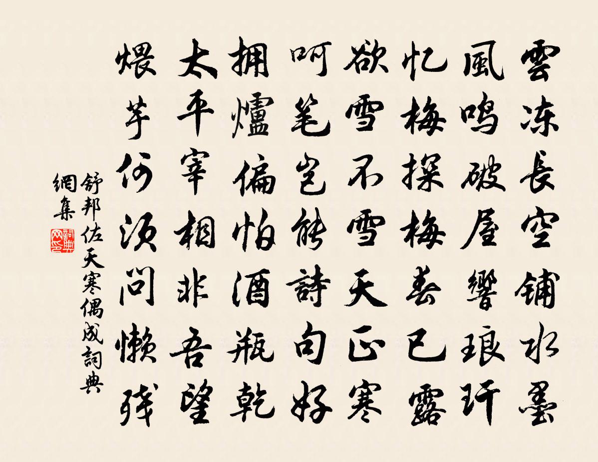 詩詞名句歷史字典書法欣賞書法字典國語詞典說文解字康熙字典古漢語字典標 題 作 者 詩 句 天寒偶成作者:舒邦佐 朝代:宋代天寒偶成原文雲凍長空鋪水墨,風鳴破屋響琅玕。憶梅探梅春已露,欲雪不雪天正寒。呵筆豈能詩句好,擁爐偏怕酒瓶乾。太平宰相非吾望,煨芋何須問懶殘。詩詞問答問:天寒偶成的作者是誰?答:舒邦佐問:天寒偶成寫於哪個朝代?答:宋代舒邦佐天寒偶成書法欣賞天寒偶成書法作品詩詞推薦池萍劉學箕〔宋代〕竹籬茅捨去相安,誰與移根入畫欄。盡道重簾妨暖日,疏枝卻得獲春寒。寄別李儋韋應物〔唐代〕首戴惠文冠,心有決勝籌。翩翩四五騎,結束向并州。名在相公幕,丘山恩未酬。妻子不及顧,親友安得留。宿昔句黃裳〔宋代〕障塞應縣隔,崇敬塘謾太高。詩家楊公遠〔宋代〕松下雲根迂菊徑,梅邊竹外著茆茨。天教管領閒風月,得句無非妙色絲。蟬許渾〔唐代〕噪柳鳴槐晚未休,不知何事愛悲秋。朱門大有長吟處,剛傍愁人又送愁。歸家(一作趙嘏詩)杜牧〔唐代〕稚子牽衣問,歸來何太遲。共誰爭歲月,贏得鬢邊絲。崇安分水道中方士繇〔宋代〕溪流清淺路橫斜,日暮牛羊自識家。梅葉陰陰桃李盡,春光已到白桐花。題愚溪堂徐照〔宋代〕水流深見底,不是此溪愚。謫宦休嗟命,鄉人為讀書。文章傳海裔,屋室在州圖。儒者凡經此,須來看所居。張屯田知兗州宋祁〔宋代〕漢家關內使騶來,廣魯風旟畫隼開。地得股肱雄近輔,書留筋骨冠中台。儒宮劃壁嚴祠豆,督府均羊盛宴罍。應望壽光宮王鎡〔宋代〕井氣蒸雲濕石欄,白頭道士 * 丹。開門風帶琴聲出,一陣松花滿醮壇。送遲赴登封丞蘇轍〔宋代〕昔我過嵩陽,秋高日重九。晨邀同行客,共舉登高酒。藤鞋生胼胝,一覽河山富。封壇土消盡,中夜捫星斗。下山張相公祠許申〔宋代〕鐵胎重整英儀峻,燕廈新成暑氣涼。韶石遍圖輝壁落,荔枝分植映房廊。開元舊事豐碑在,家笥猶傳故笏囊。送友生下第南歸寇準〔宋代〕頻頻退禮闈,此去欲忘機。霄漢貧難達,江湖老獨歸。程遙秋浪疊,村暝夜燈微。應使為儒者,翻悲苦業非。春貼子皇帝閣六首真德秀〔宋代〕進陰消屬此一時,凝旒南面盍深思。微臣自愧無規諫,原獻元朝學士詩。寄永興吳龍圖給事文同〔宋代〕高舂鈴下索焚香,鏤管紋箋發彩章。應在後園涼榭里,玄霜仙帽紫霓裳。瑞香王柏〔宋代〕呈外來香國,瓊敷四出葩。嬌姿不受暑,睡思卻便茶。心裡藏金粟,枝頭簇紫芽。長安厭歌舞,還肯到儂家。視民詩柳宗元〔唐代〕帝視民情,匪幽匪明。慘或在腹,已如色聲。亦無動威,亦無止力。弗動弗止,惟民之極。帝懷民視,乃降明德,五湖亭陶弼〔宋代〕七堤環繞四城隅,限隔煙波作五湖。書吏寫供都水帳,畫工描入織方圖。東流滿郭湖相似,塞氣侵入瘴自無。日際苦熱二首蘇籀〔宋代〕示病劉松殊不飲,爍燔汗眩兀如痴。塵囂堀堁東山扇,汩濁只慚叔度陂。茗汁粟漿回渴夢,大門高屋憚炎曦。生靈皇甫郎中親家翁赴任絳州宴送出城贈別白居易〔唐代〕慕賢入室交先定,結援通家好復成。新婦不嫌貧活計,嬌孫同慰老心情。洛橋歌酒今朝散,絳路風煙幾日行?欲識名句推薦黃昏院落,淒悽惶惶,酒醒時往事愁腸。李清照《行香子·天與秋光》 馬色雖不同,人心本無隔。李白《君馬黃》 願為西南風,長逝入君懷。曹植《七哀詩》 徘徊將何見?憂思獨傷心。阮籍《詠懷八十二首·其一》 忍淚不能歌,試托哀弦語晏幾道《生查子·墜雨已辭雲》 人行事施予,以利之為心,則越人易和;以害之為心,則父子離且怨。韓非及後人《韓非子·外儲說左上》 香爐瀑布遙相望,回崖沓嶂凌蒼蒼。李白《廬山謠寄盧侍御虛舟》 水激則悍,矢激則遠劉向《說苑·談叢》 倚闌凝望,獨立漁翁滿江雪。李綱《六么令·次韻和賀方回金陵懷古鄱陽席上作》 戰必覆人之軍,攻必凌人之城。商鞅《商君書·賞刑》
