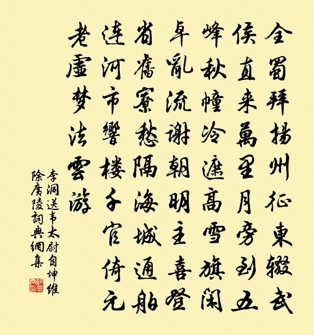詩詞名句歷史字典書法欣賞書法字典國語詞典說文解字康熙字典古漢語字典標 題 作 者 詩 句 送韋太尉自坤維除廣陵作者:李洞 朝代:唐代送韋太尉自坤維除廣陵原文全蜀拜揚州,征東輟武侯。直來萬里月,旁到五峰秋。幢冷遮高雪,旗閒卓亂流。謝朝明主喜,登省舊寮愁。隔海城通舶,連河市響樓。千官倚元老,虛夢法雲遊。詩詞問答問:送韋太尉自坤維除廣陵的作者是誰?答:李洞問:送韋太尉自坤維除廣陵寫於哪個朝代?答:唐代問:送韋太尉自坤維除廣陵是什麼體裁?答:五排李洞送韋太尉自坤維除廣陵書法欣賞送韋太尉自坤維除廣陵書法作品注釋全唐詩:卷722-50詩詞推薦思齊化士釋崇岳〔宋代〕拔劍紅塵斬萬機,直教佛祖浪頭低。我儂贏得呵呵笑,老倒思賢愧不齊。偈頌十九首釋紹曇〔宋代〕千丈岩頭太險生,無端更掘陷人坑。深深疊石防頹岸,要汝臨崖撒手行。寄雷澤張從道石介〔宋代〕不知有凍死,一室心恬如。臘盡妻未褐,天寒了讀書。澆風與世薄,古道於時疏。事事皆同我,憶君春草初。數花風(別義興諸友)張炎〔宋代〕好遊人老,秋鬢蘆花共色。征衣猶戀去年客。古道依然黃葉。誰家蕭瑟。自笑我、如何是得。酒樓仍在,流落天涯魏鴻禧敘別二首袁甫〔宋代〕世間萬事盡筌蹄,塵外工夫好者希。大道精通元自在,旁門淺陋謾多岐。六年鐵治勞經畫,九轉金丹默受持。歸去和楊龍圖獐猿屏蔡襄〔宋代〕畫莫難於工寫生,獐猿移得上幽屏。相逢平野初驚顧,共向薰風適性靈。引子晝游新草綠,嘯群時望故山青。可憐挽疊山先生洪光基〔宋代〕千古精忠日月光,恨無麟筆寫堂堂。遷家恥作梁江總,辟穀誰知韓子房。死後十年應有待,輕生萬里故非狂。有兒【雙調】清江引_春光荏苒如劉時中〔元代〕春光荏苒如夢蝶,春去繁華歇。風雨兩無情,庭院三更夜,明日落紅多去也。水調歌頭(再用前韻)吳潛〔宋代〕天宇正高爽,更躡最高樓。長風為我驅駕,極目海山頭。不用牛山孟浩,不用齊山杜牧,人景自堪酬。舉酒酹空闊此君室方蒙仲〔宋代〕泛菊秋始佳,愛蓮夏方娛。不如交此君,清興無時無。和抱瓮馮提學二首何夢桂〔宋代〕吁嗟世事落黃間,倦矣人間行路難。流水隨鍾子樂老,仙舟徒羨李膺觀。從來豪傑為時出,到底功名耐久看。大廈奉和九月九日登慈恩寺浮圖應制辛替否〔唐代〕洪慈均動植,至德俯深玄。出豫從初地,登高適梵天。白雲飛御藻,慧日暖皇編。別有秋原藿,長傾雨露緣。十日菊鄭谷〔唐代〕節去蜂愁蝶不知,曉庭還繞折殘枝。自緣今日人心別,未必秋香一夜衰。不食仙姑山房張籍〔唐代〕寂寂花枝里,草堂唯素琴。因山曾改眼,見客不言心。月出溪路靜,鶴鳴雲樹深。丹砂如可學,便欲住幽林。藍溪閒居陳洎〔宋代〕白鹿原東虎候西,結廬岑寂映藍溪。露侵僧履蘭三逕,春入農歌雨一犁。聒枕溜聲疑水宿,拂檐山色類岩棲。閉門遣心四首蘇泂〔宋代〕西風颯颯動蒿萊,江上蘆花似雪開。甚喜茅齋清睡熟,卻憂邊面有塵來。覽柏中允兼子侄數人除官制詞因述父子兄弟四美載歌絲綸杜甫〔唐代〕紛然喪亂際,見此忠孝門。蜀中寇亦甚,柏氏功彌存。深誠補王室,戮力自元昆。三止錦江沸,獨清玉壘昏。高名詠陶淵明顏真卿〔唐代〕張良思報韓,龔勝恥事新。狙擊不肯就,捨生悲縉紳。嗚呼陶淵明,奕葉為晉臣。自以公相後,每懷宗國屯。題詩寄王明叔提乾孫應時〔宋代〕我去日以遠,君留誰與居。難忘疇昔意,故有聖賢書。窗幾深瀟灑,塵埃痛掃除。入官紛萬事,濠上有游魚。早秋湖上顧逢〔宋代〕藕花香里去,獨步自尋詩。秋意在何處,夕陽將下時。鳥幽忘立久,山好覺行遲。飲興忽然動,橋邊有酒旗。名句推薦持志如心痛。一心在痛,人安有工夫說閒語,管閒事王陽明《傳習錄·卷上·門人薛侃錄》 秋霜切玉劍,落日明珠袍李白《白馬篇》 雪紛紛,掩重門,不由人不斷魂,瘦損江梅韻。關漢卿《大德歌·冬》 離歌且莫翻新闋。一曲能教腸寸結。歐陽修《玉樓春·尊前擬把歸期說》 鳥飛千白點,日沒半紅輪。白居易《彭蠡湖晚歸》 更把玉鞭雲外指,斷腸春色在江南。韋莊《古離別》 綠池落盡紅蕖卻,荷葉猶開最小錢。楊萬里《秋涼晚步》 知而弗為,莫如勿知;親而弗信,莫如勿親。佚名《孔子家語·子路初見》 被酒莫驚春睡重,賭書消得潑茶香,當時只道是尋常。納蘭性德《浣溪沙·誰念西風獨自涼》 兩處春光同日盡,居人思客客思家。白居易《望驛台》