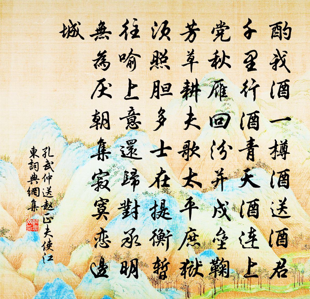 詩詞名句歷史字典書法欣賞書法字典國語詞典說文解字康熙字典古漢語字典標 題 作 者 詩 句 送趙正夫使江東作者:孔武仲 朝代:宋代送趙正夫使江東原文酌我酒一樽酒,送酒君千里行酒。青天酒連上黨,秋雁回汾並。戍壘鞠芳草,耕夫歌太平。庶獄須照膽,多士在提衡。暫往喻上意,還歸對承明。無為厭朝集,寂寞戀邊城。詩詞問答問:送趙正夫使江東的作者是誰?答:孔武仲問:送趙正夫使江東寫於哪個朝代?答:宋代孔武仲送趙正夫使江東書法欣賞送趙正夫使江東書法作品詩詞推薦寄題殊公禪老黃雲閣二首強至〔宋代〕大士當年密行成,山居黃色有雲生。黃雲已共斯人去,飛閣猶為此地名。欲到塵埃先擺落,縱觀氣象亦崢嶸。誰雲喜遇劉二十八偶書兩韻聯句裴度〔唐代〕病來佳興少,老去舊遊稀。笑語縱橫作,杯觴絡繹飛。 ——裴度清談如水玉,逸韻貫珠璣。高位立春日曉望三素雲李季何〔唐代〕靄靄青春曙,飛仙駕五雲。浮輪初縹緲,承蓋下氤氳。薄影隨風度,殊容向日分。羽毛紛共遠,環珮杳猶聞。靜合踏莎行李朝卿〔宋代〕月掛瓊鉤,日添繡線。騎花翻浪重簾卷。風傳環珮曉珊珊,畫堂羯鼓催開宴。翠縷香凝,玉膏酒灩。仙翁莫訴玻璃游鼓山靈源洞蔡襄〔宋代〕郡樓瞻東方,嵐光瑩人目。乘舟逐早潮,十里登南麓。雲深翳前路,樹暗迷幽谷。朝雞亂木魚,晏日明金屋。靈泉豐年行周弼〔宋代〕長田一畝三石收,截茅作囤遮水牛。馴雞塞籠彘牢滿,大兒看親女上頭。里胥關門罷輸送,晴烏窺檐鼠沿棟。瓦盆桂飄香(元名花心動)曹冠〔宋代〕律應清商,嫩涼生、金風乍飄林葉。玉兔騰精,光浸樓台,宛似廣寒宮闕。遠山橫翠煙霏斂,鵲枝繞、蛩聲淒切。東溪張耒〔宋代〕東溪何潺潺,秋水清見底。縱橫小石圓,一一靜無滓。空山人不到,漍漍響環佩。我來每終日,漱濯弄清泚。山居今朝秋氣蕭瑟不意海棠再開因書二絕期如事者程敦厚〔宋代〕露濕燕脂淚臉寒,獨將幽恨倚闌乾。精神不比籬邊菊,莫把尋常醉眼看。有所思何應龍〔宋代〕曾倚空屏唱柳枝,一聲嬌逐暮雲低。重來只見流鶯在,立盡斜陽不肯啼。野意陸游〔宋代〕久忝明恩返故鄉,全家衣食出耕桑。詩才適意寧求好?醉即成眠不暇狂。小雨荷鉏分藥品,乍涼扶杖看優場。此身送嚴大夫赴桂州白居易〔唐代〕地壓坤方重,官兼憲府雄。桂林無瘴氣,柏署有清風。山水衙門外,旌旗艛艓中。大夫應絕席,詩酒與誰同?黃陵題詠二首林采〔宋代〕地接熊湘尾,天開龍壽山。精藍依石峽,遠岫點菸鬟。青草渺茫外,黃陵顧盼間。攀緣尋古蹟,足倦不知還。滿庭芳(八月十六日醴陵作)袁去華〔宋代〕雨送涼來,風將雲去,晚天千頃玻璃。嬋娟依舊,出海較些遲。玉兔秋毫可數,疏星外、烏鵲南飛。今何夕,空浮八寶妝劉燾〔宋代〕門掩黃昏,畫堂人寂,暮雨乍收殘暑。簾卷疏星門戶悄,隱隱嚴城鐘鼓。空街煙暝半開,斜日朦朧,銀河澄淡風淒南湖春泛有客自北至說友人岑元…敘相思之志以寄焉皎然〔唐代〕故人隔楚水,日夕望芳洲。春草思眇眇,征雲暮悠悠。心期無形影,跡曠成阻修。有客江上至,知君佐雄州。鏗鏘河李嶠〔唐代〕源出崑崙中,長波接漢空。桃花來馬頰,竹箭入龍宮。德水千年變,榮光五色通。若披蘭葉檢,□□□□□。宿山觀趙汝鐩〔宋代〕昏暮無處宿,樵人指路頭。僕夫皆已困,道士幸相留。明月夜翻晝,陰崖暑變秋。聞雞便行路,定要到潭州。孫秀才下第暫還京口留別起居邀余和以贈行范祖禹〔宋代〕翔鸞戢翼下層空,南浦歸帆逐曉風。夢寐蘭陔清露白,嘯歌江國火雲紅。王畿結綬來無久,天漢乘槎去可通。莫為和金沙蔣文海韻仇遠〔宋代〕乾祿非良圖,好遯實素抱。昔為駕壑松,今作出山草。茫茫海岳隔,冉冉齒髮老。淵時書甲子,拾遺歷天寶。迷塗名句推薦執子之手,與子偕老。詩經《擊鼓》 布衣得暖真為福,千金平安即是春。佚名《增廣賢文·下集》 孤雁不飲啄,飛鳴聲念群。杜甫《孤雁 / 後飛雁》 畫船兒天邊至,酒旗兒風外颭。張養浩《水仙子·詠江南》 樂極生悲,否極泰來。施耐庵《水滸傳·第二十六回》 求財恨不多,財多害自己。佚名《增廣賢文·上集》 草鋪橫野六七里,笛弄晚風三四聲。呂岩《牧童》 平沙芳草渡頭村。綠遍去年痕。洪咨夔《眼兒媚·平沙芳草渡頭村》 跨馬出郊時極目,不堪人事日蕭條杜甫《野望》 上有流思人,懷舊望歸客。謝朓《送江水曹還遠館》
