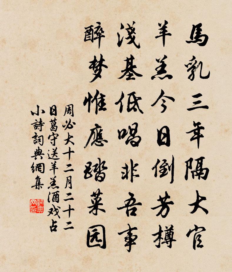 詩詞名句歷史字典書法欣賞書法字典國語詞典說文解字康熙字典古漢語字典標 題 作 者 詩 句 十二月二十二日葛守送羊羔酒戲占小詩作者:周必大 朝代:宋代原文馬乳三年隔大官,羊羔今日倒芳樽。淺基低唱非吾事,醉夢惟應踏菜園。詩詞問答問:《十二月二十二日葛守送羊羔酒戲占小詩》的作者是誰?答:周必大問:該詩寫於哪個朝代?答:宋代書法欣賞十二月二十二日葛守送羊羔酒戲占小詩書法作品詩詞推薦華州客舍奉和崔端公春城曉望耿湋〔唐代〕不語看芳徑,悲春懶獨行。向人微月在,報雨早霞生。貧病催年齒,風塵掩姓名。賴逢驄馬客,郢曲緩羈情。上欽成皇后冊寶六首真宗〔宋代〕天維興思,有要於內。右賢去邪,夙夜儆牙。猗歟追冊,重翟社衣。既右享之,百世是主。雜詠一百首阿承女劉克莊〔宋代〕古人重言德,初不論傾城。切莫傷容鬢,猶堪嫁孔明。八月十六夜與宗哲純甫翫月強至〔宋代〕結客城東樓,明月初出海。漸如水精盤,天宇無寸靄。清光如何買,厥價珠百琲。中秋一夕過,已覺人意改。冰輪山亭避暑真山民〔宋代〕怕礙清風入,丁寧莫下簾。地皆宜避暑,人自要趨炎。竹色水千頃,松聲風四檐。此中有幽致,多取未傷廉。玉樓春(大石)周邦彥〔宋代〕當時攜手城東道。月墮檐牙人睡了。酒邊難使客愁驚,帳底不教春夢到。別來人事如秋草。應有吳霜侵翠葆。夕陽日出東南隅行陸機〔魏晉〕扶桑升朝暉。照此高台端。高台多妖麗。濬房出清顏。淑貌耀皎日。惠心清且閒。美目揚玉澤。蛾眉象翠翰。鮮膚隆州趙善詔〔宋代〕三山高峭拔,鼎峙各爭雄。秀氣鍾英物,衣冠盛蜀中。題贈張道士山居秦系〔唐代〕盤石垂蘿即是家,回頭猶看五枝花。松間寂寂無煙火,應服朝來一片霞。轉調定風波(和答海南統領陳康時)胡銓〔宋代〕從古將軍自有真。引杯看劍坐生春。擾擾介鱗何足掃。談笑。綸巾羽扇典刑新。試問天山何日定。佇聽。雅歌長嘯古風其五十李白〔唐代〕宋國梧台東。野人得燕石。( 以上二句一作宋人枉千金。去國買燕石。)夸作天下珍。卻哂趙王璧。趙璧無緇磷游惠山蘇軾〔宋代〕敲火發山泉,烹茶避林樾。明窗傾紫盞,色味兩奇絕。吾生眠食耳,一飽萬想滅。頗笑玉川子,飢弄三百月。豈如龍花寺主家小尼白居易〔唐代〕頭青眉眼細,十四女沙彌。夜靜雙林怕,春深一食飢。步慵行道困,起晚誦經遲。應似仙人子,花宮未嫁時。呈辛稼軒劉過〔宋代〕精神此老健於虎,紅頰白須雙眼青。未可瓢泉便歸去,要將九鼎重朝廷。京都旅臥曾豐〔宋代〕喜得家書睡不成,擁衾欹枕數寒更,衝風勿板俄驚曉,映日紗窗又報晴。蹀躞過橋朝馬響,咄嗟爭道擔夫聲。利名宴瓊林(上元)黃裳〔宋代〕霜月和銀燈,乍送目樓台,星漢高下。愛東風、已暖綺羅香,競走去來車馬。紅蓮萬斛,開盡處、長安一夜。少年送鄒莆田劉克莊〔宋代〕日日焚香出,天知令尹心。租符環境少,花判入人深。發路惟詩卷,般家亦俸金。極為鄉井惜,不是愴分襟。頌古九首釋梵思〔宋代〕杈下要分生死路,霍山直拔透重關。雖然賺我三千里,瞎卻眾生眼萬千。東陽光化士乞頌釋慧遠〔宋代〕古殿燒殘不記年,冷光相射鬥牛寒。投機會有揮斤手,碧瓦朱甍翠插天。蒼梧雲氣項斯〔唐代〕何年化作愁,漠漠便難收。數點山能遠,平鋪水不流。濕連湘竹暮,濃蓋舜墳秋。亦有思歸客,看來盡白頭。名句推薦思其人,至其鄉;其處在,其人亡。司馬光《資治通鑑·漢紀三十九》 少小雖非投筆吏,論功還欲請長纓。祖詠《望薊門》 兒不嫌母醜,狗不嫌家貧。佚名《增廣賢文·下集》 宴爾新婚,以我御窮。佚名《谷風》 宣父猶能畏後生,丈夫未可輕年少。李白《上李邕》 何嘗見明鏡疲於屢照,清流憚於惠風。劉義慶《世說新語·言語》 一去無訊息,那能惜馬蹄。薛道衡《昔昔鹽》 論至德者不和於俗,成大功者不謀於眾。司馬遷《史記·趙世家》 以地事秦,譬猶抱薪而救火也,薪不盡,則火不止。劉向《戰國策·魏三·華軍之戰》 秋色到空閨,夜掃梧桐葉。夏完淳《卜運算元·秋色到空閨》