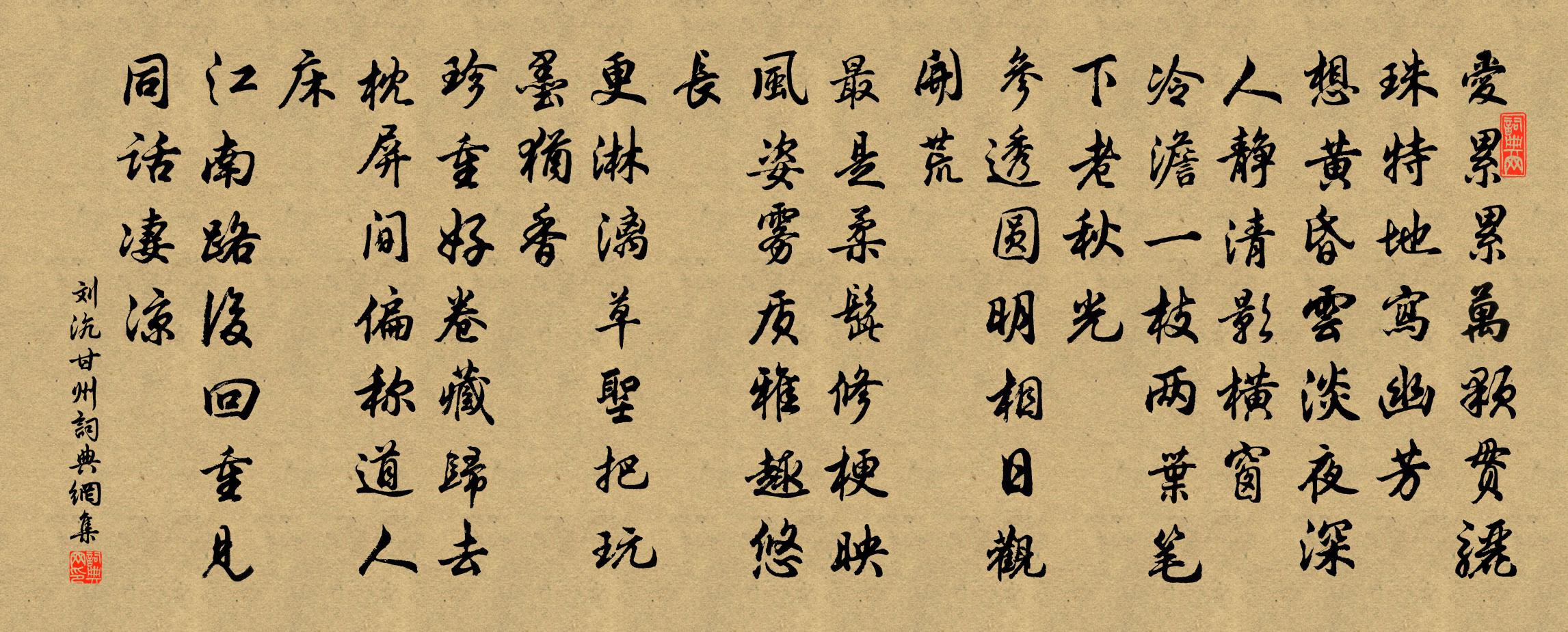 詩詞名句歷史字典書法欣賞書法字典國語詞典說文解字康熙字典古漢語字典標 題 作 者 詩 句 甘州/八聲甘州作者:劉沆 朝代:宋代甘州/八聲甘州原文愛累累、萬顆貫驪珠,特地寫幽芳。想黃昏雲淡,夜深人靜,清影橫窗。冷澹一枝兩葉,筆下老秋光。參透圓明相,日觀開荒。最是柔髭修梗,映風姿霧質,雅趣悠長。更淋漓草聖,把玩墨猶香。珍重好、卷藏歸去,枕屏間、偏稱道人床。江南路,後回重見、同話淒涼。詩詞問答問:甘州/八聲甘州的作者是誰?答:劉沆問:甘州/八聲甘州寫於哪個朝代?答:宋代問:甘州/八聲甘州是什麼體裁?答:詞劉沆甘州/八聲甘州書法欣賞甘州/八聲甘州書法作品詩詞推薦向監稅以前韻見貽復用韻答之趙蕃〔宋代〕鄒陽困游梁,自喻托枯朽。功名彼何能,慷慨終無取。寧知古君臣,義蓋存師友。高謝亦有人,班班推廣受。先師次韻何子應留詩為別王灼〔宋代〕邇跡韓門尚壯年,老陪杖屨本因緣。早知決定書青史,湜籍諸人繼有傳。送友人赴涇州幕一作送李中丞再赴虔州張蠙〔唐代〕杏園沈飲散,榮別就佳招。日月相期盡,山川獨去遙。府樓明蜀雪,關磧轉胡雕。縱有煙塵動,應隨上策銷。中書令程文簡輓辭三首蘇頌〔宋代〕都門簫鼓動哀音,丹旐西歸詔祖臨。故府簪裾空墮淚,高原松檟已成陰。藩朝宣力由忠藎,彝鼎書功映古今。他日甘窮戴復古〔宋代〕自甘寂寞坐詩窮,何取多牛積穀翁。痛飲不孤連夜月,浮生禁得幾秋風。芙蓉媚日紅相對,螃蟹著霜黃在中。白盡次韻四首寄德基兼呈侍郎公李處權〔宋代〕書文車軌幾時同,諸道惟聞羽檄通。豈較北南聊暫寓,若論賢聖且時中。門前楊柳方垂雨,溪上桃花尚舞風。誰見蝶戀花舒亶〔宋代〕深炷熏爐扃小院。手拈黃花,尚覺金猶淺。回首畫堂雙語燕。無情漸漸看人遠。相見爭如初不見。短鬢潘郎,斗覺木蘭花歐陽炯〔唐代〕兒家夫婿心容易,身又不來書不寄。閒庭獨立鳥關關,爭忍拋奴深院裡。悶向綠紗窗下睡,睡又不成愁已至。今年崧高詩為九江趙使君壽楊冠卿〔宋代〕旱既太甚,以祈甘雨。零雨其濛,介我稷黍。和許伯修韻馬廷鸞〔宋代〕秋風孤憤只心知,接得詩筒為色怡。句眼獨參成佛後,吟肩聳徹欲仙時。俗衰競覓胡奴飽,節在何妨臣朔飢。此話王宗起城南溪屋陳某〔宋代〕水上小亭清更新,綠陰紈扇白綸巾。豈無修竹娛佳客,卻有清風來故人。老樹秋聲涼入骨,澄江波影玉生鱗。讀書溪邊吳融〔唐代〕溪邊花滿枝,百鳥帶香飛。下有一白鷺,日斜翹石磯。送李崧才歸閩二首張栻〔宋代〕公事妨開卷,遐征念索居。能來數月款,端為百憂紓。師友洛川上,人才元佑初。歸來有新益,不惜幾行書。春晚寓懷劉兼〔唐代〕一承兌澤蒞方州,八度春光照郡樓。好景幾將官吏醉,名山時領管弦游。空花任爾頻侵眼,老雪從他漸滿頭。歸去夕望江橋示蕭諮議楊建康主簿詩何遜〔南北朝〕夕鳥已西度。殘霞亦半消。風聲動密竹。水影漾長橋。旅人多憂思。寒江復寂寥。爾情深鞏落。予念返漁樵。何因再次韻贈張德恭陳造〔宋代〕同門誰定肯論朋,拙似苕鳩懶似僧。病減不辭詩語拙,歸來少貸客愁凝。老欺鬢髮絲千丈,糴仰官倉日五升。台合復台鄭成功〔明代〕開闢荊榛逐荷夷,十年始克復先基。田橫尚有三千客,茹苦間關不忍離。 陪致政開府太師留守相公致內翰燕集輒歌盛美司馬光〔宋代〕獨佐成康世,高年有畢公。神心降維岳,龜兆告非熊。黃閣遵成范,太常書茂功。歸來保眉壽,恩禮享優隆。江城子·南來飛燕北歸鴻秦觀〔宋代〕南來飛燕北歸鴻。偶相逢。慘愁容。綠鬢朱顏,重見兩衰翁。別後悠悠君莫問,無限事,不言中。小槽春酒滴珠紅春日即事寄一二知己李洞〔唐代〕浴馬池西一帶泉,開門景物似樊川。朱衣映水人歸縣,白羽遺泥鶴上天。索米夜燒風折木,無車春養雪藏鞭。縉紳名句推薦黃河西來決崑崙,咆哮萬里觸龍門。李白《公無渡河》 江上雪,獨立釣漁翁。李綱《望江南·江上雪》 歸志寧無五畝園,讀書本意在元元。陸游《讀書》 浮雲蔽白日,遊子不顧返。佚名《行行重行行》 又爭知、一字相思,不到吟邊。王沂孫《高陽台·殘萼梅酸》 長者梢,深者底。宋濂、王褘《元史·列傳·卷二》 立非常之事,必俟非常之人。令狐德棻《周書·列傳·卷十四》 習讀書之業,便當知讀書之樂王永彬《圍爐夜話·第五五則》 薄衾小枕涼天氣,乍覺別離滋味。柳永《憶帝京·薄衾小枕涼天氣》 不知何日東瀛變,此地還成要路津。劉禹錫《漢壽城春望》