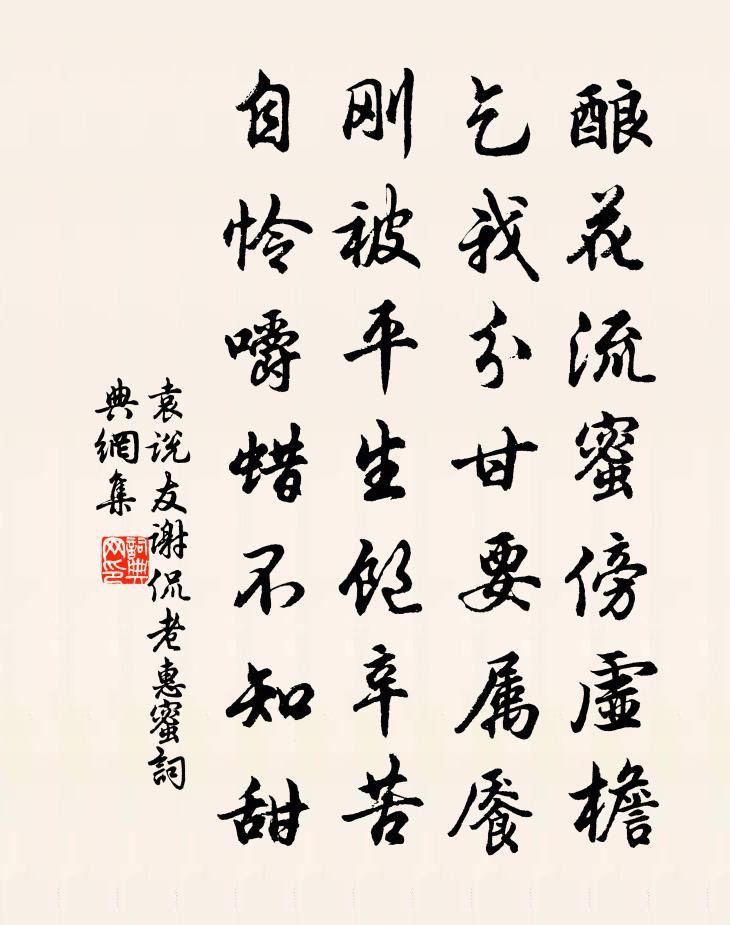 詩詞名句歷史字典書法欣賞書法字典國語詞典說文解字康熙字典古漢語字典標 題 作 者 詩 句 謝侃老惠蜜作者:袁說友 朝代:宋代謝侃老惠蜜原文釀花流蜜傍虛檐,乞我分甘要屬饜。剛被平生飽辛苦,自憐嚼蠟不知甜。詩詞問答問:謝侃老惠蜜的作者是誰?答:袁說友問:謝侃老惠蜜寫於哪個朝代?答:宋代袁說友謝侃老惠蜜書法欣賞謝侃老惠蜜書法作品詩詞推薦水龍吟(次陳君衡見寄韻)周密〔宋代〕燕翎誰寄愁箋,天涯望極王孫草。新煙換柳,光風浮蕙,餘寒尚峭。倚仗看雲,翦燈聽雨,幾番詩酒。嘆長安倦客和安成彭清老五首彭龜年〔宋代〕山有喬松隰有台,胸中日月太平開。安車不入申公念,只恐詔從天上來。三代門夏禹周曇〔唐代〕堯違天孽賴詢謨,頓免洪波浸碧虛。海內生靈微伯禹,盡應隨浪化為魚。贈浮屠道本二首王之道〔宋代〕暑雨初晴江上村,藕花無數午風溫。梁山正帖淮南岸,到得精藍日未昏。紹興以後祀五方帝六十首佚名〔宋代〕[姑洗羽]澹兮撫琴,啾兮吹笙。神之未來,肅穆以聽。綻紛羽旃,姣服在中。神既來止,亦無惰容。鶯鳴十章寄戚伯瑞彭龜年〔宋代〕靜觀物理,式感我思。有風淒兮,吹我裳衣。送日本使還徐凝〔唐代〕絕國將無外,扶桑更有東。來朝逢聖日,歸去及秋風。夜泛潮回際,晨征蒼莽中。鯨波騰水府,蜃氣壯仙宮。天眷漁家傲 舟行自西溪至秦川,荷花一望,百里張翥〔元代〕紅白芙渠千萬朵。水仙恰試新梳裹。縞袂霞衣爭婀娜。香霞墮。凌波忽載行雲過。正好玩芳停畫舸。尊前自唱無人送夔門丁帥赴召崔與之〔宋代〕議論方前席,功名早上坡。去帆瓜蔓水,遺愛生枝歌。同志晨星少,孤愁暮雨多。倚風窮望眼,碧色涉平莎。樂天少傅五月長齋廣延緇徒謝絕文友坐成暌間因以戲之劉禹錫〔唐代〕五月長齋戒,深居絕送迎。不離通德里,便是法王城。舉目皆僧事,全家少俗情。精修無上道,結念未來生。賓閤初夏六首方回〔宋代〕茂密逾千樹,深幽僅一家。新蟬初蛻殼,稚菊始分椏。潤氣青陰石,晴光白濕沙。晚涼督園叟,添竹引籬瓜。監利話知縣見示詩卷項安世〔宋代〕喔君五十四篇詩,燃盡青藜杖一枝。長韻屈平經里思,短章介甫集中辭。只因雲夢曾游耳,便把江山盡得之。割我懷茅山寄句容江大夫劉宰〔宋代〕昔朅三茅君,蹇步窮躋攀。是時秋已高,爽氣薄千山。三峰斂神秀,突兀超塵寰。世變逮狂秦,風俗如髦蠻。舌在對雪效樂天劉過〔宋代〕匣中雷吼一長劍,溪上月明多少舟。無賊可平間李愬,有人不訪倦王猷。銀杯縞帶從渠便,瑤樹瓊林得自由。衣敝《綺疏遺恨》之繡床唐寅〔明代〕月沈花謝事堪傷,春樹紅顏夢短長;只有繡床針線在,殘絨留得口脂香。楊初歸九江宋祁〔宋代〕方領思歸集鸛庭,樵風千里漾舟舲。歌翻桃岸雙飛鵠,夢繞天鄣九疊屏。上苑昔游賦飄雪,故林良友望賢星。遲聞次韻閒中方岳〔宋代〕玲瓏奈轡系絨鞍,付與詩人洗眼看。老子只憑雙腳健,梅花相對一溪寒。吾生焉往不三黜,此樂未央並四難。並與游龍瑞觀楊侃〔宋代〕泛舟秋水一湖平,入觀松風數里清。丹井有泉仙跡在,玉書藏穴禹功成。步虛夜月千峰靜,投簡春霖萬壑盈。述記頌古十二首釋法泰〔宋代〕朝三暮四一何少,暮四朝三何太多。多少未能知數量,有無從此見殽訛。不殽訛,唵囌嚧,{左口右悉}唎薩婆訶次陸務觀韻題姚復之秀才適齋喻良能〔宋代〕姚子神情處處便,床頭周易杖頭錢。逢僧與語閒終日,遣客歸休醉欲眠。應覺此生如寄耳,何妨一室且蕭然。無心名句推薦天下殆哉,岌岌乎。孟子《孟子·萬章章句上·第四節》 織女牽牛送夕陽,臨看不覺鵲橋長。德容《七夕二首·其二》 塞下秋來風景異,衡陽雁去無留意。范仲淹《漁家傲·秋思》 一一書來報故人,我欲因之壯心魄。李白《赤壁歌送別》 少事長,賤事貴,不肖事賢,是天下之通義也。荀子《荀子·仲尼》 誰念文園病客?夜色沉沉,獨抱一天岑寂。張埜《奪錦標·七夕》 見楊柳飛綿滾滾,對桃花醉臉醺醺。王實甫《十二月過堯民歌·別情》 離情被橫笛,吹過亂山東。王安石《江上》 中心愿,平虜保民安國。宋江《滿江紅·喜遇重陽》 對瀟瀟暮雨灑江天,一番洗清秋。柳永《八聲甘州·對瀟瀟暮雨灑江天》