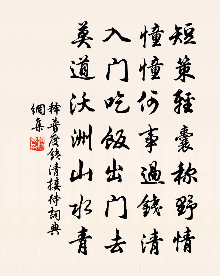 詩詞名句歷史字典書法欣賞書法字典國語詞典說文解字康熙字典古漢語字典標 題 作 者 詩 句 錢清接待作者:釋普度 朝代:宋代錢清接待原文短策輕囊稱野情,憧憧何事過錢清。入門吃飯出門去,莫道沃洲山水青。詩詞問答問:錢清接待的作者是誰?答:釋普度問:錢清接待寫於哪個朝代?答:宋代釋普度錢清接待書法欣賞錢清接待書法作品詩詞推薦憶秦娥 楊山居湖舫新成,載酒落之,賦張雨〔元代〕蘭舟小。一篷也便容身了。容身了。幾番煙雨,幾番昏曉。出橋三面青山繞。入城一向紅塵擾。紅塵擾。綠蓑青笠讀莊子一受其成形不忘以待盡釋擇崇〔宋代〕人生悉如此,誰悟此中玄。白日無私照,青山任意眠。松風來不斷,泉石自相便。路出千峰上,雲歸竹徑邊。句釋曉瑩〔宋代〕江雲黯黯作愁陰。歲暮舟次荊州呈李堯俞馮時行〔宋代〕肅霜聞渡雁,湖海發歸舡。煙樹開吳澤,風帆盡楚天。經過成往事,信宿是明年。詩句隨元禮,雲山共一天。讀尹師魯集強至〔宋代〕章句橫行古道堙,先生筆力障頹津。高文簡得春秋法,大體嚴如劍佩臣。冰鐵剛顏低獄吏,雲風壯略疏邊人。謫官秋思陸游〔宋代〕雁陣橫空送早寒,白頭病叟住江乾。風林脫葉山容瘦,霜稻登場野色寬。萬里關河驚契闊,一尊鄰曲話悲歡。書生頌古十八首釋寶印〔宋代〕應口曹源一滴時,誰知依樣畫貓兒。袖中三尺龍泉劍,落盡髑髏人不知。閏月七日織女王灣〔唐代〕耿耿曙河微,神仙此夜稀。今年七月閏,應得兩回歸。雜詩二十七首曹勛〔宋代〕雲際翻風斷雁斜,城陰盤暮噪棲鴉。春容落景寒猶嫩,望盡遙天數縷霞。題武關杜牧〔唐代〕碧溪留我武關東,一笑懷王跡自窮。鄭袖嬌嬈酣似醉,屈原憔悴去如蓬。山牆谷塹依然在,弱吐強吞盡已空。今日南征怨曹鄴〔唐代〕萬浪東不回,昭王南征早。龍舟沒何處,獨樹江上老。吾欲問水濱,宮殿已生草。頌古一○一首釋子淳〔宋代〕這邊那圉總難逢,一句無私不處中。紅日暮沉西嶂外,空留孤影照溪東。讀詩楊萬里〔宋代〕船中活計只詩編,讀了唐詩讀半山。不是老夫朝不食,半山絕句當朝餐。江亭鄧深〔宋代〕村舍隨山遠,沙寮傍岸還。輕煙魚復浦,殘雪手巾山。小桃紅馬致遠〔元代〕畫堂春暖繡幃重,寶篆香微動。此外虛名要何用?醉鄉中,東風喚醒梨花夢。主人愛客,尋常迎送,鸚鵡在金籠。官舍夙興陸游〔宋代〕朝陽淡淡掛窗欞,桐葉無風忽自零。不復扶頭傾白墮,但知臨目養黃寧。新蔬帶露來幽圃,修綆飛泉灑廣庭。一出江城子(黃子由少監同內子慧齊奉岳母定齊相遇,席間因走筆次韻)張鎡〔宋代〕試霜池面淺粼粼。鵲飛晴。遠峰明。蓬島群仙,來過瑞雲清。龍榜當年人第一,黃叔度,是前生。玉堂行見演絲綸偈呂生〔宋代〕六十年來此地居,靈台光耀勝冰壺。一朝破屋遂傾倒,且喜家中事事無。玉樓春(大石·第三)周邦彥〔宋代〕玉奩收起新妝了。鬢畔斜枝紅裊裊。淺顰輕笑百般宜,試著春衫猶更好。裁金簇翠天機巧。不稱野人簪破帽。滿頭食魚江水邊趙文〔宋代〕食魚江水邊,投骨江水中。眾魚逐其腴,踴躍以相從。所得僅濡沫,滿意如游龍。焉知此棄骨,與爾類本同。人間名句推薦天際兩蛾凝黛,愁與恨、幾時極。韓元吉《霜天曉角·題採石蛾眉亭》 疑怪昨宵春夢好,元是今朝鬥草贏晏殊《破陣子·春景》 握手一長嘆,淚為生別滋蘇武《留別妻》 北郭清溪一帶流,紅橋風物眼中秋,綠楊城郭是揚州。王士禎《浣溪沙·紅橋》 哀莫大於心死。莊子《莊子·外篇·田子方》 少年俠氣,交結五都雄。賀鑄《六州歌頭·少年俠氣》 其水,用山水上,江水中,井水下。陸羽《茶經·五之煮》 敗莫大於不自知。呂不韋《呂氏春秋·論·不苟論》 父子竭力山成玉,弟兄同心土變金。佚名《增廣賢文·下集》 北方有佳人,絕世而獨立。李延年《李延年歌》