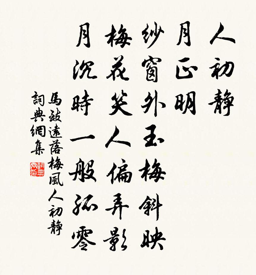 詩詞名句歷史字典書法欣賞書法字典國語詞典說文解字康熙字典古漢語字典標 題 作 者 詩 句 落梅風·人初靜作者:馬致遠 朝代:元代落梅風·人初靜原文人初靜,月正明。紗窗外玉梅斜映。梅花笑人偏弄影,月沉時一般孤零。詩詞問答問:落梅風·人初靜的作者是誰?答:馬致遠問:落梅風·人初靜寫於哪個朝代?答:元代問:落梅風·人初靜是什麼體裁?答:散曲問:馬致遠的名句有哪些?答:馬致遠名句大全馬致遠落梅風·人初靜書法欣賞落梅風·人初靜書法作品譯文和注釋譯文人剛剛靜下來,月色正是明亮的時候。白梅花枝斑駁地斜映在紗窗上。梅花偏偏弄影戲笑人,夜深了月亮沉落,庭院裡一樣淒涼孤零的景象。注釋玉梅:白梅。弄影:化用宋張先《天仙子》詞句“雲破月來花弄影”句意。標籤:寫花,月亮,抒情詩詞推薦鷓鴣天·桂花李清照〔宋代〕暗淡輕黃體性柔。情疏跡遠只香留。何須淺碧深紅色,自是花中第一流。梅定妒,菊應羞。畫闌開處冠中秋。騷人水調歌頭·淮陰作朱敦儒〔宋代〕當年五陵下,結客占春遊。紅纓翠帶,談笑跋馬水西頭。落日經過桃葉,不管插花歸去,小袖挽人留。換酒春壺碧哨遍(春詞)蘇軾〔宋代〕睡起畫堂,銀蒜押簾,珠幕雲垂地。初雨歇,洗出碧羅天,正溶溶養花天氣。一霎暖風回芳草,榮光浮動,掩皺銀【雙調】殿前歡_秋日湖上倚張可久〔元代〕秋日湖上倚吟篷,障西風十里錦芙蓉。照滄浪似入桃源桐,欠個漁翁。冰泉瀉翠筒,玉液浮銀瓮,羅袖擎金鳳。團水仙子·詠江南張養浩〔元代〕一江煙水照晴嵐,兩岸人家接畫檐。菱荷叢一船秋光淡。看沙毆舞再三,卷香風十里珠簾。畫船兒天邊至,酒旗兒度關山曹操〔魏晉〕天地間,人為貴。立君牧民,為之軌則。車轍馬跡,經緯四極。黜陟幽明,黎庶繁息。於鑠賢聖,總統邦域。封建夢江南·千萬恨溫庭筠〔唐代〕千萬恨,恨極在天涯。山月不知心裡事,水風空落眼前花,搖曳碧雲斜。好事近 夢中作秦觀〔宋代〕春路雨添花,花動一山春色。行到小溪深處,有黃鸝千百。飛雲當面化龍蛇,夭驕轉空碧。醉臥古藤陰下,了不知終南別業 / 初至山中 / 入山寄城中故人王維〔唐代〕中歲頗好道,晚家南山陲。興來每獨往,勝事空自知。行到水窮處,坐看雲起時。偶然值林叟,談笑無還期。風入松張炎〔宋代〕危樓古鏡影猶寒。倒景忽相看。桃花不識東西晉,想如今、也夢邯鄲。縹緲神仙海上,飄零圖畫人間。寶光丹氣共好了歌曹雪芹〔清代〕世人都曉神仙好,惟有功名忘不了!古今將相在何方?荒冢一堆草沒了,世人都曉神仙好,只有金銀忘不了!終朝烏夜啼·石榴劉鉉〔宋代〕垂楊影里殘紅。甚匆匆。只有榴花、全不怨東風。暮雨急。曉鴉濕。綠玲瓏。比似茜裙初染、一般同。西江夜行張九齡〔唐代〕遙夜人何在,澄潭月里行。悠悠天宇曠,切切故鄉情。外物寂無擾,中流澹自清。念歸林葉換,愁坐露華生。猶有題畫蘭鄭燮〔清代〕身在千山頂上頭,突岩深縫妙香稠。非無腳下浮雲鬧,來不相知去不留。題柳溫庭筠〔唐代〕楊柳千條拂面絲,綠煙金穗不勝吹。香隨靜婉歌塵起,影伴嬌嬈舞袖垂。羌管一聲何處曲,流鶯百囀最高枝。千門八月十五夜月二首杜甫〔唐代〕滿月飛明鏡,歸心折大刀。轉蓬行地遠,攀桂仰天高。水路疑霜雪,林棲見羽毛。此時瞻白兔,直欲數秋毫。稍下解語花·上元周邦彥〔宋代〕風消絳蠟,露浥紅蓮,燈市光相射。桂華流瓦。纖雲散,耿耿素娥欲下。衣裳淡雅。看楚女纖腰一把。簫鼓喧,人十一月四日風雨大作二首·其一陸游〔宋代〕風卷江湖雨闇村,四山聲作海濤翻。溪柴火軟蠻氈暖,我與狸奴不出門。怨歌行 長安見內人出嫁,友人令余代為之李白〔唐代〕十五入漢宮,花顏笑春紅。君王選玉色,侍寢金屏中。薦枕嬌夕月,卷衣戀春風。寧知趙飛燕,奪寵恨無窮。沉憂八聲甘州·對瀟瀟暮雨灑江天柳永〔宋代〕對瀟瀟暮雨灑江天,一番洗清秋。漸霜風淒緊,關河冷落,殘照當樓。是處紅衰翠減,苒苒物華休。唯有長江水,名句推薦猿啼客散暮江頭,人自傷心水自流。劉長卿《重送裴郎中貶吉州》 崑崙之高有積雪,蓬萊之遠常遺寒。王令《暑旱苦熱》 奸有益,人皆可為奸;忠致禍,人難為忠。來俊臣《羅織經·察奸卷第八》 村喜禾花實,峰看嶺岫重。趙汝愚《雨後送李將軍還祠偕同寅飲一杯亭》 成人不自在,自在不成人。佚名《增廣賢文·下集》 人之初,性本善。王應麟《三字經·全文》 人煙寒橘柚,秋色老梧桐。李白《秋登宣城謝朓北樓》 無事不登三寶殿馮夢龍《警世通言·卷二十八》 千山鳥飛絕,萬徑人蹤滅。柳宗元《江雪》 佳節清明桃李笑,野田荒冢只生愁。黃庭堅《清明》