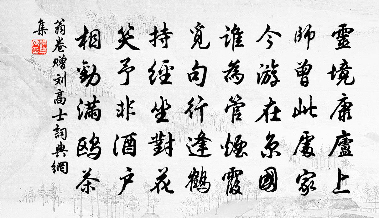 詩詞名句歷史字典書法欣賞書法字典國語詞典說文解字康熙字典古漢語字典標 題 作 者 詩 句 贈劉高士作者:翁卷 朝代:宋代贈劉高士原文靈境康廬上,師曾此處家。今游在京國,誰為管煙霞。覓句行逢鶴,持經坐對花。笑予非酒戶,相勸滿鷗茶。詩詞問答問:贈劉高士的作者是誰?答:翁卷問:贈劉高士寫於哪個朝代?答:宋代翁卷贈劉高士書法欣賞贈劉高士書法作品詩詞推薦偈頌一百二十三首釋崇岳〔宋代〕靈隱開爐,火種全無。將無作有,孰辨精粗。擬議烏藤劈脊摟,從教個個嘴盧都。句晁公武〔宋代〕只言天下少霖雨,不知隆中有臥龍。峨眉古名山,長雄坤之維。月峽為表裹,雪嶺相蔽虧。春日懷王慶長黃公度〔宋代〕夜雨才沾地,朝暉已照牆。潤畦舒菜甲,暖樹拆茶槍。胡虜潛沙磧,關河息戰場。王孫緣底事,萍跡久他鄉。築室劉子翬〔宋代〕旋剪荊榛出舊蹊,架岩鑿壁啟幽棲。已通鄰圃盡栽竹,更搭飛橋南過溪。蓮社昔夸廬阜勝,漁舟空向武陵迷。宦遊齊天樂 蟬周密〔宋代〕槐薰忽送清商怨,依稀正聞還歇。故苑愁深,危弦調苦,前夢蛻痕枯葉。傷情念別。是幾度斜陽,幾回殘月。轉眼十二峰翠屏閻伯敏〔宋代〕秋山黃落春山青,不識仙家雲錦屏。六銖天衣下拂石,香風馥郁朝真亭。書琵琶背李煜〔唐代〕侁自肩如削,難勝數縷絛。天香留鳳尾,余暖在檀槽。新月詩庾信〔南北朝〕鄭環唯半出。秦鉤本獨懸。若交臨酒影。堪言照弩弦。游古寺蔡槃〔宋代〕山煙寒日暝,鴟殿與雲齊。松鼠下階走,竹雞當戶啼。碑荒文字古,僧老語音低。欲往應無計,斜陽照杖藜。杜工部詩有送弟觀歸藍田迎新婦二首偶與縣尉陳著〔宋代〕扇手笑終在,琴心曲暗留。相期星戶夕,莫負月娥秋。金瀨遲揚旆,藍橋趣問稻米。定將先入夢,驂鳳繞簫樓。題畫廿四首唐寅〔明代〕紅樹青山飛白雲,驂驔鞍馬踏斜曛。眼前景好詩難勝,煉不成詞惱剎人。九日廣陵登高懷邵二先輩歐陽詹〔唐代〕簪萸泛菊俯平阡,飲過三杯卻惘然。十歲此辰同醉友,登高各處已三年。懷古愚兄丘葵〔宋代〕紫帽之峰兮高且崷,白雲一片兮空悠悠。我有兄兮在海陬,三月不見兮使人心憂。雪竇游志鄧牧〔元代〕歲癸已春暮,余游甬東,聞雪竇游勝最諸山,往觀焉。 廿四日,由石湖登舟,二十五里下北曳堰達江。江行同王夢得夜坐張鎡〔宋代〕何處起香雲,清談我與君。雨來臨水坐,魚躍隔窗聞。答王虞卿邀游山劉宰〔宋代〕墨池催勝游,虞卿枉真跡。我行浩無期,君歸定何日。非尤年歲晚,自嘆機會失。空煩日卓午,蔬飯滿香積。游熙六年端午帖子詞皇帝合六首崔敦詩〔宋代〕避暑深宮消永晝,函風廣殿起涼秋。宸心未愜高明適,志在山東二百州。送曹子方奉使閩中孔武仲〔宋代〕聞說乘軺美,全□勝赴□。先聲馳嶺海,和氣入山川。路束籃輿過,書憑塞雁傳。祝君求荈草,醒我北窗眠。冬晚山房書事陸游〔宋代〕山澤何妨老太平,巉巉骨相本來清。月明滿地看梅影,露下隔溪聞鶴聲。未辨藥苗逢客問,欲酬琴價約僧評。胡奴新亭風玉與安素相應錢時〔宋代〕的然同德定同聲,鼓瑟吹竽盡未平。懸玉兩窗非有約,如何風動一齊鳴。名句推薦柳外斜陽,水邊歸鳥,隴上吹喬木。辛棄疾《念奴嬌·登建康賞心亭呈史致道留守》 誰忍窺河漢,迢迢問鬥牛。孟浩然《他鄉七夕》 言者異,則人心變矣。劉向《戰國策·趙三·秦攻趙於長平》 只有一枝梧葉,不知多少秋聲。張炎《清平樂·候蛩淒斷》 九月九日眺山川,歸心歸望積風煙。盧照鄰《九月九日玄武山旅眺》 大曰逝,逝曰遠,遠曰反。老子《老子·道經·第二十五章》 何時倚虛幌,雙照淚痕乾。杜甫《月夜》 長恨春歸無覓處,不知轉入此中來。白居易《大林寺桃花》 低頭獨長嘆,此嘆無人喻。白居易《買花 / 牡丹》 屏卻相思,近來知道都無益。王國維《點絳唇·屏卻相思》