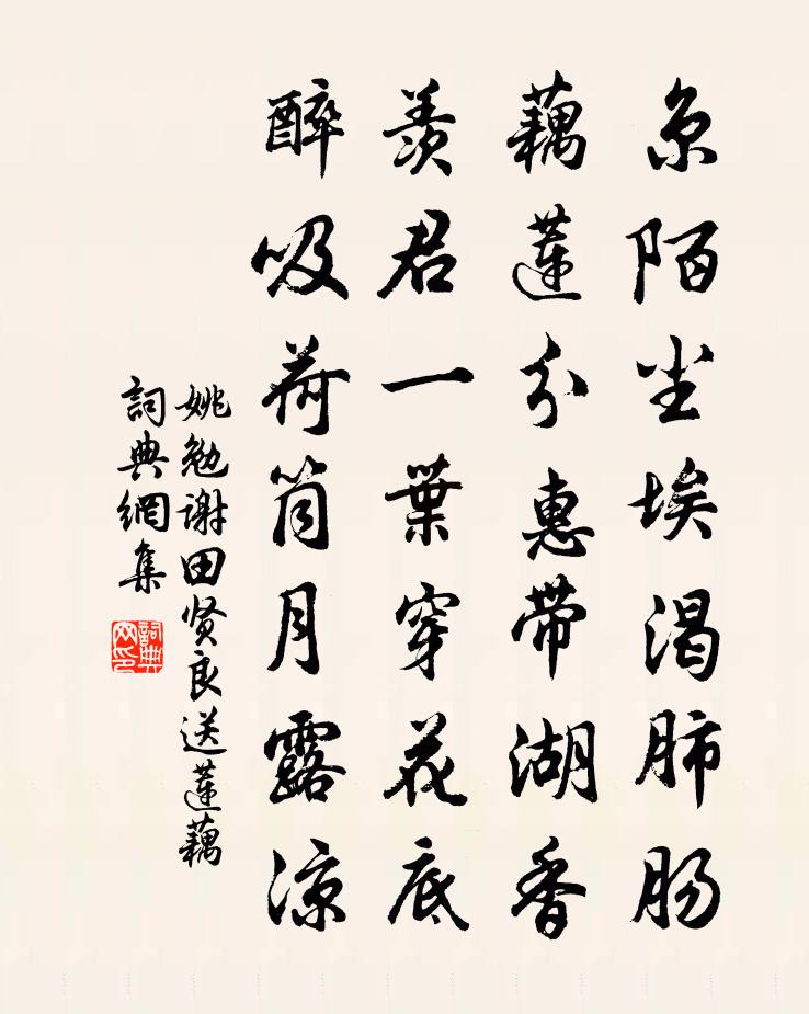詩詞名句歷史字典書法欣賞書法字典國語詞典說文解字康熙字典古漢語字典標 題 作 者 詩 句 謝田賢良送蓮藕作者:姚勉 朝代:宋代謝田賢良送蓮藕原文京陌塵埃渴肺腸,藕蓮分惠帶湖香。羨君一葉穿花底,醉吸荷筒月露涼。詩詞問答問:謝田賢良送蓮藕的作者是誰?答:姚勉問:謝田賢良送蓮藕寫於哪個朝代?答:宋代姚勉謝田賢良送蓮藕書法欣賞謝田賢良送蓮藕書法作品詩詞推薦題參政樓公二圓相圖釋法薰〔宋代〕皎然書平定字,攻愧寫二圓相,引得多少平人望雲上樹。且喜兩沒交涉,要知的實,卻須親見石田。和鮑守次韻林德祖十四首傅察〔宋代〕半刺同流寄未輕,勤勞每念離鄉亭。高懷不羨貂蟬貴,麗句還酬玉案青。字買千金休擇筆,才兼三絕好書屏。獨慚春日(一作初春)王績〔唐代〕前旦出園游,林華都未有。今朝下堂來,池冰開已久。雪被南軒梅,風催北庭柳。遙呼灶前妾,卻報機中婦。年光黃州第七文天祥〔宋代〕桓桓陳將軍,東屯大江北。化作虎與豺,楚星南天黑。意難忘(代贈)高觀國〔宋代〕仙子奇容。是名花第一,美占春風。煙香籠淺翠,露靚浥芳紅。憐舞燕,惜驚鴻。想獨步吳宮。料認得、嬌雲媚雨送蔡德輝教授三首周必大〔宋代〕幾回送客大江頭,今渡江頭特地愁。豈是陽關動悽怨,同僚情分正綢繆。江上遇友人許棠〔唐代〕闕下分離日,杏園花半開。江邊相值夜,榆塞雁初來。坐久河沉斗,吟長月浸杯。鱸魚非不戀,共有客程催。詩酒王禹偁〔宋代〕白頭郎吏合歸耕,猶戀君恩典郡城。已覺功名乖素志,祗憑詩酒送浮生。剛腸減後微微諷,病眼昏來細細傾。樽杓宿法華寺簡靈澈上人皎然〔唐代〕至道無機但杳冥,孤燈寒竹自青熒。不知何處小乘客,一夜風來聞誦經。奉和聖制同二相已下群官樂遊園宴趙冬曦〔唐代〕爽塏三秦地,芳華二月初。酺承奠璧罷,宴是合錢餘。柳翠垂堪結,桃紅卷欲舒。從容會鵷鷺,延曼戲龍魚。喜氣水調歌頭 時楊溪避兵舒頔〔元代〕飽來石上臥,醉向水邊吟。山靈不管閒事,容我盡登臨。山外猿啼鶴唳,世上虎爭狼斗,此地白雲深。今古一杯土送洞霄宮王文玉學士歸吳蘇頌〔宋代〕仙都補吏向天涯,歸棹南遊事事嘉。冬課洞庭千戶橘,春嘗石縫一槍茶。蓬山厭直拋鉛摘,公府傷離念棣華。二紀喜遷鶯·曉月墜李煜〔五代〕曉月墜,宿雲微,無語枕頻欹。夢回芳草思依依,天遠雁聲稀。啼鶯散,餘花亂,寂寞畫堂深院。片紅休掃盡從伊轉調踏莎行(上巳道中作)陳亮〔宋代〕洛浦塵生,巫山夢斷。旗亭菸草里,春深淺。梨花落盡,荼又綻。天氣也似,尋常庭院。向晚情懷,十分惱亂。水送呂義甫李流謙〔宋代〕河伯矜秋浸,望洋始一嘆。是以太史公,身行天下半。可憐據坎者,寸尺盡霄漢。我友故英發,驤首輕皂機。結束趙制使宴吳宣參致語口號方岳〔宋代〕二老風襟了不群,笑談自可卻塵氛。詞臣舊奏平淮頌,里老今傳諭蜀文。吳國隱然如一敵,趙邊足以張三軍。英辭潘妃曲·帶月披星擔驚怕商挺〔元代〕帶月披星擔驚怕,久立紗窗下,等候他。驀聽得門外地皮兒踏,則道是冤家,原來風動荼蘼架。已亥雜詩 182龔自珍〔清代〕秋風張翰計蹉跎,紅豆年年擲逝波。誤我歸期知幾許,蟾圓十一度無多。鷓鴣天郭應祥〔宋代〕依約灘聲雜櫓聲。波光隱映月華明。眼前好景真無盡,身外浮名盡可輕。窮勝賞,續歡盟。直饒風雨也須晴。滿頭和秦壽之春晚偶成八絕王之道〔宋代〕春來談笑數追陪,多謝傳杯不放杯。醉里狂言應可笑,問春歸去幾時回。名句推薦望時而待之,孰與應時而使之。荀子《荀子·天論》 一點烽傳散關信,兩行雁帶杜陵秋。陸游《秋晚登城北樓》 晚歲登門最不才,蕭蕭華發映金罍蘇洵《九日和韓魏公》 是親不是親,非親卻是親。佚名《增廣賢文·上集》 歸志寧無五畝園,讀書本意在元元。陸游《讀書》 朝聞道,夕死可矣。孔子弟子《論語·里仁篇》 君看蕭蕭只數葉,滿堂風雨不勝寒。李東陽《柯敬仲墨竹》 寒禽與衰草,處處伴愁顏。司空曙《賊平後送人北歸》 憶君心似西江水,日夜東流無歇時。魚玄機《江陵愁望寄子安》 常山臨代郡,亭障繞黃河。王褒《渡河北》