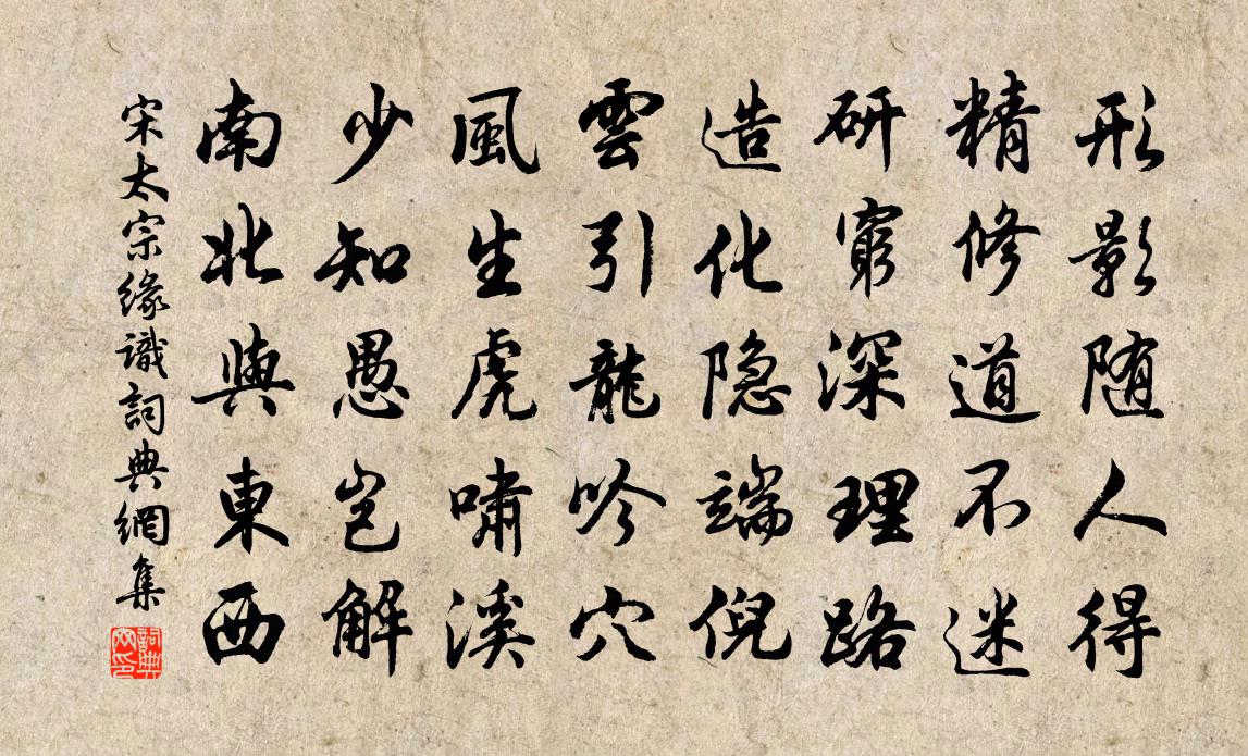 詩詞名句歷史字典書法欣賞書法字典國語詞典說文解字康熙字典古漢語字典標 題 作 者 詩 句 緣識作者:宋太宗 朝代:宋代緣識原文形影隨人得,精修道不迷。研窮深理路,造化隱端倪。雲引龍吟穴,風生虎嘯溪。少知愚豈解,南北與東西。詩詞問答問:緣識的作者是誰?答:宋太宗問:緣識寫於哪個朝代?答:宋代宋太宗緣識書法欣賞緣識書法作品詩詞推薦懷仙吟白玉蟾〔宋代〕我懷仙兮神仙侶,霞裾搖曳兮居何所。見鶴長吟猶可覆,蓬萊果在半步許。空留寶墨落人間,字句成行秋雁序。正梅花十絕句趙蕃〔宋代〕桃李紛紛倚市門,豈知幽谷有佳人。莫嗟一粒終無偶,人物誰知溫太真。偈頌一百三十六首釋惟一〔宋代〕晝也惺惺,夜也惺惺。既不掉舉,亦不昏沉。何須求白玉,只此是黃金。早發斜溝道中寄王有元賀鑄〔宋代〕處處春林有鳥啼,恨無芳酒一樽攜。何緣復得彭城夢,日日東風送我西。春曉晚眺吳琪〔清代〕積雨經旬鶴未過,小樓閒眺費吟喔。簾開燕子歸來晚,門掩梨花落處多。新水小橋通蕙畹,亂山古寺入煙夢。雲開夢梅趙時韶〔宋代〕夢醒春風笑一場,攬衣推枕起思量。草塘夢句有何好,夢到梅花字字香。公度以余嘗語洛中花品而此邦之人多不敢言花梅堯臣〔宋代〕去年三月來吳中,欲擬看花無與從。今年二月花偏早,發作無節雨與風。前時晴明要尋賞,謂夸洛陽多不容。我心西湖林洪〔宋代〕煙生楊柳一痕月,雨弄荷花數點秋。此景此時摹不盡,畫船歸去有漁舟。望京館王珪〔唐代〕一從絕漠返朱輪,便有東風逐去塵。和氣旋成燕谷暖,使華重照蘇門新。山川如避中原執,天地應酣上國春。二月壽許侯楊公遠〔宋代〕星輝南極彩雲邊,律轉黃鐘一日前。河嶽間生賢太守,樁松齊算老神仙。心猶秋月燭千里,人在春風度兩年。只恐聽杜將軍帳下兒歌仇遠〔宋代〕什什伍伍金人降,將軍忍殺令歸鄉。歸時說與汝郎長,納土封汝異姓王。無題蘇泂〔宋代〕夢到巫山起較遲,花梢日在不多時。關心自對空梁語,一個飛來燕子知。下章安杜瀆七首姚寬〔宋代〕石柱山前煙在川,金鵝浦口浪黏天。北人淒斷南人笑,愁水愁風最可憐。次韻酬杜材卿張鎡〔宋代〕樓寒鶴骨舊竛竮,別後溪山夢不扃。世事益知推去好,鬢毛渾減向來青。詩篇又見聲諧律,才興何疑刃照硎。愁里百一詩 一應璩〔魏晉〕下流不可處。君子慎厥初。名高不宿著。易用受侵誣。前者隳官去。有人適我閭。田家無所有。酌醴焚枯魚。問我次韻和楊伯子主簿見贈陸游〔宋代〕齋戒書叩頭牋天書公,幸矣書使我為枯蓬;枯蓬於世百無用,始得曠快乘秋風。此生安往失貧賤,白髮蕭蕭對黃卷次韻蔣德言壁間舊題樓鑰〔宋代〕一鈴檐角自吟風,兩面松篁翠掃空。山卉更藏無盡意,枝頭未作去年紅。答潞城令谷大同李復〔宋代〕蕭條寒邑古風深,應嘆光陰恨陸沉。莫厭荒山輕廩粟,須思美政慰民心。門連露草常封印,吏散秋堂靜試琴。欲約柳絮二絕洪咨夔〔宋代〕造化勿忘還勿助,精神非色亦非空。殘雲初雪雍容甚,高下東風點亂紅。秦娥劉駕〔唐代〕秦娥十四五,面白於指爪。羞人夜採桑,驚起戴勝鳥。名句推薦東面望者不見西牆,南鄉視者不睹北方呂不韋《呂氏春秋·覽·有始覽》 梅定妒,菊應羞。畫闌開處冠中秋。李清照《鷓鴣天·桂花》 兩岸桃花烘日出,四圍高柳到天垂。姜彧《浣溪沙·山滴嵐光水拍堤》 路逢險處須迴避,事到臨頭不自由。佚名《增廣賢文·上集》 老翁逾牆走,老婦出門看。杜甫《石壕吏》 富貴本無根,盡從勤里得。馮夢龍《醒世恆言·卷三十五》 春風不解禁楊花,濛濛亂撲行人面。晏殊《踏莎行·小徑紅稀》 騎牛遠遠過前村,短笛橫吹隔隴聞。黃庭堅《牧童詩》 聽風聽雨過清明。愁草瘞花銘。吳文英《風入松·聽風聽雨過清明》 林中有奇鳥,自言是鳳凰。阮籍《詠懷八十二首·其七十九》