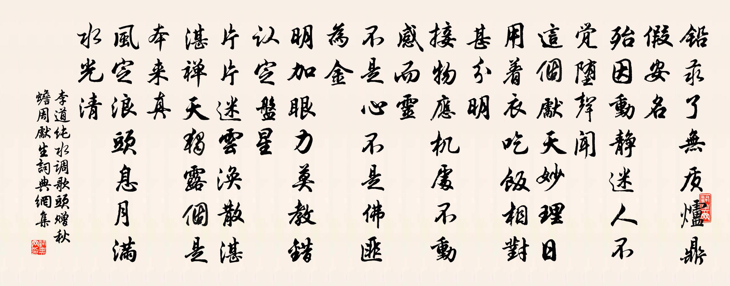 詩詞名句歷史字典書法欣賞書法字典國語詞典說文解字康熙字典古漢語字典標 題 作 者 詩 句 水調歌頭 贈秋蟾周先生作者:李道純 朝代:元代水調歌頭 贈秋蟾周先生原文鉛汞了無質,爐鼎假安名。殆因動靜迷人,不覺墮聲聞。這個先天妙理,日用著衣吃飯,相對甚分明。接物應機處,不動感而靈。不是心,不是佛,匪為金。明加眼力,莫教錯認定盤星。片片迷雲渙散,湛湛禪天獨露,個是本來真。風定浪頭息,月滿水光清。詩詞問答問:水調歌頭 贈秋蟾周先生的作者是誰?答:李道純問:水調歌頭 贈秋蟾周先生寫於哪個朝代?答:元代問:水調歌頭 贈秋蟾周先生是什麼體裁?答:詞李道純水調歌頭 贈秋蟾周先生書法欣賞水調歌頭 贈秋蟾周先生書法作品詩詞推薦思故人邵雍〔宋代〕芳酒一樽雖甚滿,故人千里奈思何。柳挼池閣條偏細,花近檐楹香更多。閩人謠佚名〔唐代〕風吹楊菜鼓山下,不得錢郎戈不罷。張君明昆仲袖唱和詩見過章甫〔宋代〕村東主客群飛鴻,月明霜重聲摩空。村西老人如瘦馬,伏櫪倦嘶天北風。村東村西無百步,杖履相尋還有數。兒啼題芭蕉趙蕃〔宋代〕卷藏政爾待時雨,及此發舒天已秋。已是蕭蕭吹我急,主人寧得厭颼颼。偈頌二十四首釋智遇〔宋代〕春入湖山,先放花明。御苑人歸上國,南山鶴唳青公。壯皇都人傑地靈,窺紫府洞天風月。七夕苦旱望雨王之道〔宋代〕田禾吐白將就槁,野草垂黃幾欲燃。來日天孫嫁河鼓,洗車今喜有夤緣。題墨妙亭王炎〔宋代〕晉唐行草可同科,樂石雕鐫便不磨。幾載雨淋兼日炙,一朝雲集又星羅。要知訪古搜求盡,應為凝香暇逸多。瀟瀟若耶溪逢陸澧陳羽〔唐代〕溪上春晴聊看竹,誰言驛使此相逢。擔簦躡屐仍多病,笑殺雲間陸士龍。經古觀有感李中〔唐代〕古觀寥寥枕碧溪,偶思前事立殘暉。漆園化蝶名空在,柱史猶龍去不歸。丹井泉枯苔鎖合,醮壇松折鶴來稀。回頭木芙蓉黃庚〔宋代〕芙蓉一帶繞池塘,萬綠叢中簇艷妝。錯認園林春富貴,不知葉底有風霜。鷓鴣天(寄葉仲洽)辛棄疾〔宋代〕是處移花是處開。古今興廢幾池台。背人翠羽偷魚去,抱蕊黃須趁蝶來。掀老瓮,撥新醅。客來且盡兩三杯。日高瀟湘神 零陵作屈大均〔清代〕瀟水流,湘水流,三閭愁接二妃愁。瀟碧湘藍雖兩色,鴛鴦總作一天秋。和王介甫明妃曲二首 / 明妃曲和王介甫作歐陽修〔宋代〕胡人以鞍馬為家,射獵為俗。泉甘草美無常處,鳥驚獸駭爭馳逐。誰將漢女嫁胡兒,風沙無情貌如玉。身行不遇中長郊雨餘遠樹減翠新蟬忽鳴激耳嘹唳久客孤坐寇準〔宋代〕遙山夏雨歇,遠樹涼風至。憑欄偶開襟,新蟬動秋思。沙溪潔細流,庭木驚疏翠。節候又復然,幽憂斯所萃。芳歲天壇歸元稹〔唐代〕為結區中累,因辭洞裡花。還來舊城郭,煙火萬人家。李泌庭黑石詩隱者〔唐代〕神真鍊形年未足,化為我子功相續。丞相瘞之刻玄玉,仙路何長死何促。送玉融周醫劉克莊〔宋代〕苛留孤月伴長庚,無奈殘星欲啟明。曾子數商誠有罪,韓公雲籍未嘗首。病深不早迎秦緩,貲薄將何謝宋清。客問題葛稚川移家圖周弼〔宋代〕稚川移家入空谷,手招白雲守茅屋。惟恐人窺鍊藥鑪,鎖斷青巒瀉垂瀑。只留一徑通飛鳥,其間想透三仙島。野童槐花羅鄴〔唐代〕行宮門外陌銅駝,兩畔分栽此最多。欲到清秋近時節,爭開金蕊向關河。層樓寄恨飄珠箔,駿馬憐香撼玉珂。愁殺潚再往剡中念之尤切作詩寬之樓鑰〔宋代〕剡縣不為遠,丞官勿謂卑。鼓盆知愛重,去國倍行遲。堂上森三老,房中秀一兒。加餐了官事,莫賦悼亡詩。名句推薦弱柳青槐拂地垂,佳氣紅塵暗天起。盧照鄰《長安古意》 言不信者行不果。墨子《墨子·02章 修身》 桃花流水窅然去,別有天地非人間。李白《山中問答》 雨中黃葉樹,燈下白頭人。司空曙《喜外弟盧綸見宿》 養弟子如養閨女,最要嚴出入,謹交遊。洪應明《菜根譚·概論》 器具質而潔,瓦缶勝金玉;飲食約而精,園蔬愈珍饈。朱柏廬《朱子家訓·全文》 都道是金玉良姻,俺只念木石前盟。曹雪芹《終身誤》 東風有信無人見,露微意、柳際花邊。蘇軾《一叢花·今年春淺侵年》 金井梧桐秋葉黃,珠簾不捲夜來霜。王昌齡《長信怨》 塞上長城空自許,鏡中衰鬢已先斑。陸游《書憤五首·其一》