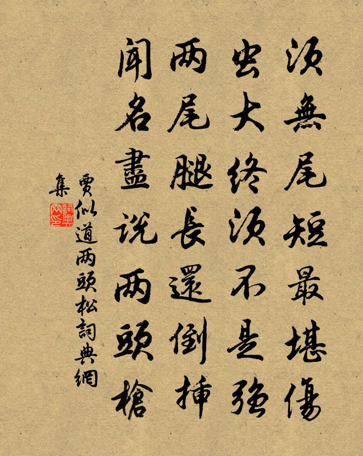 詩詞名句歷史字典書法欣賞書法字典國語詞典說文解字康熙字典古漢語字典標 題 作 者 詩 句 兩頭松作者:賈似道 朝代:宋代兩頭松原文須無尾短最堪傷,蟲大終須不是強。兩尾腿長還倒插,聞名盡說兩頭槍。詩詞問答問:兩頭松的作者是誰?答:賈似道問:兩頭松寫於哪個朝代?答:宋代賈似道兩頭松書法欣賞兩頭松書法作品詩詞推薦去秋芮國器以詩賀入館今渠繼來次韻周必大〔宋代〕一自傳刀夢,遲君已隔秋。浪傳迷弱水,未省礙虛舟。天子方神武,狂胡敢寇讎。應須漢充國,早晚與兵謀。雪中次韻答劉提舉王冕〔元代〕朔風撼天雲黮黮,雪花恰似楊花糝。憑高無以辨青紅,四海九州同一覽。枯腸頗怪酒力薄,勁氣著人寒慘慘。痿痹寄陳伯璣金陵王士禎〔清代〕東風作意吹楊柳,綠到蕪城第幾橋?欲折一枝寄相憶,隔江殘笛雨蕭蕭。惜奴嬌史達祖〔宋代〕香剝酥痕,自昨夜、春愁醒。高情寄、冰橋雪嶺。試約黃昏,便不誤、黃昏信。人靜。倩嬌娥、留連秀影。吟鬢簪句翁宏〔唐代〕因尋買珠客,誤入射猿家。庵中夏釋梵琮〔宋代〕草中得路便藏身,不入他家水牯群。彈指一聲為號令,低頭問訊當殷勤。久雨陸游〔宋代〕風雨連旬日,屢空猶晏如。敢言苔及榻,僅免釜生魚。薺糝朝供缽,松肪夜照書。百生如此過,作計未全疏。相逢行贈別舊友治將軍薩都剌〔元代〕一年相逢在京口,笑解吳鉤換新酒。城南桃杏花正開,白面青衫鞭馬走。一年相逢白下門,短衣窄袖呼郎君。朝馳觀音大士贊釋原妙〔宋代〕大海波心,磐陀石上。真觀淨觀,是相非相。如月在天,無水不現。水月俱捐,如何瞻仰。咄,切忌妄想。入獄第一百四文天祥〔宋代〕徘徊虎穴上,吾道正羈束。落日將何如,清文動哀玉。摸魚兒葛長庚〔宋代〕這身兒、從來業障。一生空自勞攘。生生死死皆如夢,更莫別生妄想。沒伎倆。只管去、天台雁盪尋方廣。幾人不戒五荒金朋說〔宋代〕重色耽沉面,娛音樂侈華。禽荒迷不返,未有不亡家。旅邸睡起白玉蟾〔宋代〕云為山積翠,雨倩草添青。一覺南柯夢,俄然鳥喚醒。河傳趙鼎〔宋代〕秋光向晚。嘆羈游坐見。年華將換。一紙素書,擬托南來征雁。奈雪深、天更遠。東窗皓月今宵滿。淺酌芳尊,暫清河作詩曹丕〔魏晉〕方舟戲長水。湛澹自浮沉。弦歌發中流。悲響有餘音。音聲入君懷。悽愴傷人心。心傷安所念。但願恩情深。願為過臨晉縣適調發李復〔宋代〕半夜驚呼府有府,河壖荒邑應軍須。冰生垂血辭鄉淚,風漲飛塵出塞車。千里饋糧人未返,百丁團甲戶無餘。天邊偈頌一百一十七首釋紹曇〔宋代〕九月授衣天,山林無可授。破衲擁殘雲,痴坐 * 透。長慶棱捲簾悟道,病眼見空花。香林遠紙襖大書,破袖爭出雲岩章謙亨〔宋代〕造化雕鐫巧,真成一洞天。曾將修蟒逐,卻許蟄龍眠。石現金剛足,泉流仙客田。炷香吾道者,色體尚依然。九日偕同寮至破山還飲誓清亭是日上雨尋霽自孫應時〔宋代〕佳節強人意,清樽洗俗愁。乍收桐葉雨,放出菊花秋。眼底山川勝,吟邊草樹幽。西同還正帽,一笑憶荊州。泗上早發許棠〔唐代〕獨起無人見,長河夜泛時。平蕪疑自動,落月似相隨。楚外離空早,關西去已遲。漁歌聞不絕,卻軫洞庭思。名句推薦今何許。憑闌懷古。殘柳參差舞。姜夔《點絳唇·丁未冬過吳松作》 伏屍百萬,流血漂櫓。賈誼《過秦論》 東門之楊,其葉牂牂。佚名《東門之楊》 李白能詩復能酒,我今百杯復千首。唐寅《把酒對月歌》 西湖春色歸,春水綠於染歐陽修《春日西湖寄謝法曹歌》 唯有門前鏡湖水,春風不改舊時波。賀知章《回鄉偶書二首》 老農家貧在山住,耕種山田三四畝。張籍《野老歌 / 山農詞》 士為知己者死,女為悅己者容。劉向《戰國策·趙一·晉畢陽之孫豫讓》 抽刀斷水水更流,舉杯消愁愁更愁。李白《宣州謝朓樓餞別校書叔雲》 夫眾喣漂山,聚蚊成雷班固《漢書·傳·景十三王傳》