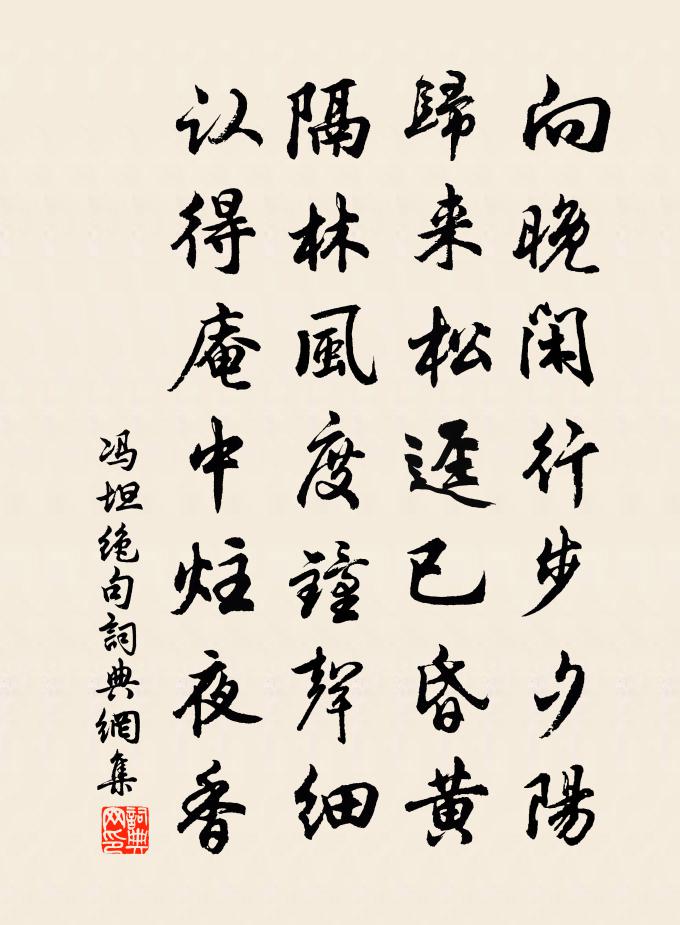 詩詞名句歷史字典書法欣賞書法字典國語詞典說文解字康熙字典古漢語字典標 題 作 者 詩 句 絕句作者:馮坦 朝代:宋代絕句原文向晚閒行步夕陽,歸來松逕已昏黃。隔林風度鐘聲細,認得庵中炷夜香。詩詞問答問:絕句的作者是誰?答:馮坦問:絕句寫於哪個朝代?答:宋代馮坦絕句書法欣賞絕句書法作品詩詞推薦崇聖寺斌公房賈島〔唐代〕近來惟一食,樹下掩禪扉。落日寒山磬,多年壞衲衣。白須長更剃,青靄遠還歸。仍說游南嶽,經行是息機。漁舟文天祥〔宋代〕一陣飛帆破碧煙,兒郎驚餌理弓弦。舟中自信婁師德,海上誰知魯仲連。初謂悠揚真賊艦,後聞欸乃是漁船。人生銅雀妓劉方平〔唐代〕遺令奉君王,嚬蛾強一妝。歲移陵樹色,恩在舞衣香。玉座生秋氣,銅台下夕陽。淚痕沾井幹,舞袖為誰長。省中和何子溫見寄洪咨夔〔宋代〕東風婉娩燕來雙,禁漏無聲萬綠香。寶鴨炷雲朝太紫,玉蜍挹露校鉛黃。聖賢不斷千年脈,宇宙長存一點光。老鶴踏莎行(太易生日)朱敦儒〔宋代〕梅倚江娥,日舒宮線。老人星喚群仙宴。泛杯玉友暖飛浮,堆盤金橘光零亂。聽命寬心,隨緣適願。痴狂贏取身長休沐重還丹陽道中詩謝朓〔南北朝〕薄游第從告。思閒願罷歸。還卬歌賦似。休汝車騎非。灞池不可別。伊川難重違。汀葭稍靡靡。江菼復依依。田鵠晨霜客路曾豐〔宋代〕臥駭窗紗已報明,籃輿札札破霜行。踏開凍淖瓊漿溜,搖動凝梢玉屑傾。山色喜人猶念舊,鳥聲冤客不留情。從今鮑潮州輓詞樓鑰〔宋代〕客授壬辰歲,巍科盛永嘉。芹宮屢揮麈,竹院幾烹茶。假守深交誼,清談及道家。猶懷郡齋晚,群雀噪檐蛇。浣溪沙蘇軾〔宋代〕麻葉層層苘葉光,誰家煮繭一村香。隔籬嬌語絡絲娘。垂白杖藜抬醉眼,捋青搗買麨軟飢腸。問言豆葉幾時黃。何太宰生日二首強至〔宋代〕卻數中秋已過旬,老君親送玉麒麟。力侔二氣文詞重,迥繼諸公德業醇。論道他年要黃髮,看公當世斡洪鈞。泰山雪劉子翬〔宋代〕晚天冥漠霰初飛,皓皓出顏復水湄。莫遣瑤林生染污,卻憂雲路隱巇危。寒侵夜褐樽前覺,春入晴檐枕上知。憶得游楊村仁王院二十韻郭印〔宋代〕山行不作懶,杖策窮幽邃。崎嶇十里餘,乃得桃源地。竹樹蓊以鮮,峰巒秀而媚。嬌雲弄奇姿,啼鳥含幽意。周遭滿庭芳 師父畫骷髏相誘引稍悟馬鈺〔元代〕風仙化我,無限詞章。仍懷猶豫心腸。兒畫骷髏省悟,斷制從長。欲待來年學道,恐今年、不測無常。欲來日,恐真珠亭金君卿〔宋代〕新寺迴廊入翠微,亭前珠樹斗芳菲。寄言游者休披采,還似人懷薏苡歸。夜期嘯客呂逸人不至賈島〔唐代〕逸人期宿石床中,遣我開扉對晚空。不知何處嘯秋月,閒著松門一夜風。李商叟傳錄臨川與黎師侯唱酬懷曾文清公長句趙蕃〔宋代〕嘆息茶山識面遲,經過舊宅恨推移。聽泉尚想甘瓢樂,撫竹如親與物離。千首未多行世集,數篇才刻住山詩。屬君西郊燕集韋應物〔唐代〕濟濟眾君子,高宴及時光。群山靄遐矚,綠野布熙陽。列坐遵曲岸,披襟襲蘭芳。野庖薦嘉魚,激澗泛羽觴。眾鳥六言詩十首 其二嵇康〔兩漢〕唐虞世道治。萬國穆親無事。賢愚各自得志。晏然逸豫內忘。佳哉爾時可憙。見佳人負錢出路鄭世翼〔唐代〕獨負千金價,應從買笑來。只持難發口,經為幾人開。王更不睡朱翌〔宋代〕擂罷城頭鼓,膏凝燭下盤。窗留三尺月,纊挾五更寒。事事華巾結,年年紙帳寬。梅花正好在,青女莫摧殘。名句推薦勿貪意外之財,勿飲過量之酒。朱柏廬《朱子家訓·全文》 欲持一瓢酒,遠慰風雨夕。韋應物《寄全椒山中道士》 沅有芷兮澧有蘭,思公子兮未敢言。屈原《九歌·湘夫人》 重五山村好,榴花忽已繁。陸游《乙卯重五詩》 鐵馬雲雕久絕塵,柳營高壓漢營春。溫庭筠《過五丈原 / 經五丈原》 群芳過後西湖好,狼籍殘紅。歐陽修《採桑子·群芳過後西湖好》 側見雙翠鳥,巢在三珠樹張九齡《感遇十二首·其四》 意少一字則義闕,句長一言則辭妨劉勰《文心雕龍·書記》 曲屏先暖鴛衾慣,夜寒深、都是思量。吳文英《風入松·為友人放琴客賦》 人而無信,不知其可也。大車無輗,小車無軏,其何以行之哉?孔子弟子《論語·為政篇》