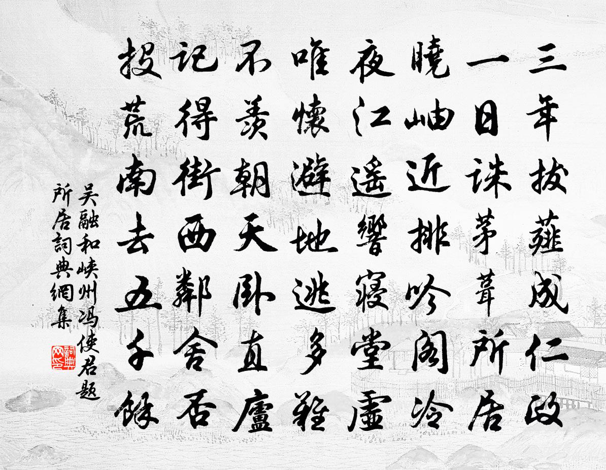詩詞名句歷史字典書法欣賞書法字典國語詞典說文解字康熙字典古漢語字典標 題 作 者 詩 句 和峽州馮使君題所居作者:吳融 朝代:唐代和峽州馮使君題所居原文三年拔薤成仁政,一日誅茅葺所居。曉岫近排吟閣冷,夜江遙響寢堂虛。唯懷避地逃多難,不羨朝天臥直廬。記得街西鄰舍否,投荒南去五千餘。詩詞問答問:和峽州馮使君題所居的作者是誰?答:吳融問:和峽州馮使君題所居寫於哪個朝代?答:唐代問:和峽州馮使君題所居是什麼體裁?答:七律吳融和峽州馮使君題所居書法欣賞和峽州馮使君題所居書法作品注釋全唐詩:卷684-17詩詞推薦新歲七十以人生七十古來稀為韻寄錢大參七首曹勛〔宋代〕未遂歸心如束濕,久客京塵堂汲汲。碧雲向晚愛歸飛,空看五五與十十。滕王閣蘇轍〔宋代〕客從筠溪來,欹仄困一葉,忽逢章貢余,滉盪天水接。風霜出洲渚,草木見毫末。勢奔西山浮,聲動古城嶪。樓觀三禽牟巘五〔宋代〕何處飛來把修竹,數聲圓活夢還驚。雨鳩那解知人意,寂寞梨花雨又晴。淳熙癸卯錢伸東陽本方回〔宋代〕永和貞觀晉沿唐,奉詔臨摹老遂良。展轉流傳非一手,虎賁猶得似中郎。斑竹簟佚名〔宋代〕龍鱗滿床波浪濕,血光點點湘娥泣。一片晴霞凍不飛,深沈盡訝蛟人立。百朵排花蜀纈明,珊瑚枕滑葛衣輕。閒窗周郎橋馬之純〔宋代〕周郎可是世英豪,談笑功成乃不勞。爾大阿瞞猶似此,茲時小笮空應逃。雙鞬錦領紛相逐,白羽青絲各自操。料得句陳堯佐〔宋代〕相逢吟未足。散發一扁舟王安石〔宋代〕散發一扁舟,夜長眠屢起。秋水瀉明河,迢迢藕花底。愛此露的皪,復憐雲綺靡。諒無與歌弦,幽獨亦可喜。贈東塔璵老劉克莊〔宋代〕南寺上人禪學苦,東岡老子法筵開。遙知大設伊蒲供,送汝挑包去撈齋。御街行(和陸判院梅詞)曹勛〔宋代〕凌寒架雪知春近。閒探處、如相問。溪流清淺暮雲低,玉蓓橫斜風定。晚枝雀啅,幽姿方展,還映疏篁冷。鏡鸞妝偈二十七首釋守淨〔宋代〕談玄說妙,撒屎撒尿。行棒行喝,將鹽止渴。立主立賓,花擘宗乘。西陵遇風獻康樂詩 四謝惠連〔南北朝〕屯雲蔽曾嶺。驚風涌飛流。零雨潤墳澤。落雪灑林丘。浮氛晦崖巘。積素惑原疇。曲汜薄停旅。通川絕行舟。官滿趨朝留滯吳門即事書懷十首仲並〔宋代〕枉費花工著意催,漫山桃李總非材。要令千古芬香在,能作和羹自有梅。偈頌二十二首釋道生〔宋代〕三月既望,惠風和暢。龜峰擂鼓升堂,雲集五湖龍象。人人鼻孔遼天,好個西來榜樣。讀梁武帝紀二首孔武仲〔宋代〕破除網紀事虛空,可恨蕭家一老翁。魚爛土崩俱自取,不須侯景到江東。越州歌二十首汪元量〔宋代〕蒼生慟哭入雲霄,內苑瓊林已作樵。打斷六更天未曉,禁庭兩桁籸盤燒。題石窟(寺魏孝文所置)宋昱〔唐代〕梵宇開金地,香龕鑿鐵圍。影中群象動,空里眾靈飛。檐牖籠朱旭,房廊挹翠微。瑞蓮生佛步,瑤樹掛天衣。邀福病中春雨,聞東園花盛楊萬里〔宋代〕萬類欣欣一老悲,物華豈是不佳時。病夫自與春無分,好景非於我獨遺。花底報來開已鬧,雨中過了更曾知。風光和陳天予卜居二首吳芾〔宋代〕我亦初卜築,止有湖與山。一區未易就,首尾 * 。種竹已成林,積水已成淵。我始得棲息,守此桑麻田。羨君句王鎬〔宋代〕籍通上界神仙府,身現甘泉侍從臣。名句推薦燕子歸來愁不語。舊巢無覓處。李好古《謁金門·花過雨》 天行健;君子以自強不息。佚名《易傳·象傳上·乾》 擬借寒潭垂釣,又恐鷗鳥相猜,不肯傍青綸。蘇舜欽《水調歌頭·滄浪亭》 伯牙鼓琴,志在高山佚名《伯牙鼓琴/伯牙絕弦》 有誰知我此時情,枕前淚共階前雨,隔個窗兒滴到明。聶勝瓊《鷓鴣天·別情》 嵩雲秦樹久離居,雙鯉迢迢一紙書。李商隱《寄令狐郎中》 楊柳乍如絲,故園春盡時。納蘭性德《菩薩蠻·問君何事輕離別》 行行重行行,與君生別離。佚名《行行重行行》 一上高城萬里愁,蒹葭楊柳似汀洲。許渾《鹹陽城東樓 / 鹹陽城西樓晚眺 / 西門》 道本足於身,切實求來,則常若不足矣王永彬《圍爐夜話·第一一三則》