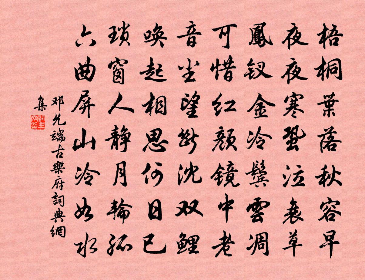 詩詞名句歷史字典書法欣賞書法字典國語詞典說文解字康熙字典古漢語字典標 題 作 者 詩 句 古樂府作者:鄧允端 朝代:宋代古樂府原文梧桐葉落秋容早,夜夜寒蛩泣衰草。鳳釵金冷鬢雲凋,可惜紅顏鏡中老。音塵望斷沈雙鯉,喚起相思何日已。瑣窗人靜月輪孤,六曲屏山冷如水。詩詞問答問:古樂府的作者是誰?答:鄧允端問:古樂府寫於哪個朝代?答:宋代鄧允端古樂府書法欣賞古樂府書法作品詩詞推薦水調歌頭趙長卿〔宋代〕貪痴無了日,人事沒休期。白駒過隙,百歲能得幾多時。自古腰金結綬,著意經營辛苦,回首不勝悲。名未能安穩鵲橋仙王惲〔元代〕調羹粉桂。愛香種蕙。自笑秋風野卉。兩椽茅屋對青山,初不羨、入雲高弟。將心自逸。欲行且憩。如愛清時有味崇德閣下答諸公不語禪邵雍〔宋代〕浩浩長空走日輪,何煩苦苦辯根塵。鵬程萬里非由駕。鶴筭三千別有春。鉛錫點金終屬假,丹青畫馬妄求真。請觀南浦月(寓點絳唇賦瀟湘漁父)張輯〔宋代〕來翦蓴絲,江頭一陣鳴蓑雨。孤篷歸路。吹得苹花暮。短髮蕭蕭,笑與沙鷗語。休歸去。玉龍嘶處。邀月過南浦。頌古八首釋雲〔宋代〕春風有時惡,春風有時好。人競逐春風,卻被春風惱。山居雜詩九十首曹勛〔宋代〕村落辟幽居,深靜頗得趣。白雲棲檐棟,嵐光照窗戶。往還得隱逸,談笑皆舊故。不畏歸路遙,家家響機杼。挽彭制機方岳〔宋代〕山中亦云樂,蔬甲手耘芟。面熟鳥窺戶,眼生雲穴岩。樹蟠根可坐,路礙石休劖。每笑陶弘景,猶將隱結銜。題鄭十八著作虔杜甫〔唐代〕台州地闊海冥冥,雲水長和島嶼青。亂後故人雙別淚,春深逐客一浮萍。酒酣懶舞誰相拽,詩罷能吟不復聽。第五和陶淵明飲酒詩滕岑〔宋代〕秋風入我室,百蟲自相喧。中夜臥不周,起視河河偏。念我平生友,托體歸青山。遊魂往何方,千載不復還。人生題合江亭趙汝鐩〔宋代〕石鼓山頭一小亭,乾坤萬里眼雙明。雖因刺史能尋勝,不遇昌黎豈得名。衡岳雲開秋洗碧,蒸江湘合水爭清。書岩望長安賀鑄〔宋代〕排辦張燈春事早。十二都門。物色宜新曉。金犢車輕玉驄小。拂頭楊柳穿馳道。蓴羹鱸鱠非吾好。去國謳吟,半落過漢南城嘆古墳張說〔唐代〕舊國多陵墓,荒涼無歲年。洶湧蔽平岡,汨若波濤連。上世千金字,潛臥九重泉。松柏剪無餘,碑記滅罔傳。葬於送崇教大師回天台阮思道〔宋代〕碧雲高價徹天涯,珪璧清無一點瑕。雙闕再承新雨露,三吳重賞舊煙霞。水軒散味朝賢句,松院分嘗御府茶。聞說立春日呈彥博並帖審知趙蕃〔宋代〕憶昔少陵身在蜀,遇春曾憶兩京梅。我今久隔鄉關念,病後徒驚節物催。不見過門長者轍,可憐到手故人杯。長亭琴曲歌辭。蔡氏五弄。遊春曲二首王涯〔唐代〕萬樹江邊杏,新開一夜風。滿園深淺色,照在綠波中。上苑何窮樹,花開次第新。香車與絲騎,風靜亦生塵。留題微之廨中清輝閣王安石〔宋代〕故人名字在瀛洲,邂逅低徊向此留。鷗鳥一雙隨坐嘯,荷花十丈對冥搜。水涵樽俎清如洗,山染衣巾翠欲流。宣室去年五月十七廬山禱而雨嘗有詩今年五月十七方岳〔宋代〕浪漫東西不自期,此公猶有鬼神知。江閩易地誰為崇,晴雨在天皆及時。年熟且從犀首飲,宦情聊付虎頭痴。舉杯挽尤尚書二首彭龜年〔宋代〕天子青宮友,清時法從賢。典型諸老舊,人物中興前。鎖闥堆黃紙,金華疊細旃。奪公何太速,誰與問蒼天。西子妝慢/西子妝吳文英〔宋代〕流水麴塵,艷陽醅酒,畫舸游情如霧。笑拈芳草不知名,乍凌波、斷橋西堍。垂楊漫舞。總不解、將春系住。燕歸三月李明府後亭泛舟(一作皇甫冉詩)劉長卿〔唐代〕江南風景復如何,聞道新亭更欲過。處處紉蘭春浦淥,萋萋籍草遠山多。壺觴須就陶彭澤,時俗猶傳晉永和。更待名句推薦人患志之不立,亦何憂令名不彰邪?劉義慶《世說新語·自新》 猶有遺簪,不展秋心,能卷幾多炎熱。張炎《疏影·詠荷葉》 不要人夸好顏色,只留清氣滿乾坤。王冕《墨梅》 倚竹不勝愁,暗想江頭歸路王之道《如夢令·一晌凝情無語》 樹陰滿地日當午,夢覺流鶯時一聲。蘇舜欽《夏意》 舉目山河異,偏傷周顗情。李白《金陵新亭》 出塞入塞寒,處處黃蘆草。王昌齡《塞下曲四首》 車轔轔,馬蕭蕭,行人弓箭各在腰。杜甫《兵車行》 夢裡相思,故國王孫路。陳子龍《點絳唇·春日風雨有感》 清晨入古寺,初日照高林。常建《題破山寺後禪院》