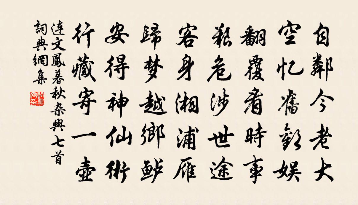詩詞名句歷史字典書法欣賞書法字典國語詞典說文解字康熙字典古漢語字典標 題 作 者 詩 句 暮秋雜興七首作者:連文鳳 朝代:宋代暮秋雜興七首原文自鄰今老大,空憶舊歡娛。翻覆看時事,艱危涉世途。客身湘浦雁,歸夢越鄉鱸。安得神仙術,行藏寄一壺。詩詞問答問:暮秋雜興七首的作者是誰?答:連文鳳問:暮秋雜興七首寫於哪個朝代?答:宋代連文鳳暮秋雜興七首書法欣賞暮秋雜興七首書法作品詩詞推薦三峽橋錢聞詩〔宋代〕生平有志在山水,得紱此邦非偶爾。行行白鹿書院來,小輿竹逕松陰里。輕雷急鼓山前聞,飛梁截截水下噴。有如得周詩云方為秘府書石渠二字作詩美之王洋〔宋代〕斡地排天力有餘,倚空金榜稱華胥。快兼長史三杯酒,優重中郎六體書。字向雲門增瑞彩,思從天陛聽傳臚。集賢次韻元晦擇之雪中見懷張栻〔宋代〕流水浩無息,游雲去不休。我思在何許,起步三徑幽。男子四方誌,胡為守一丘。盍簪未可期,此意空綢繆。平生和宋永四兄集句黃公度〔宋代〕時事干戈里,年光卷帙中。有懷憂社稷,無力靖華戎。世路日多梗。齋扉晝掩蓬。悲歌撫長鋏,爽颯氣摩空。木蘭花慢(題上饒郡圃翠微樓)辛棄疾〔宋代〕舊時樓上客,愛把酒、向南山。笑白髮如今,天教放浪,來往其間。登樓更誰念我,卻回頭、西北望層欄。雲雨珠重過列子廟追感頃年自淮服與居守王僕射…四韻奉寄李德裕〔唐代〕白首過遺廟,朱輪入故城。已慚聯左揆,猶喜抗前旌。曳履忘年舊,彈冠久要情。重看題壁處,豈羨棄繻生。大衍易吟四十首方回〔宋代〕易乃一量秤,銖銖分重輕。百千億萬事,義理是權衡。送張環攝御史監南選孫逖〔唐代〕漢使得張綱,威名攝遠方。恩沾柱下史,榮比選曹郎。江帶黔中闊,山連峽水長。莫愁炎暑地,秋至有嚴霜。九吟詩吳昌裔〔宋代〕蒼松翠石束寒流,飛下長身白玉虬。吐出英雲千尺雨,須臾雷霽水痕收。酬李文(一作汶)耿湋〔唐代〕落照長楊苑,秋天渭水濱。初飛萬木葉,又長一年人。貧病仍為客,艱虞更問津。多慚惠然意,今日肯相親。臥牛石陳岩〔宋代〕石犀沉後波濤息,石燕飛時風雨來。堪笑石牛徒解臥,山田無數任蒿萊。蘆葦江八詠祠堂議禮羅仲舒〔宋代〕春秋思報本,忠孝原有祠。儀物修孔時,擊鼓吹豳詩。滿路花譚處端〔元代〕上無三瓦舍,下沒一犁田。水雲真活計、且隨緣。街前展手,化個有緣前。獨步歸來晚,萬里晴空,臥聽虎嘯啼猿題西溪無相院張先〔宋代〕積水涵虛上下清,幾家門靜岸痕平。浮萍 * 見山影,小艇歸時聞棹聲。入郭僧尋塵里去,過橋人似鑒中行。已憑謝仙遊許宰伯詡立續題名記招飲二首記乃崇清王邁〔宋代〕栽花次第滿河陽,誰結寒根桃李場。鰲在三山驚贔屭,鳧飛雙舄費揄揚。春風折屐緣聞捷,臘雪開筵重借光。他日徐郎廟楊時〔宋代〕古廟靈場枕碧巔,松楸依約鎖風煙。羽毛一去無訊息,墮落人間幾百年。有感十首吳芾〔宋代〕洛邑塵氛暗不開,百年宮殿總成灰。柏城晝日風蕭瑟,不見朝陵敕使來。和林肅翁有所思韻劉克莊〔宋代〕少豪曾挾一筇游,晚似龐公怕入州。橡栗尚煩天賦粟,茅柴如以水澆愁。何妨范史書鉤黨,不願歐碑說解仇。自古宿齋太一宮即事五首宋庠〔宋代〕蹇產通天百尺台,歲祠三一羽旗開。臥聞野雉宮前雊,應有神光壇上來。送王汲宰藍田歐陽修〔宋代〕喧喧動車馬,共出古都門。落日催行客,東風吹酒◇。樹搖秦甸綠,花入輞川繁。若遇西來旅,時應問故園。名句推薦日暖泥融雪半消,行人芳草馬聲驕。杜牧《宣州送裴坦判官往舒州時牧欲赴官歸京》 大道之行也,天下為公。戴聖《禮記·禮運》 四海十年兵不解,胡塵直到江城。陳克《臨江仙·四海十年兵不解》 怠慢忘身,禍災乃作。荀子《荀子·勸學》 飄零疏酒盞,離別寬衣帶。秦觀《千秋歲·水邊沙外》 明月淨松林,千峰同一色。歐陽修《自菩提步月歸廣化寺》 諸侯之寶三:土地、人民、政事。寶珠玉者,殃必及身。孟子《孟子·盡心章句下·第二十八節》 贈遠虛盈手,傷離適斷腸。李商隱《十一月中旬至扶風界見梅花》 白髮戴花君莫笑,六么催拍盞頻傳。歐陽修《浣溪沙·堤上遊人逐畫船》 王粲登臨寥落際。雁飛不斷天連水。王庭筠《鳳棲梧·衰柳疏疏苔滿地》